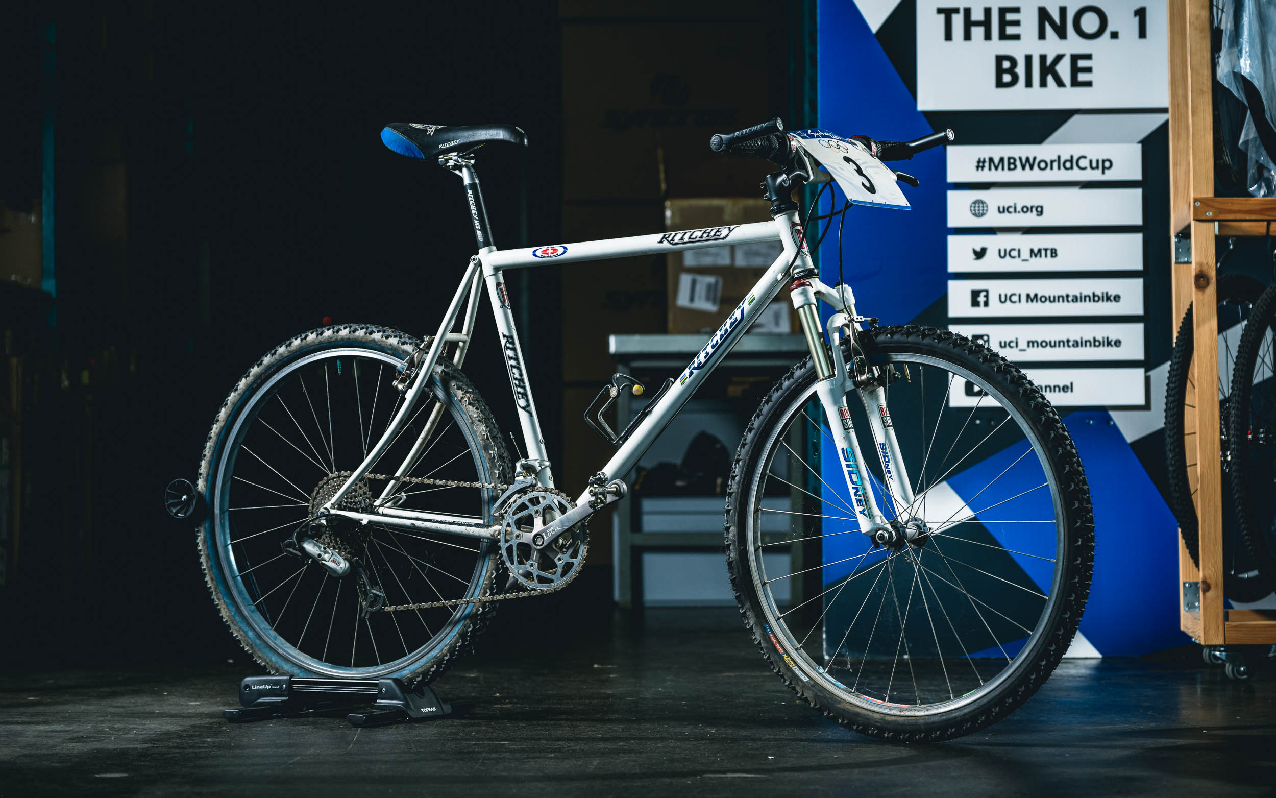 Avant de nous lancer dans les vélos de Nino Schurter, Yanick tient à nous montrer deux des rares vélos que Frischi a conservés de sa riche carrière. Rappelons qu’il est toujours 3e au classement du plus grand nombre de victoires en coupe du monde XC hommes derrière Nino Schurter et Julien Absalon (33) avec pas moins de 17 succès ! Pourtant, ce n’est pas un vélo victorieux en coupe du monde qu’il nous sort de son chapeau, mais le Ritchey Plexus roulé par son « boss » aux Jeux Olympiques de Sydney en 2000, où il a décroché la 6e place.
