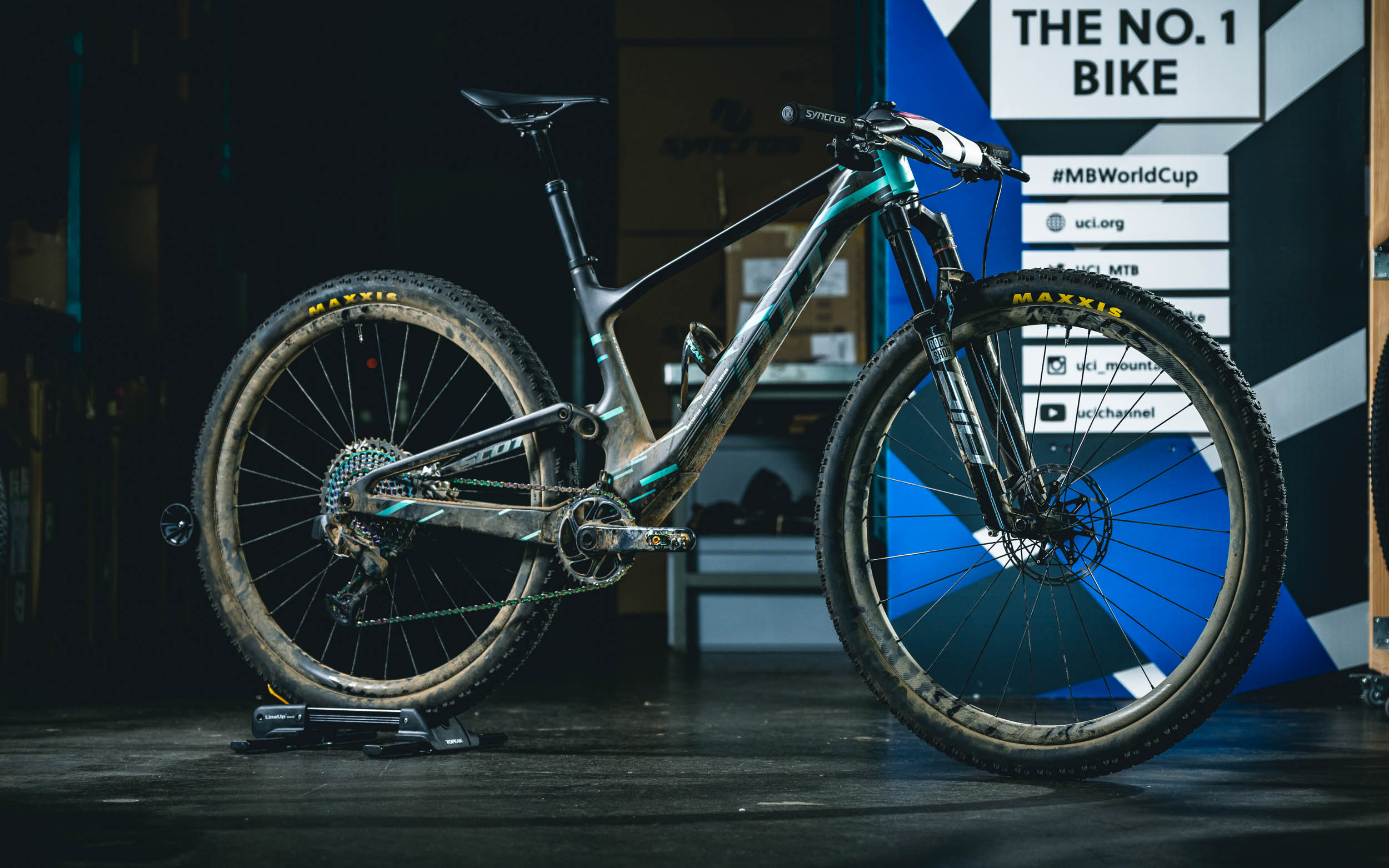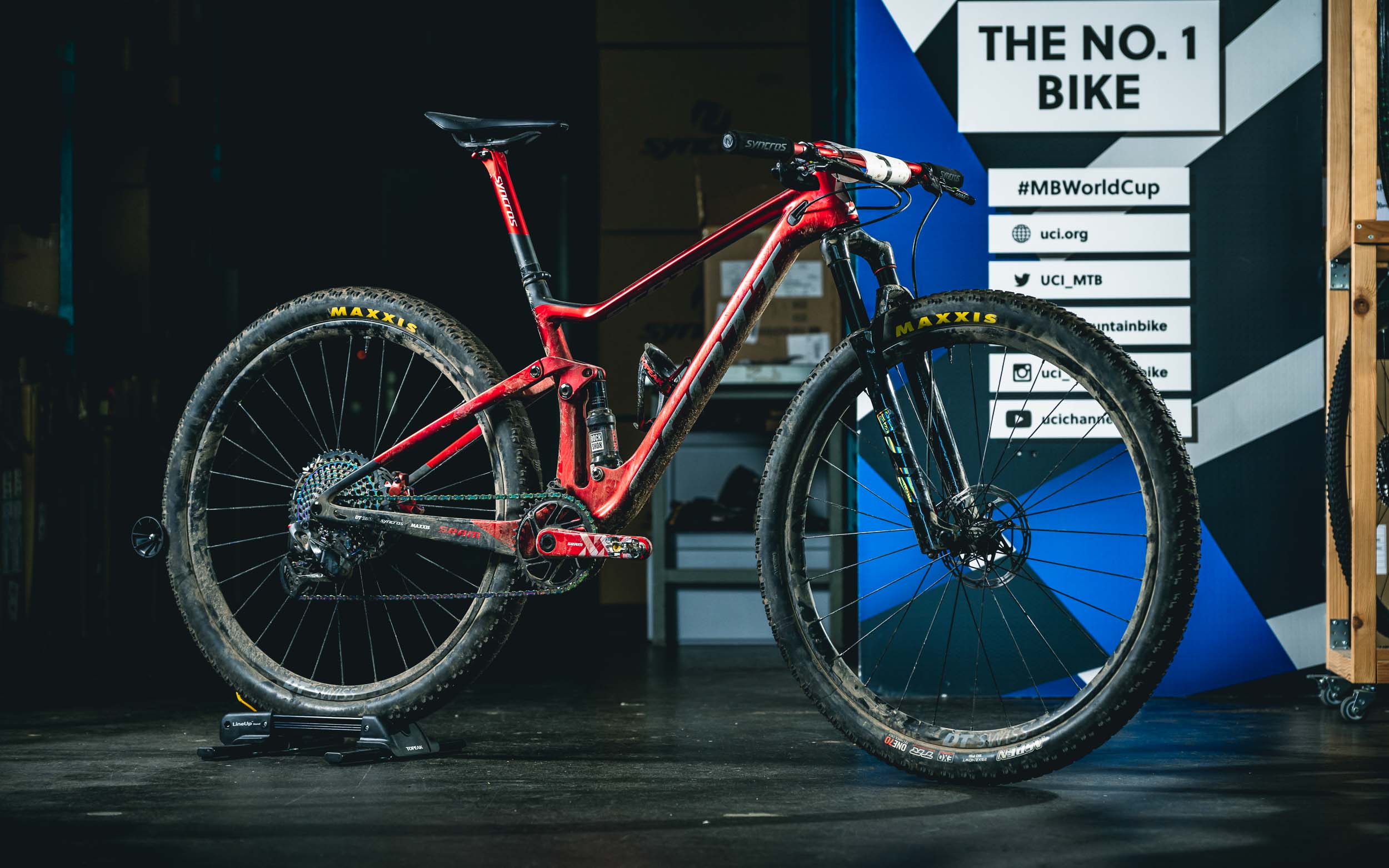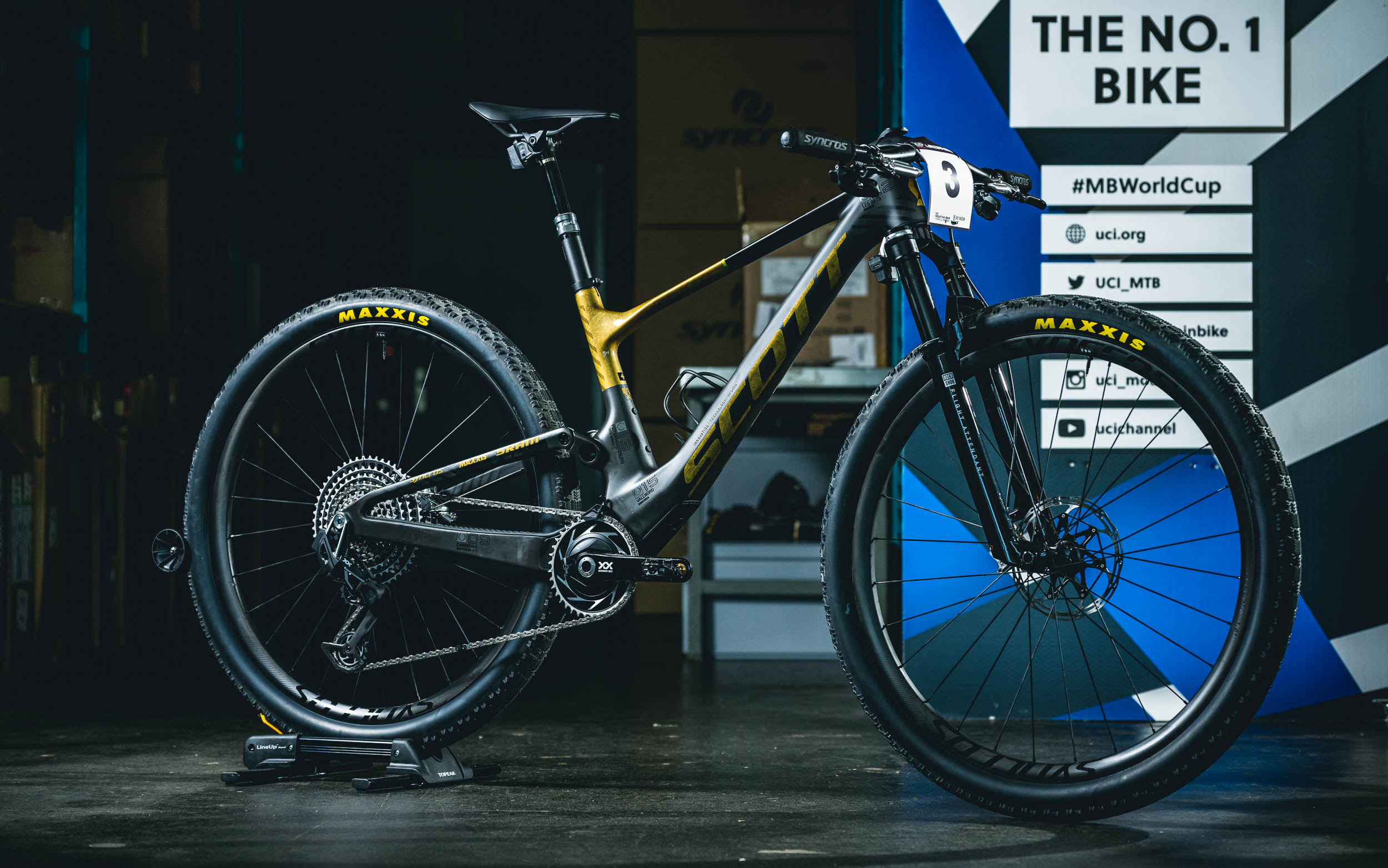 Premier point, les pneus : c’est au cours de la saison 2019 et sur le très technique parcours canadien que Nino a commencé à utiliser des jantes en 30mm de large (contre 25 auparavant) et des pneus en 2.4 avec carcasse Wide Trail adaptée (contre 2.25″ avant). « Une fois encore, nous avons été pionniers car nous avons fait des essais, tenté de nouvelles choses. Sur les parcours de coupe du monde qui sont globalement déjà très techniques et cassants en tant que tel, quand les Elites roulent le dimanche, toutes les racines sont à nu et les roches saillantes. Pour garder une résistance au roulement la plus basse possible, on veut garder des crampons très minimalistes sur la bande de roulement. Travailler sur le volume du pneu est donc la meilleure option pour gagner en accroche et en efficacité sans pénaliser le rendement sur les portions plus roulantes. Au final, la pénalité de poids est très largement compensée. Aujourd’hui, on s’est vraiment rendu compte et on a démontré que le poids doit rester une préoccupation, mais secondaire. On est loin de la chasse au moindre gramme de l’époque du Scale de 2010 quitte, sans s’en rendre compte, à dégrader les performances globales du vélo. »