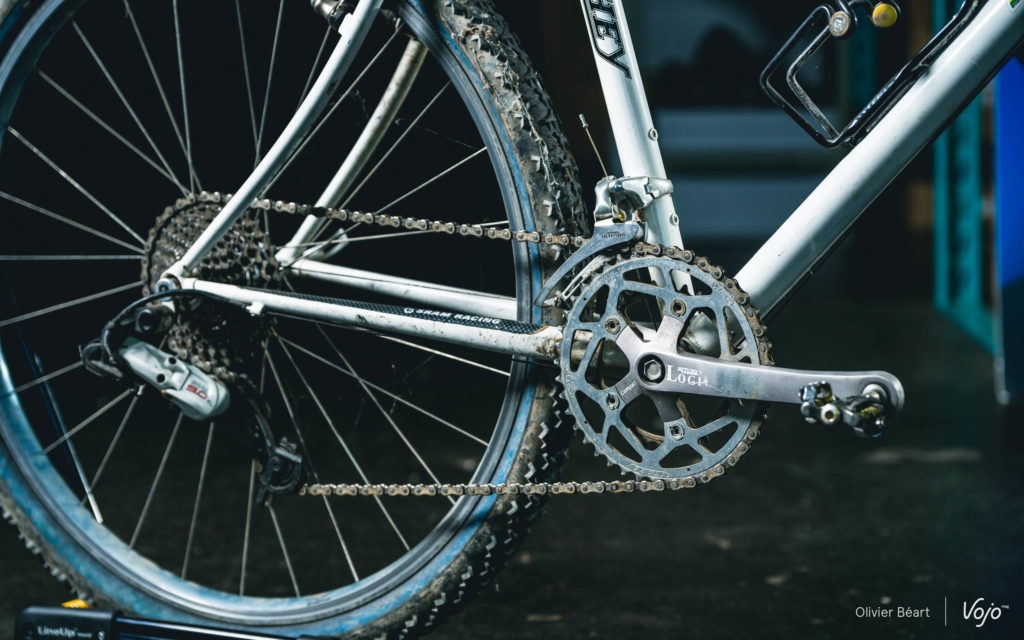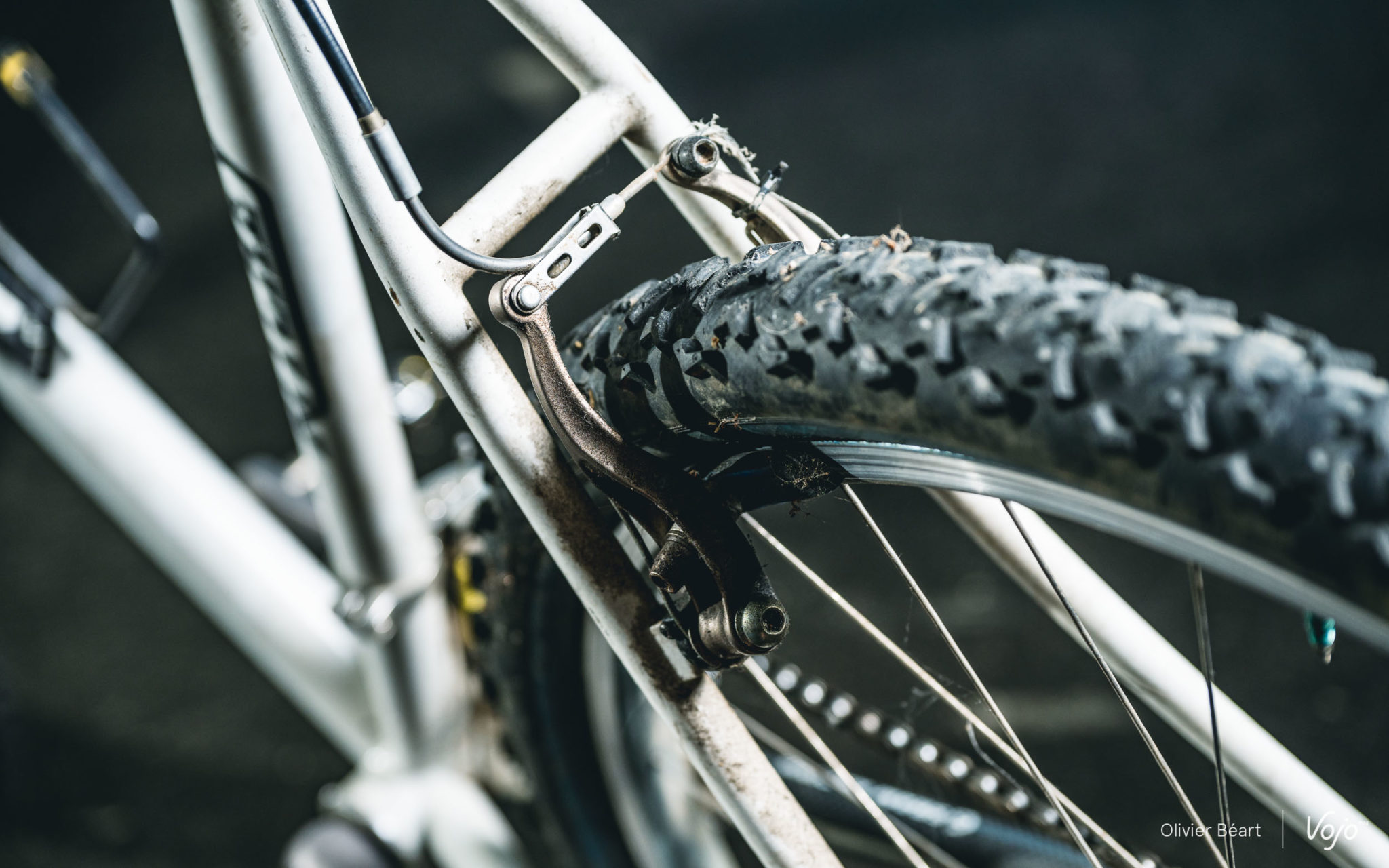 Au-delà du cadre et de ses tubes très fins en acier, les freins à patins, la géométrie anti-sloping et les pneus très étroits montrent bien que cette machine a plus de 20 ans. Par contre, on trouvait déjà une RockShox SID à l’avant, la fameuse SidNey avec le premier système de blocage (produite en édition limitée à seulement 500 exemplaires), et une transmission Ritchey/Sram 9.0SL à 9 vitesses mais qui était déjà en double plateau alors que tout le monde ou presque roulait encore en triple à cette période.