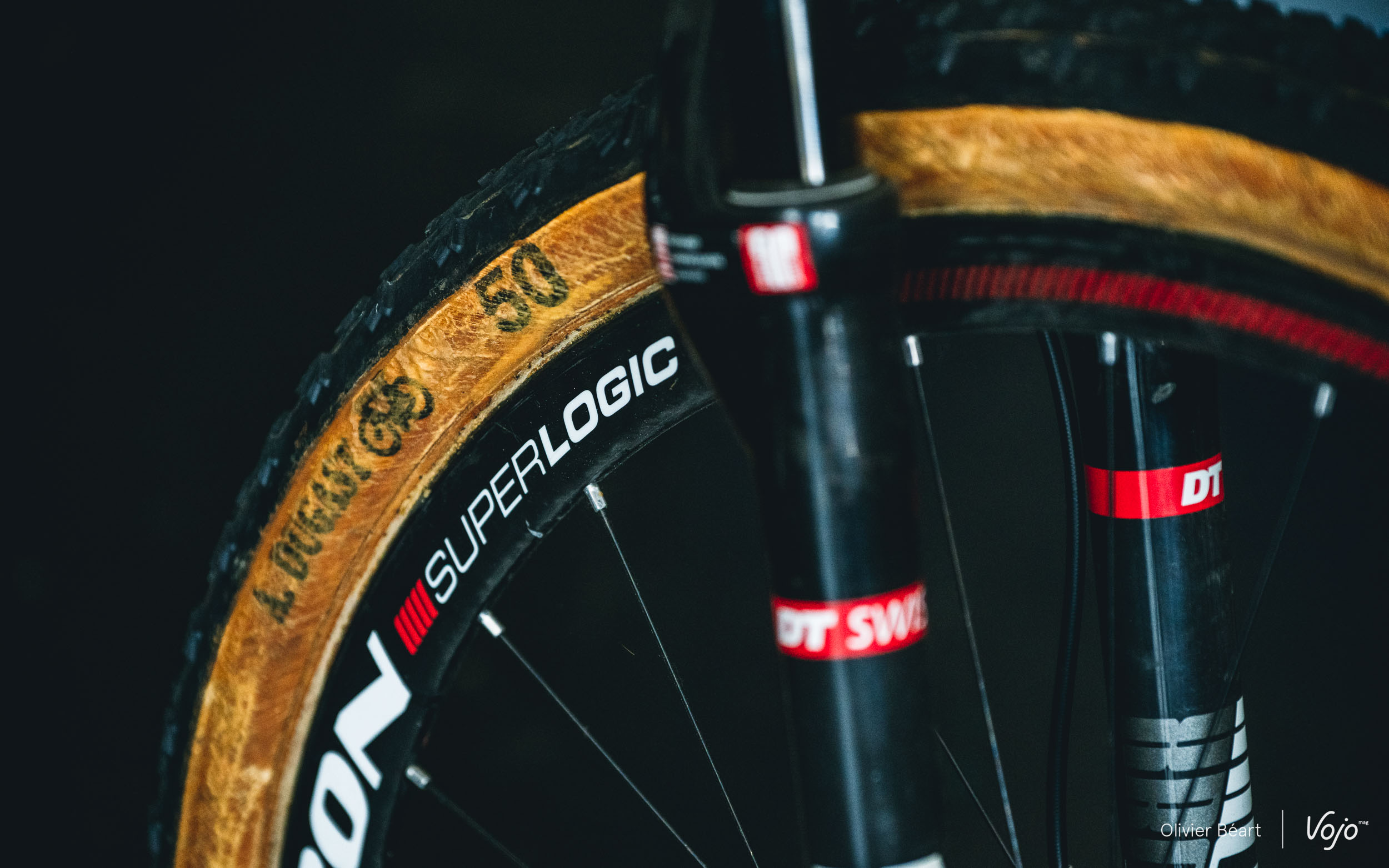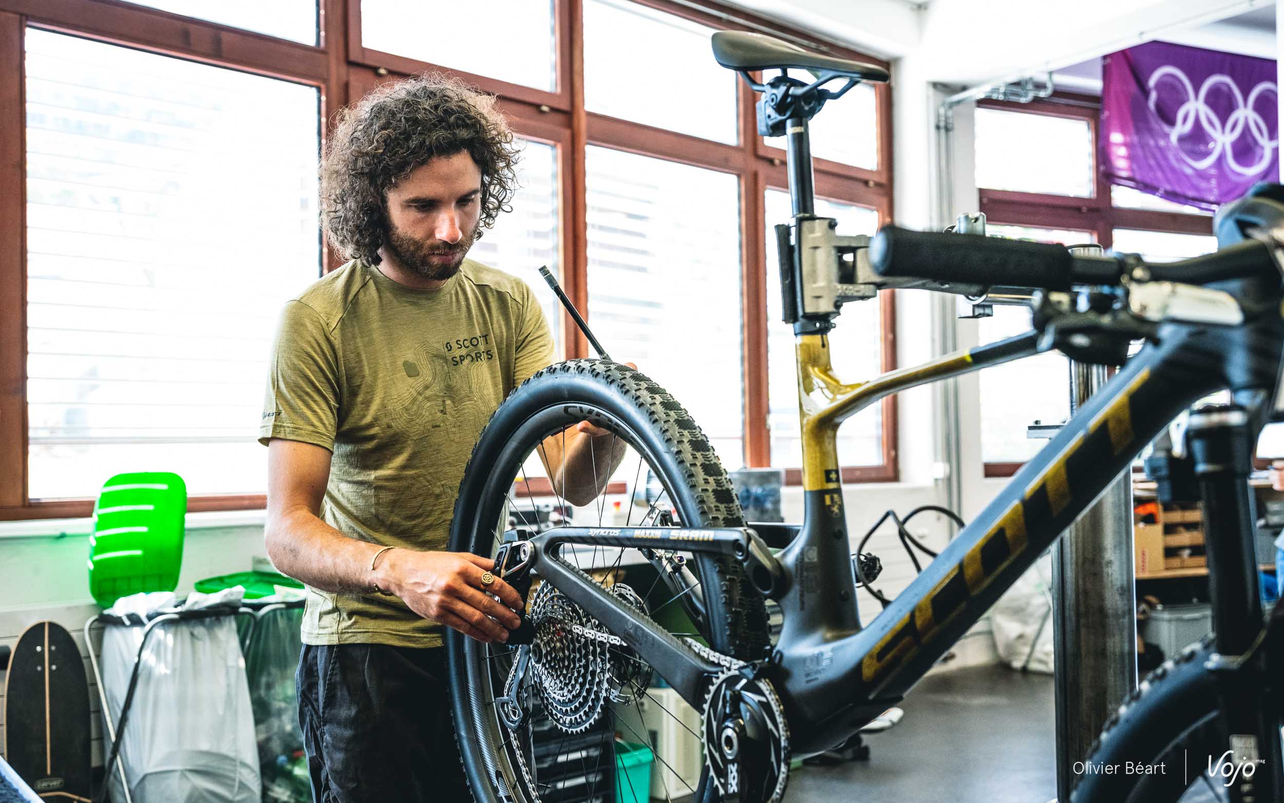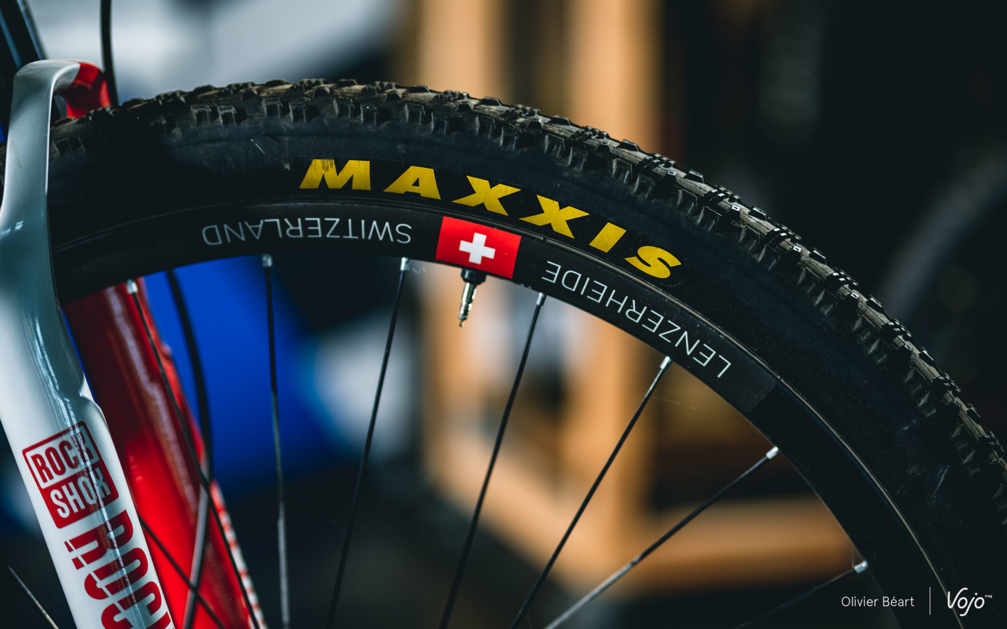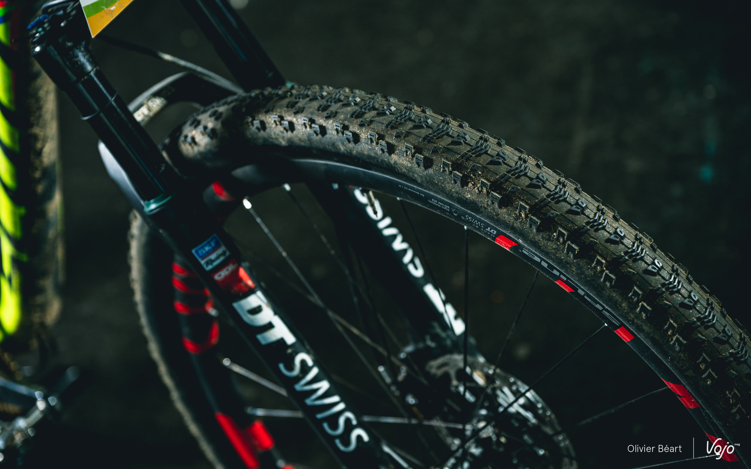 « L’arrivée de ce vélo nous a amenés à tout repenser au niveau des trains roulants. Avec le 29, on n’avait plus besoin de boyaux pour avoir du grip, on pouvait revenir sur des pneus tubeless classiques. Pour savoir quel modèle choisir, nous avons fait des tests et des mesures de résistance au roulement hyper précises en conditions off-road, en collaboration avec une université suisse. C’était très complexe car nous avions sélectionné 9 profils dans différentes marques. Et c’est clairement le Maxxis Aspen qui s’est détaché. C’est d’ailleurs toujours le pneu favori de Nino et c’est même devenu un des pneus les plus courants dans le paddock. Pourtant, il était déjà dispo avant 2016, mais personne ne l’utilisait. »