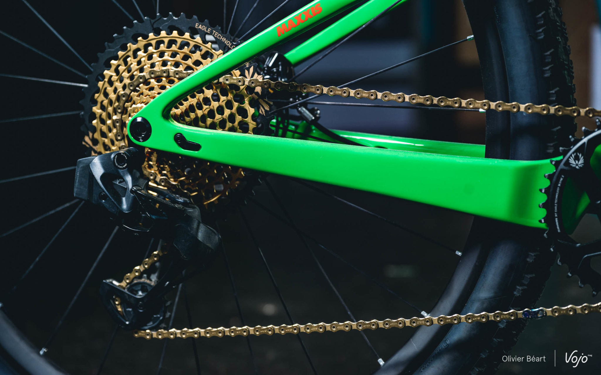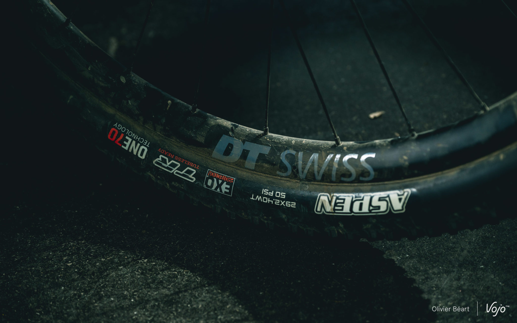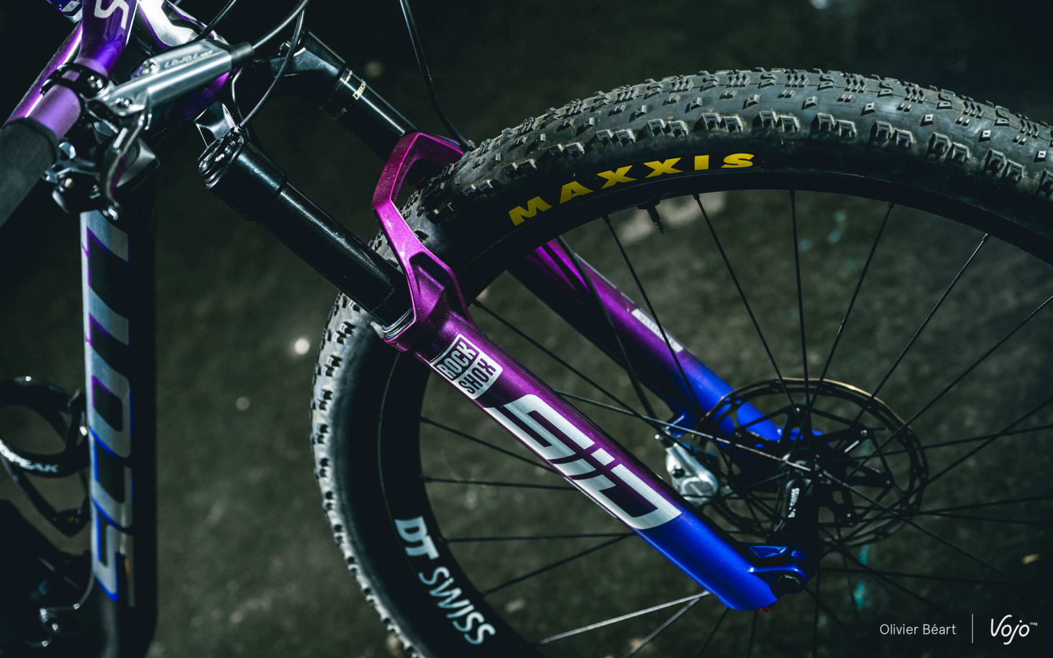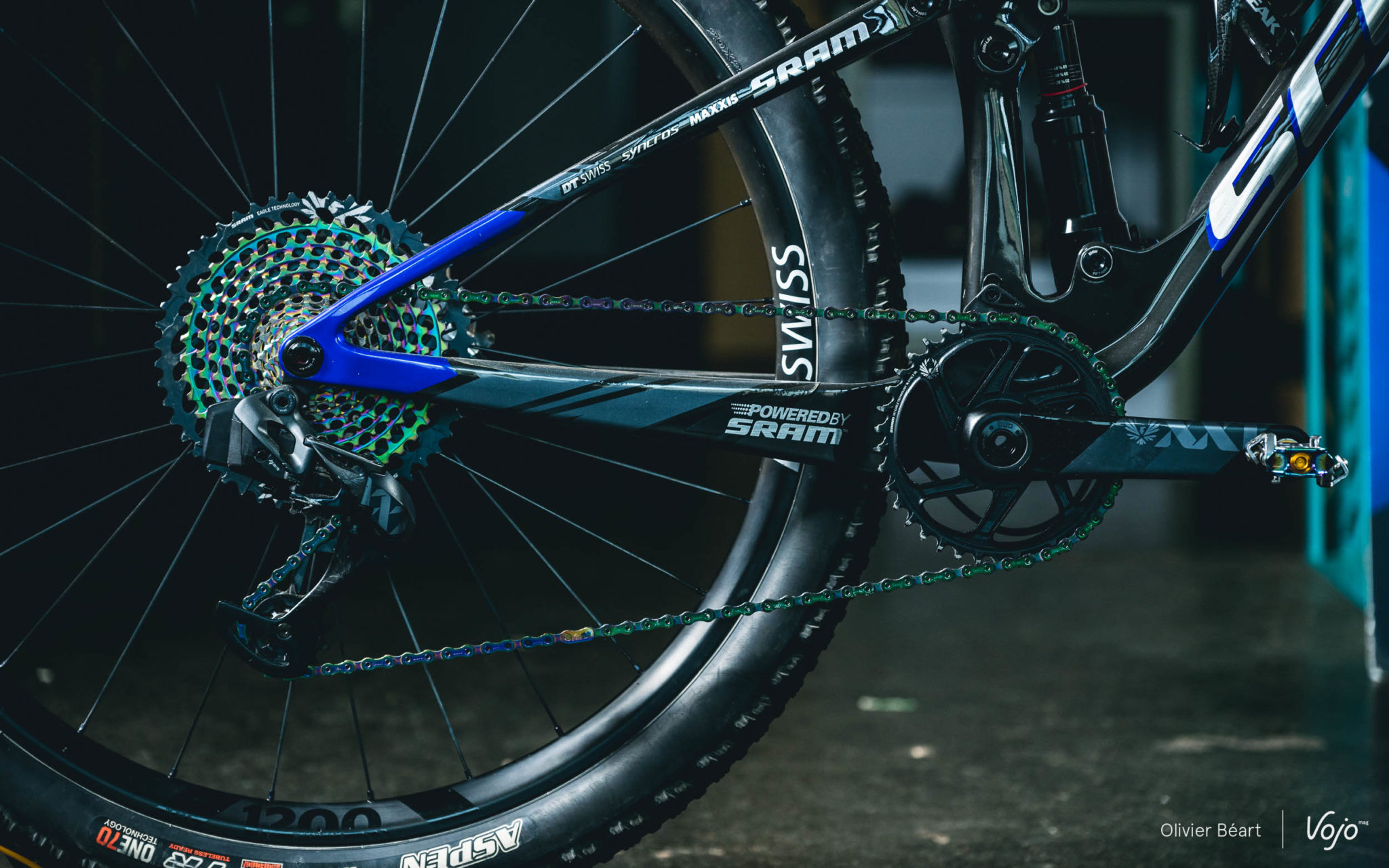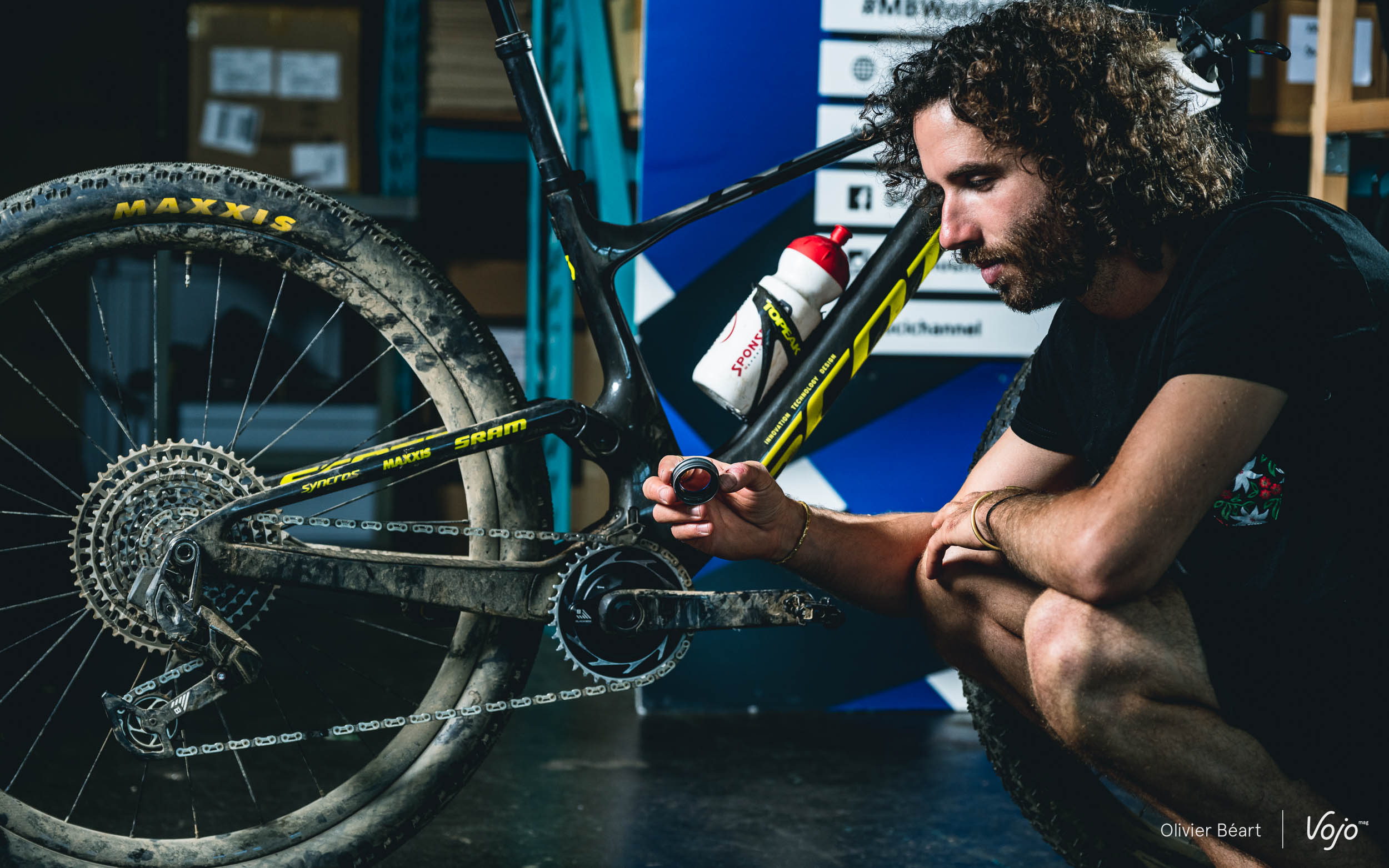 « L’arrivée de ce vélo nous a amenés à tout repenser au niveau des trains roulants. Avec le 29, on n’avait plus besoin de boyaux pour avoir du grip, on pouvait revenir sur des pneus tubeless classiques. Pour savoir quel modèle choisir, nous avons fait des tests et des mesures de résistance au roulement hyper précises en conditions off-road, en collaboration avec une université suisse. C’était très complexe car nous avions sélectionné 9 profils dans différentes marques. Et c’est clairement le Maxxis Aspen qui s’est détaché. C’est d’ailleurs toujours le pneu favori de Nino et c’est même devenu un des pneus les plus courants dans le paddock. Pourtant, il était déjà dispo avant 2016, mais personne ne l’utilisait. »