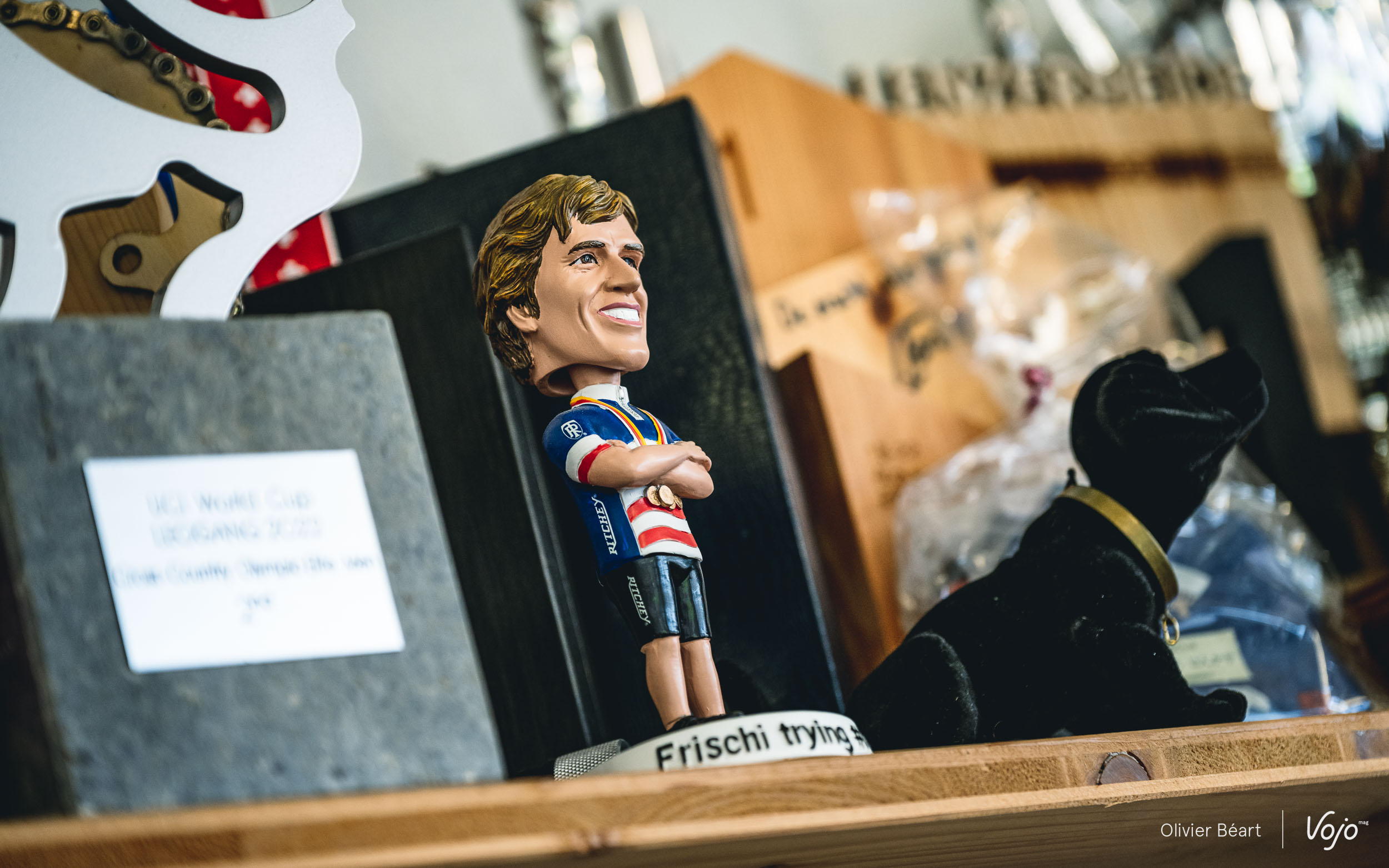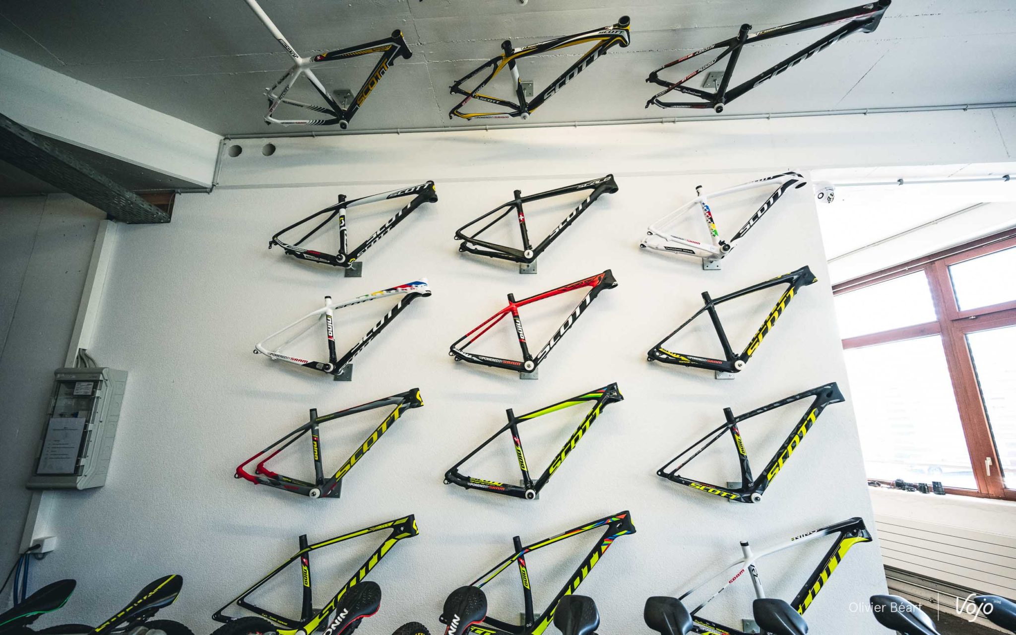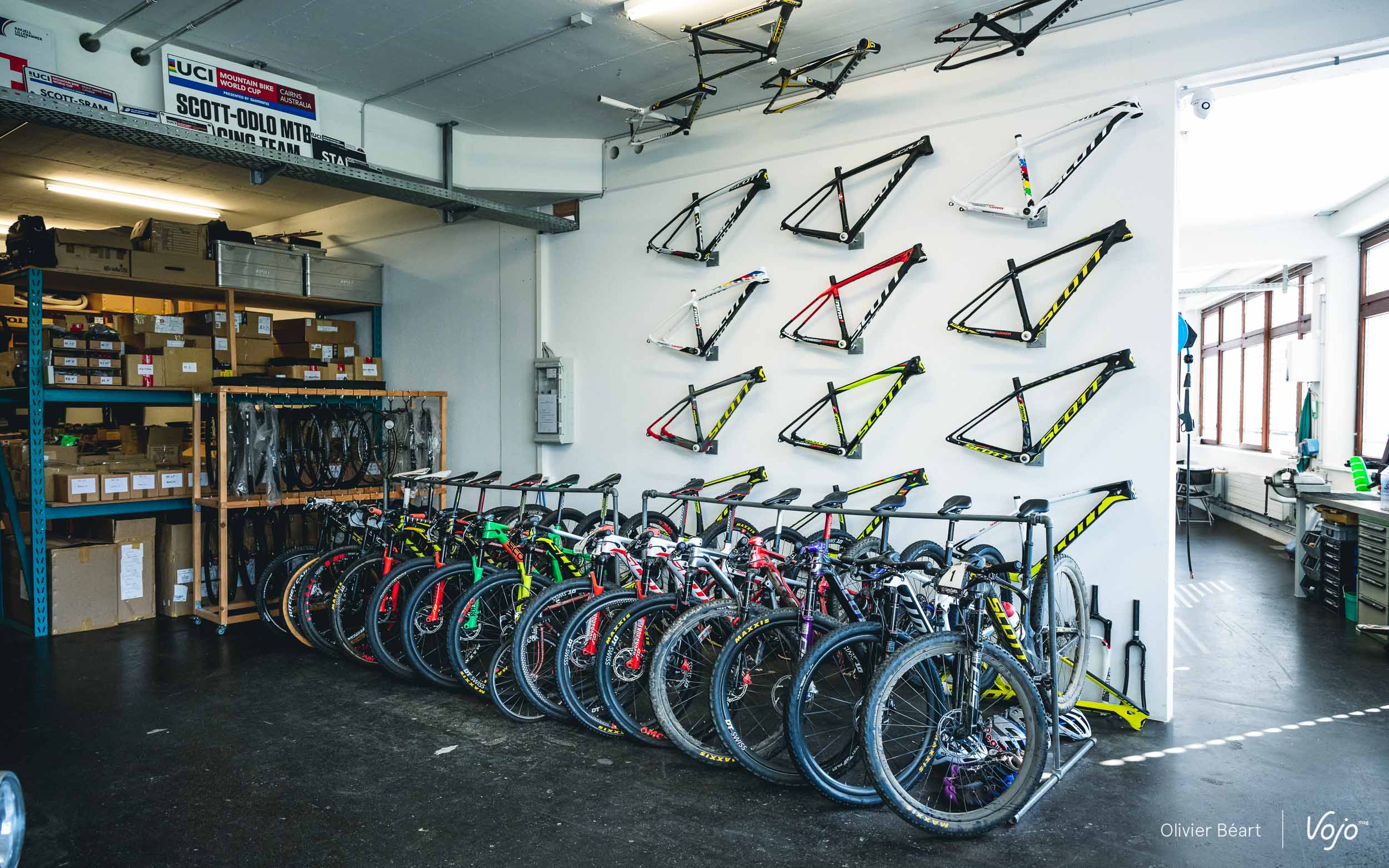 Certains vélos sont au domicile de Nino, d’autres au QG de Scott à Givisiez, mais le gros de la mémoire des machines roulées par le « G.O.A.T » (Greatest Of All Times) est conservé ici, pile entre le stock de pièces neuves du team et l’atelier où sont préparées les dernières machines de l’équipe. En tout, il y a ici plus d’une trentaine de vélos et cadres au pédigrée impressionnant.