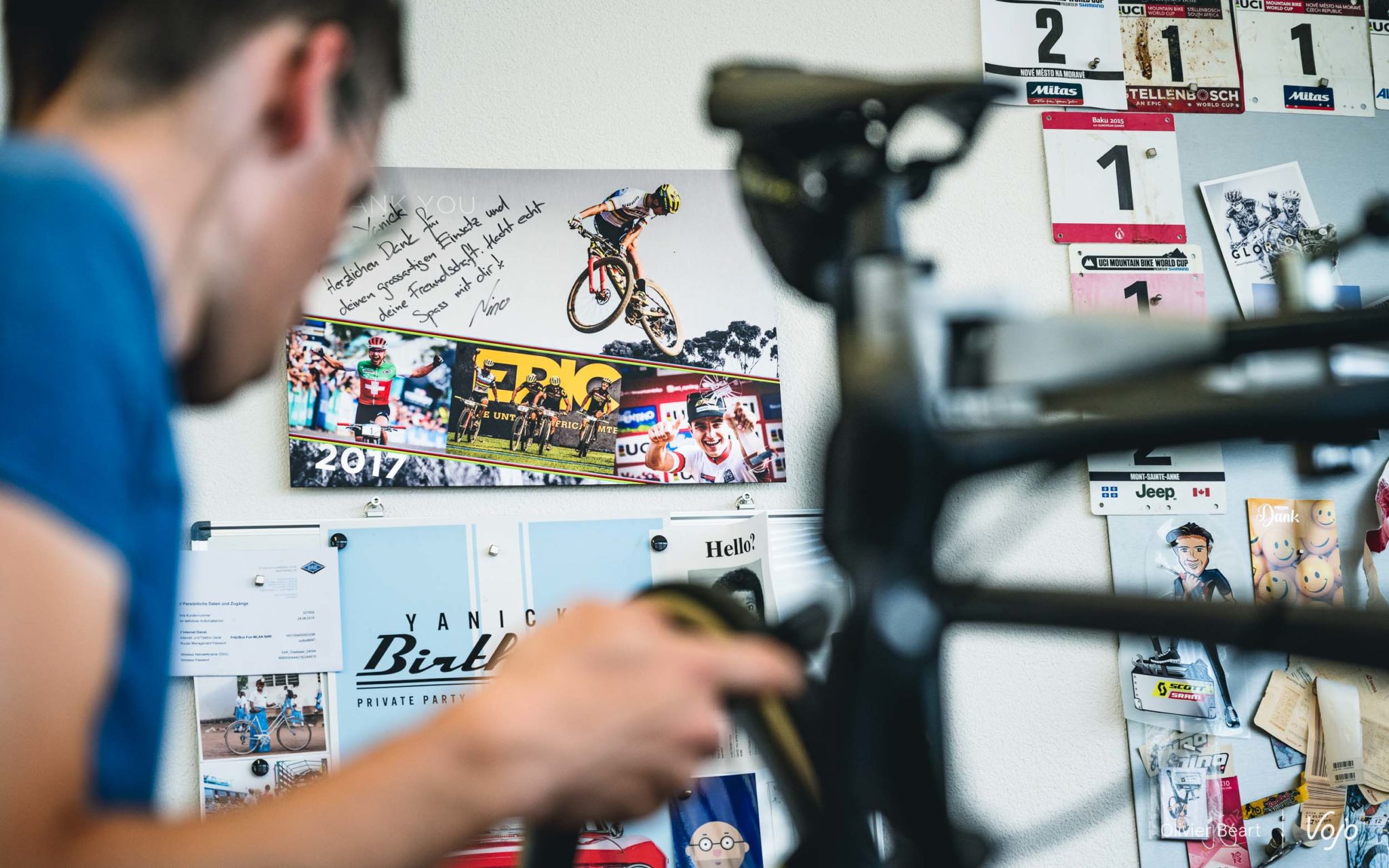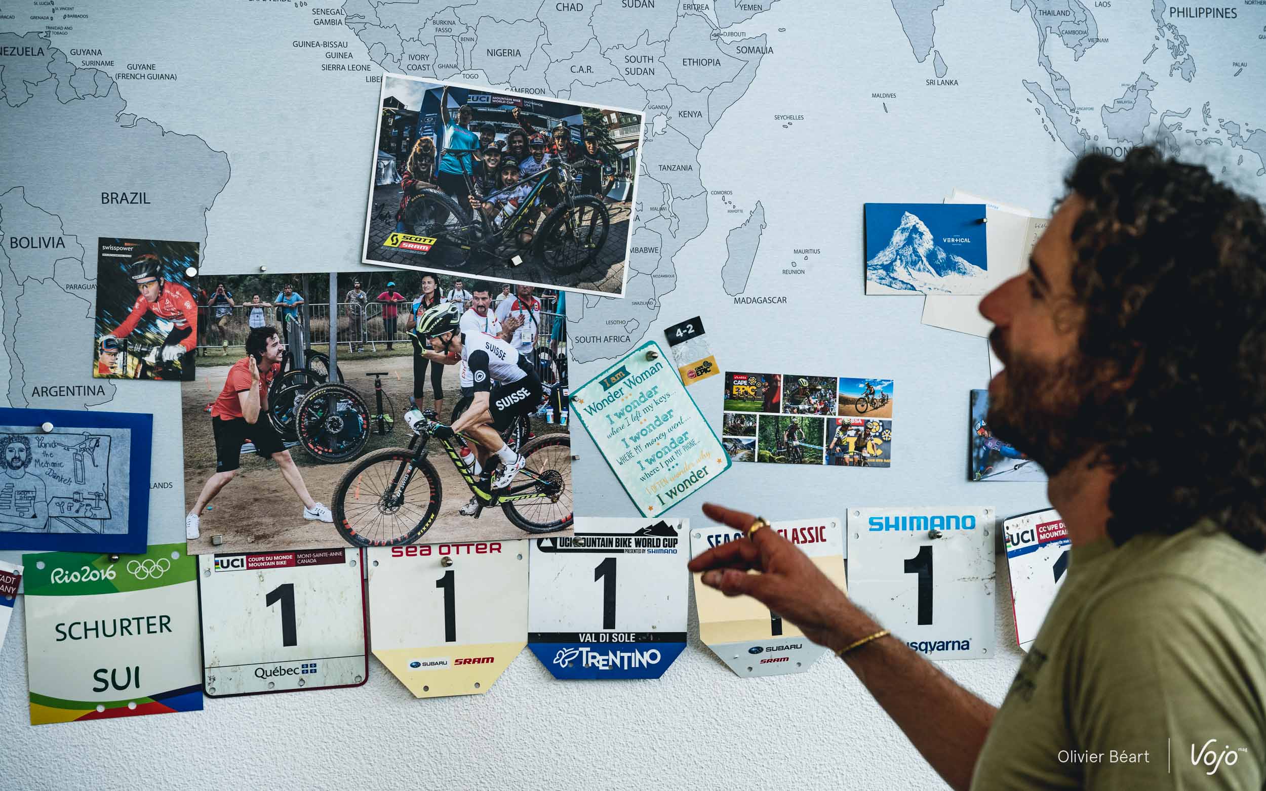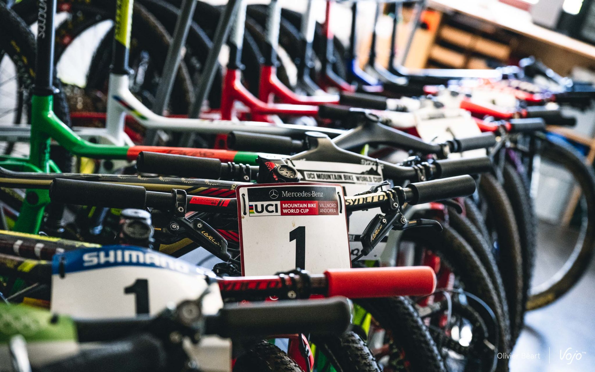 Cela ne vous aura certainement pas échappé : Nino Schurter est devenu le recordman absolu du nombre de victoires en coupe du monde avec 34 succès… à l’heure où nous écrivons ces lignes, car il est possible qu’il ne s’arrête pas là ! Moins de 24 heures après ce moment historique dans l’histoire du VTT, nous avons rendu une petite visite au QG du team Scott-Sram près de Zurich, où Yanick, l’emblématique mécanicien de Nino Schurter, conserve avec passion une grande partie des vélos qui ont marqué la carrière du champion suisse. Vojo vous ouvre les portes du Saint des Saints :