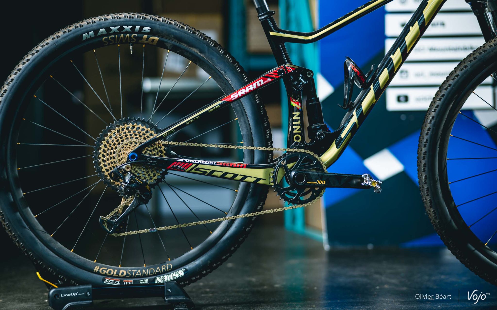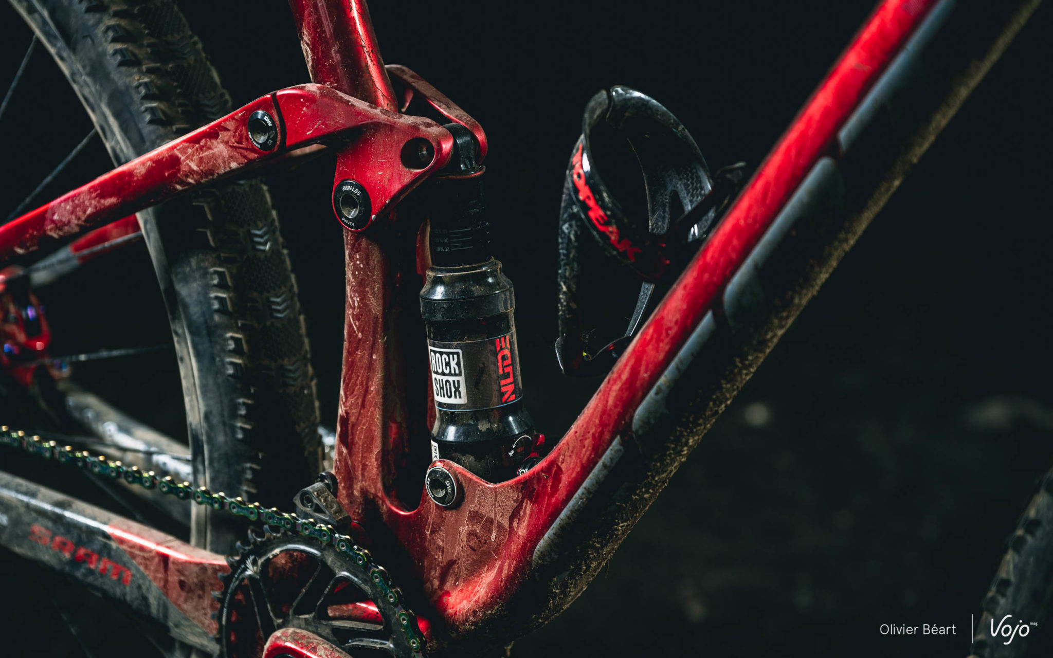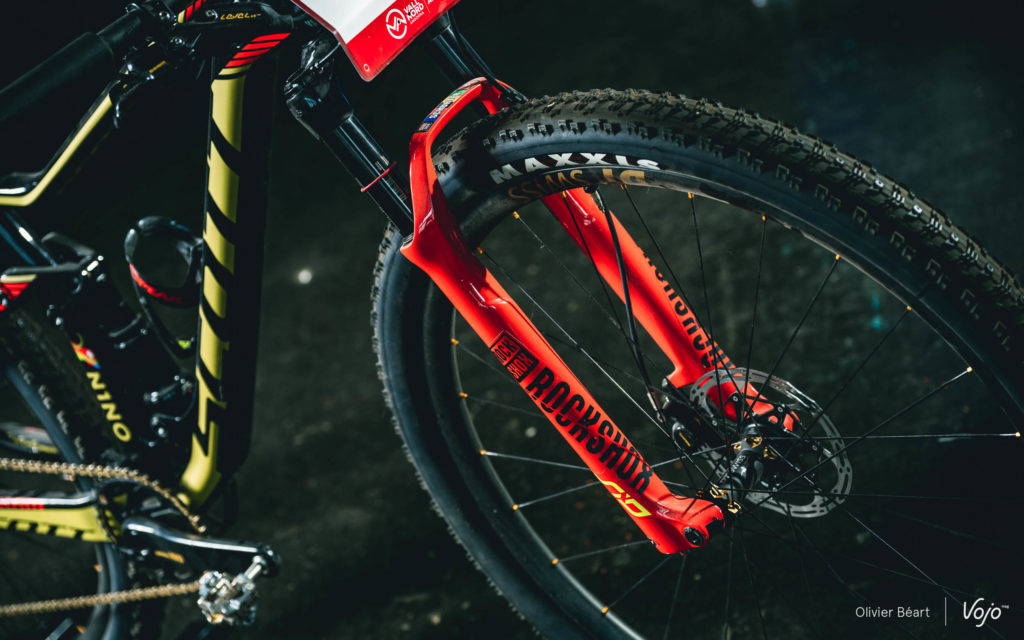 Premier point, les pneus : c’est au cours de la saison 2019 et sur le très technique parcours canadien que Nino a commencé à utiliser des jantes en 30mm de large (contre 25 auparavant) et des pneus en 2.4 avec carcasse Wide Trail adaptée (contre 2.25″ avant). « Une fois encore, nous avons été pionniers car nous avons fait des essais, tenté de nouvelles choses. Sur les parcours de coupe du monde qui sont globalement déjà très techniques et cassants en tant que tel, quand les Elites roulent le dimanche, toutes les racines sont à nu et les roches saillantes. Pour garder une résistance au roulement la plus basse possible, on veut garder des crampons très minimalistes sur la bande de roulement. Travailler sur le volume du pneu est donc la meilleure option pour gagner en accroche et en efficacité sans pénaliser le rendement sur les portions plus roulantes. Au final, la pénalité de poids est très largement compensée. Aujourd’hui, on s’est vraiment rendu compte et on a démontré que le poids doit rester une préoccupation, mais secondaire. On est loin de la chasse au moindre gramme de l’époque du Scale de 2010 quitte, sans s’en rendre compte, à dégrader les performances globales du vélo. »