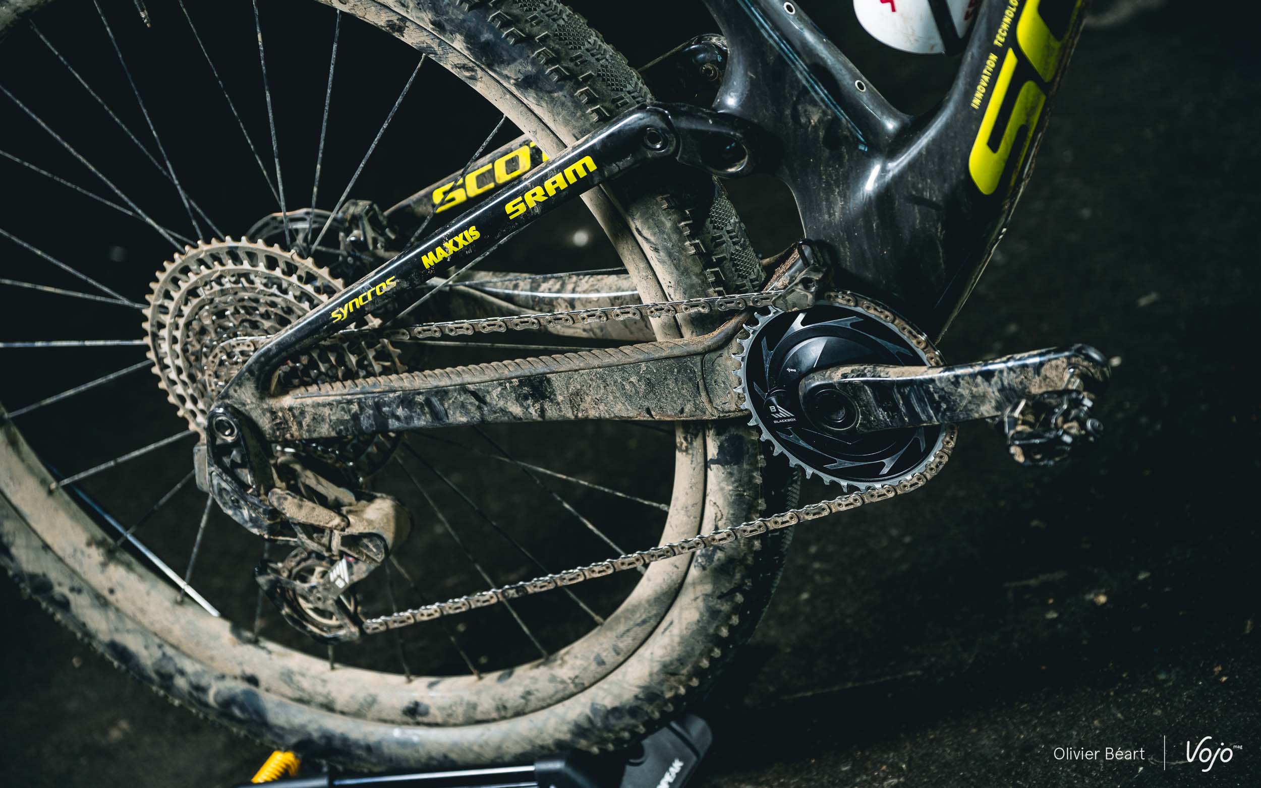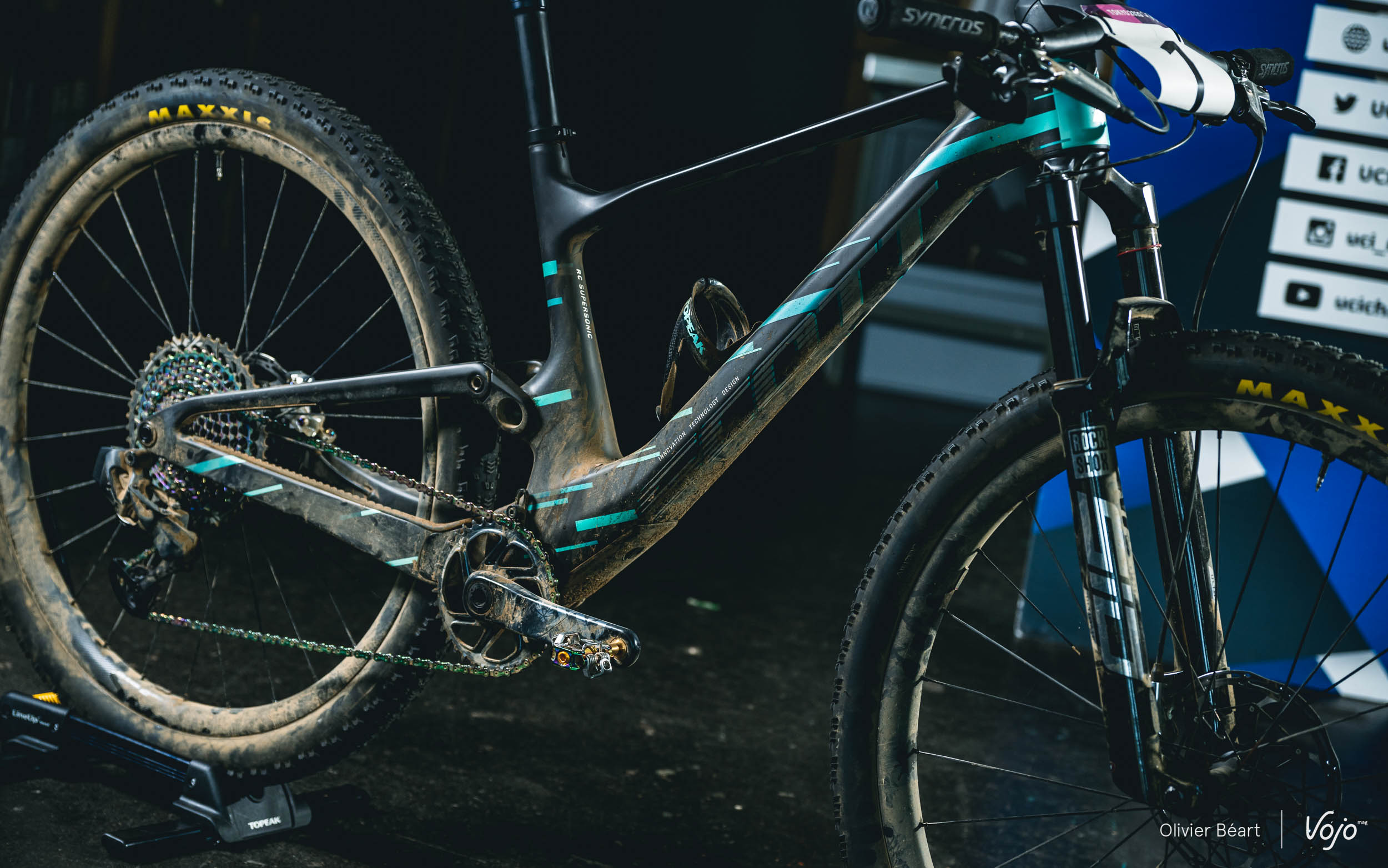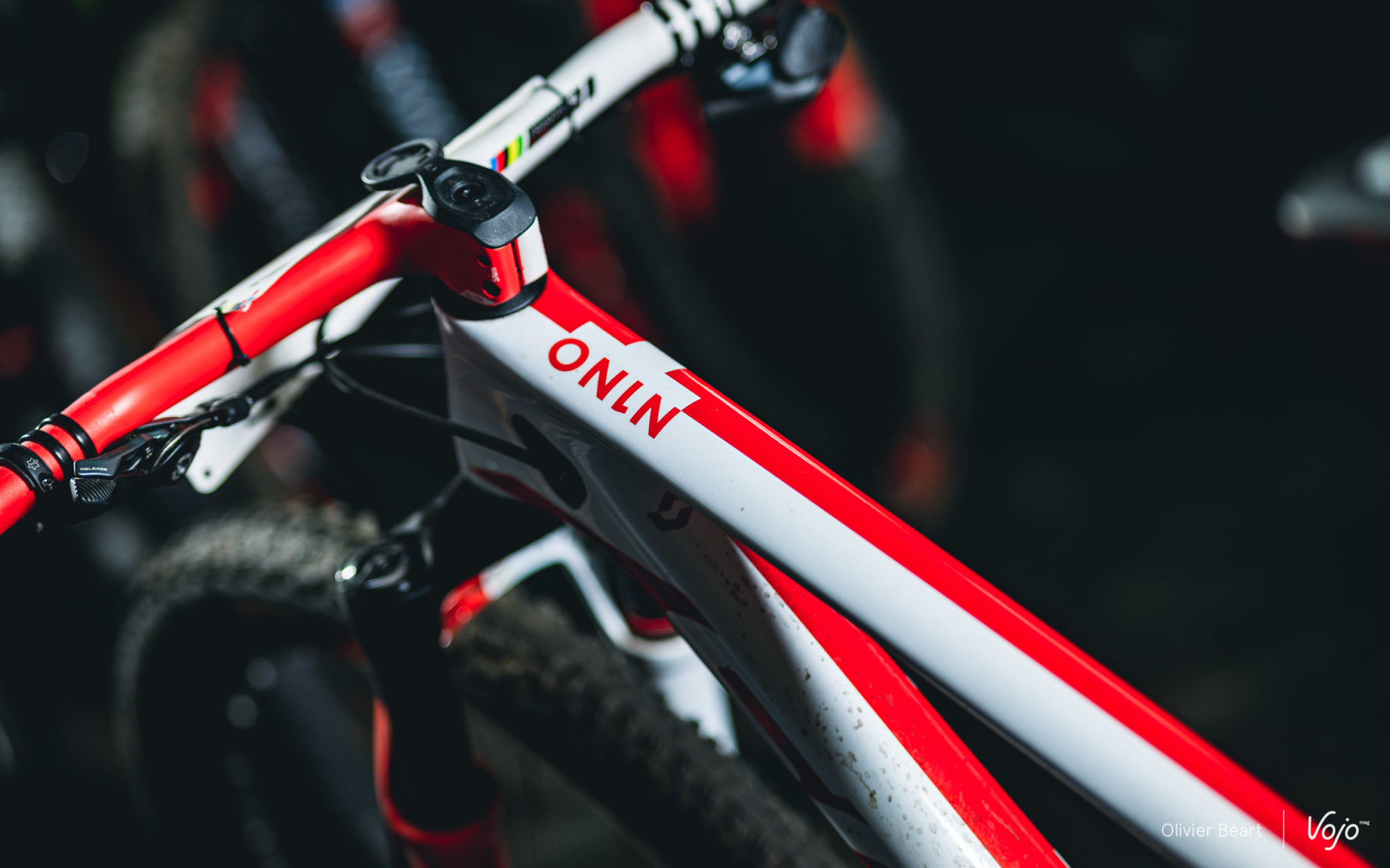 Premier point, les pneus : c’est au cours de la saison 2019 et sur le très technique parcours canadien que Nino a commencé à utiliser des jantes en 30mm de large (contre 25 auparavant) et des pneus en 2.4 avec carcasse Wide Trail adaptée (contre 2.25″ avant). « Une fois encore, nous avons été pionniers car nous avons fait des essais, tenté de nouvelles choses. Sur les parcours de coupe du monde qui sont globalement déjà très techniques et cassants en tant que tel, quand les Elites roulent le dimanche, toutes les racines sont à nu et les roches saillantes. Pour garder une résistance au roulement la plus basse possible, on veut garder des crampons très minimalistes sur la bande de roulement. Travailler sur le volume du pneu est donc la meilleure option pour gagner en accroche et en efficacité sans pénaliser le rendement sur les portions plus roulantes. Au final, la pénalité de poids est très largement compensée. Aujourd’hui, on s’est vraiment rendu compte et on a démontré que le poids doit rester une préoccupation, mais secondaire. On est loin de la chasse au moindre gramme de l’époque du Scale de 2010 quitte, sans s’en rendre compte, à dégrader les performances globales du vélo. »