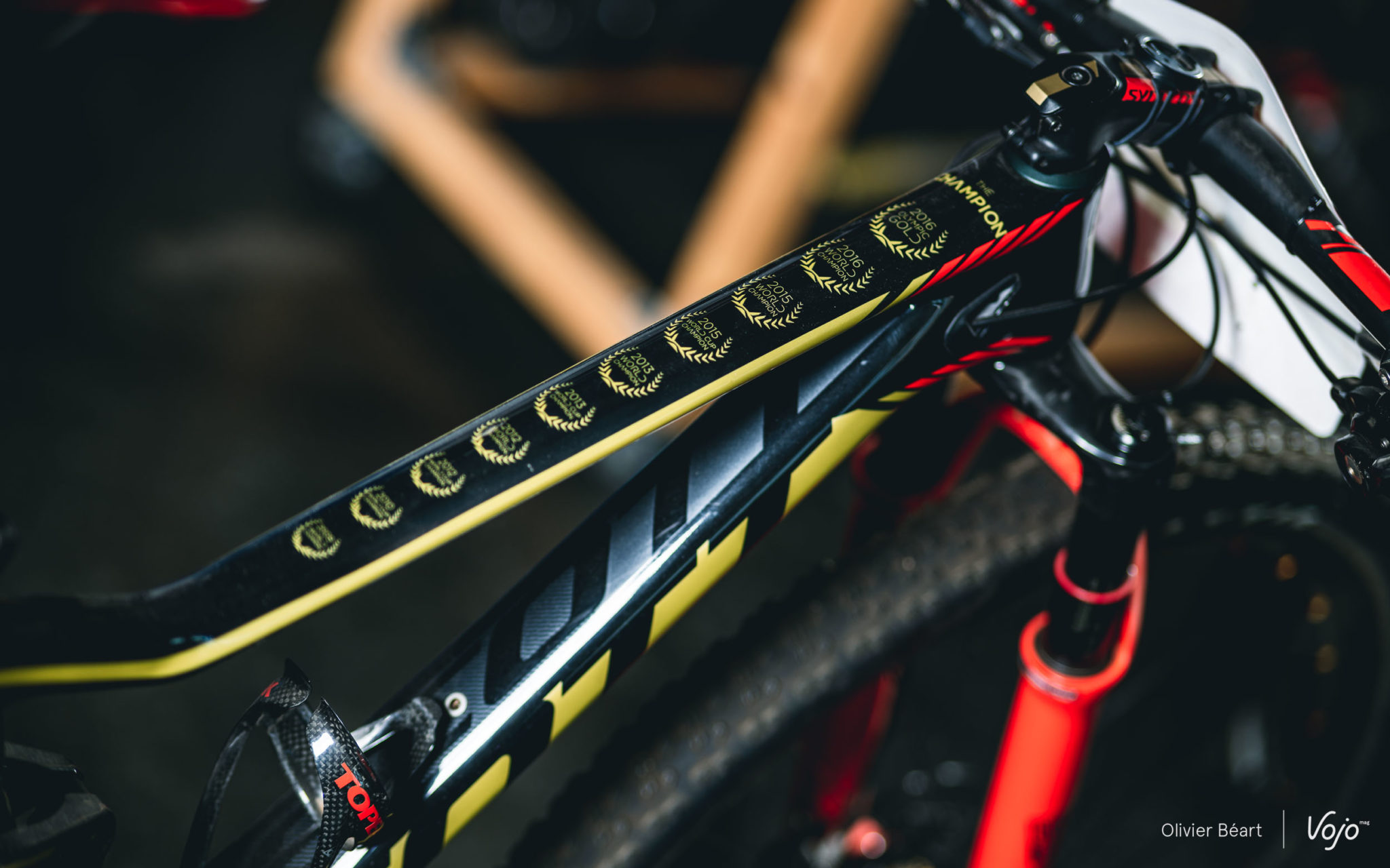 On fait ensuite un petit saut dans le temps pour voguer jusque 2009 avec un Scott Scale très spécial, comme le détaille Yanick : « 2009, c’est à la fois l’année du premier titre de champion du monde Elite de Nino et aussi celle de la dernière coupe du monde de Frischi. Le Scale de Nino est au musée Scott à Givisiez, et ici c’est celui de Thomas. Pour moi c’est la transition que ces vélos représentent qui est importante. Et, à mon niveau, ce sont aussi les années où j’ai commencé à travailler plus régulièrement pour le team. Cela s’est fait progressivement, j’ai d’abord eu l’opportunité de faire un remplacement d’un mécano malade grâce à un ami qui m’a mis en contact avec Frischi, puis le courant est bien passé et il m’a rappelé de plus en plus souvent. J’étais encore tout jeune et je n’avais pas encore terminé ma formation, mais il m’a mis le pied à l’étrier. »