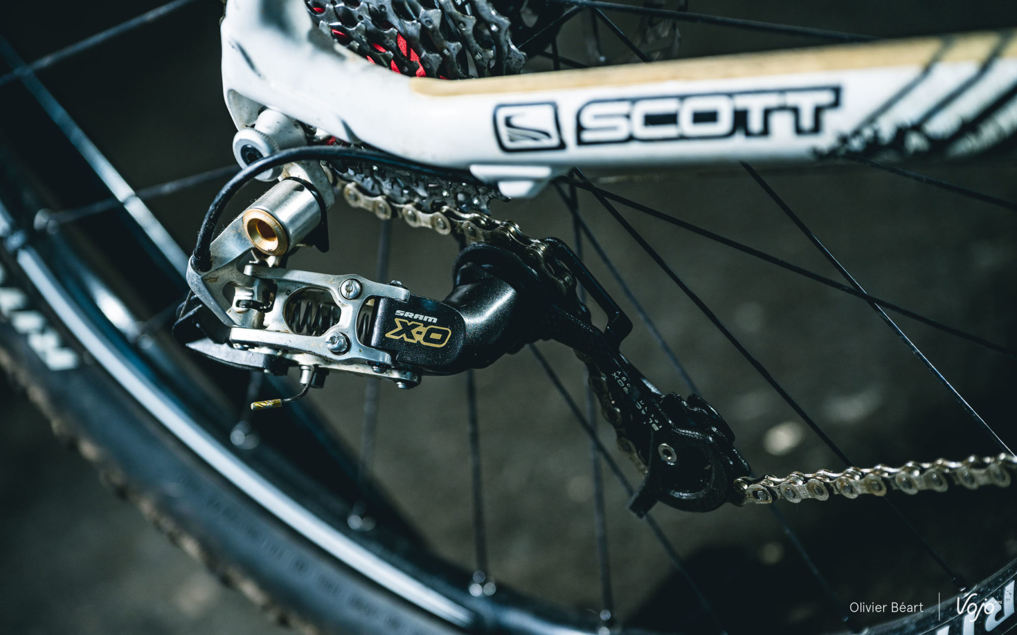 Une très grande évolution doit aussi être soulignée au niveau de la transmission avec l’arrivée du Sram XX 2×10, premier groupe tout à fait complet de la marque américaine, proposé entièrement sous son nom propre (sans référence à Avid, Truvativ, etc). On l’a vu, les athlètes et le team Ritchey/Scott utilisaient déjà du double avant cela, mais en mode bricolage. Là, Sram arrivait avec une solution dédiée, hyper aboutie, qui a marqué les esprits par sa qualité de fonctionnement. C’est aussi là que le mouvement a commencé pour l’augmentation de la taille et du nombre de pignons de la cassette, combinés à la réduction du nombre de plateaux.