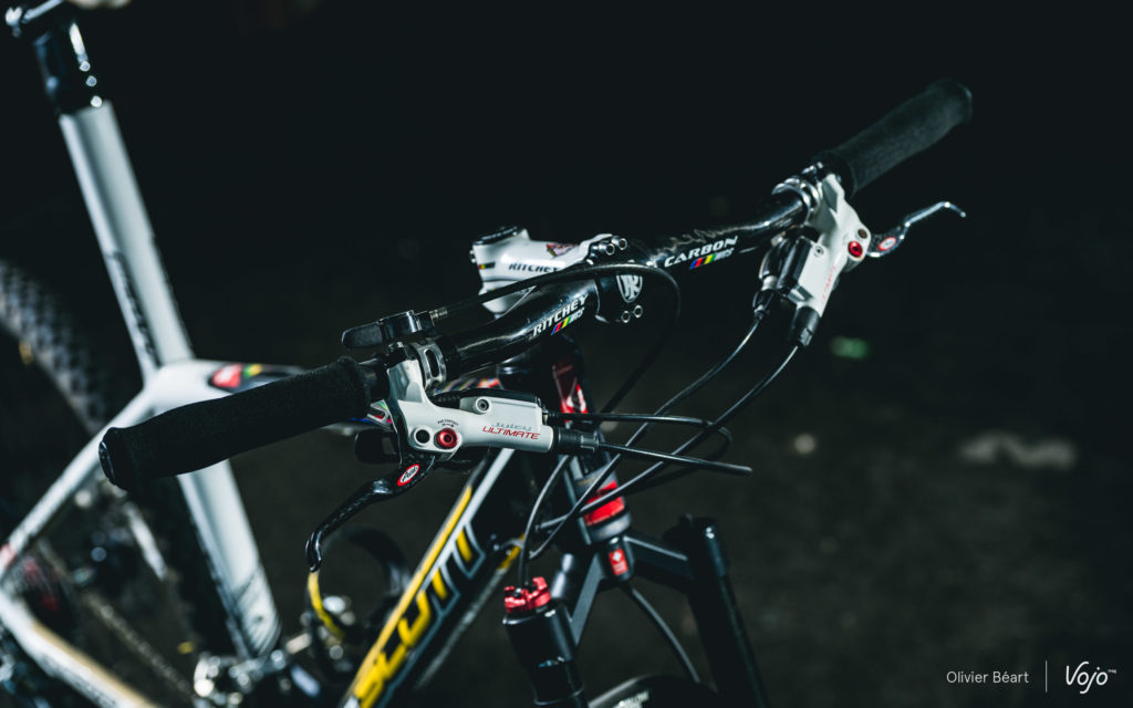 Yanick donne plus de précisions : « Avant ce vélo, Nino roulait déjà régulièrement en tout suspendu, mais encore très souvent en semi-rigide aussi. Puis, alors que tous ses rivaux passaient de plus en plus au 29 pouces, à commencer par Julien Absalon, Nino (qui n’est pas très grand), ne parvenait pas à trouver une position optimale sur le premier Spark 29. Il roulait donc toujours en 650b/27,5″. Et en boyaux. Mais dans la perspective de Rio, Scott a remis tout à plat, et nous aussi ! »
