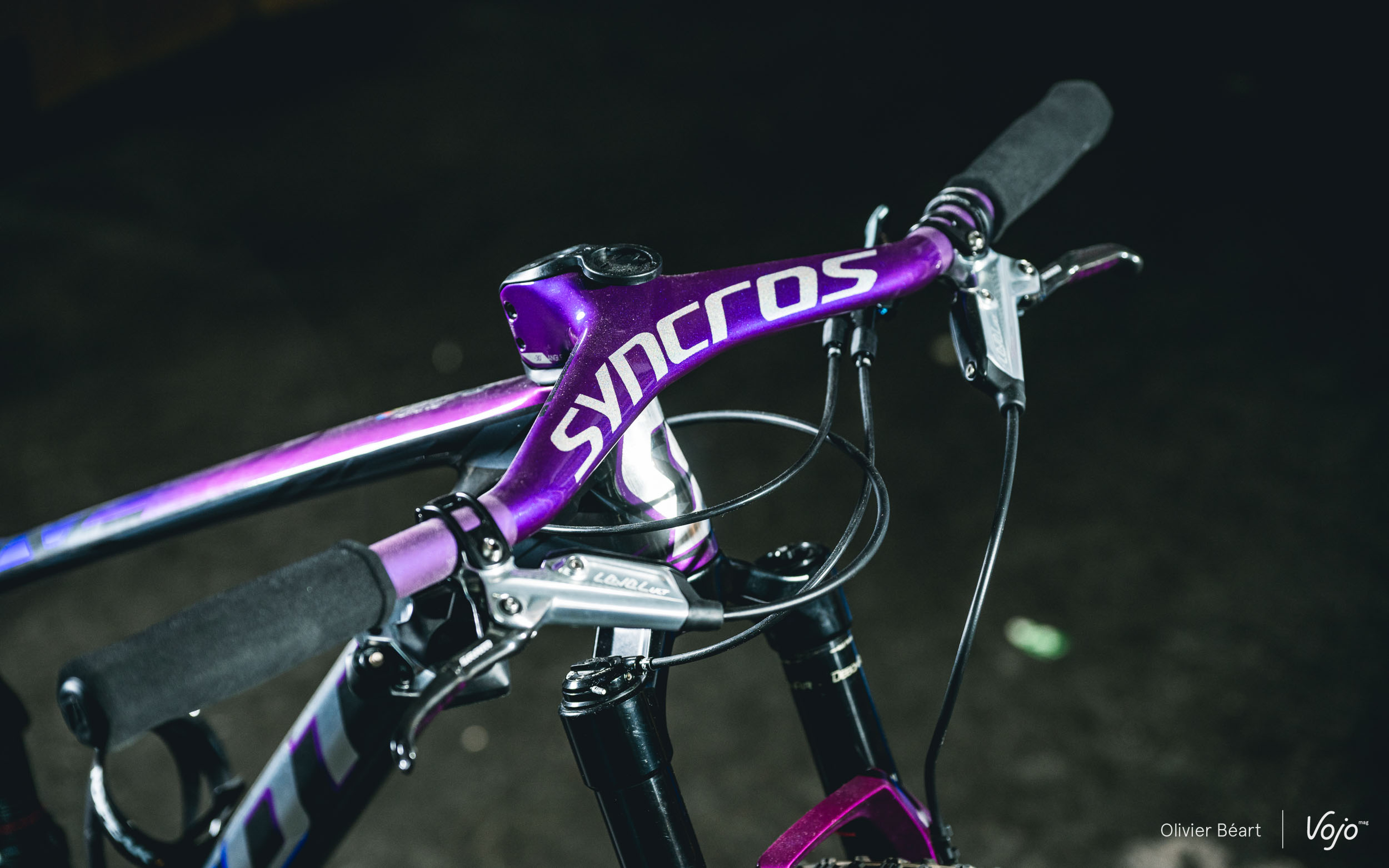 Enfin, ce vélo a aussi commencé à ouvrir la voie à l’augmentation du débattement sur les vélos de XC, puisqu’il est en 120mm derrière (l’amortisseur le permet en changeant juste la course du piston mais pas l’entraxe) et 110mm devant. Ce débattement hybride s’explique par le fait que cette génération du Spark devenait un peu trop « all mountain » et perdait en agressivité quand on lui montait une fourche de 120mm à l’avant. Nino et Yanick ont donc choisi une solution intermédiaire. On note aussi le superbe poste de pilotage intégré Syncros.