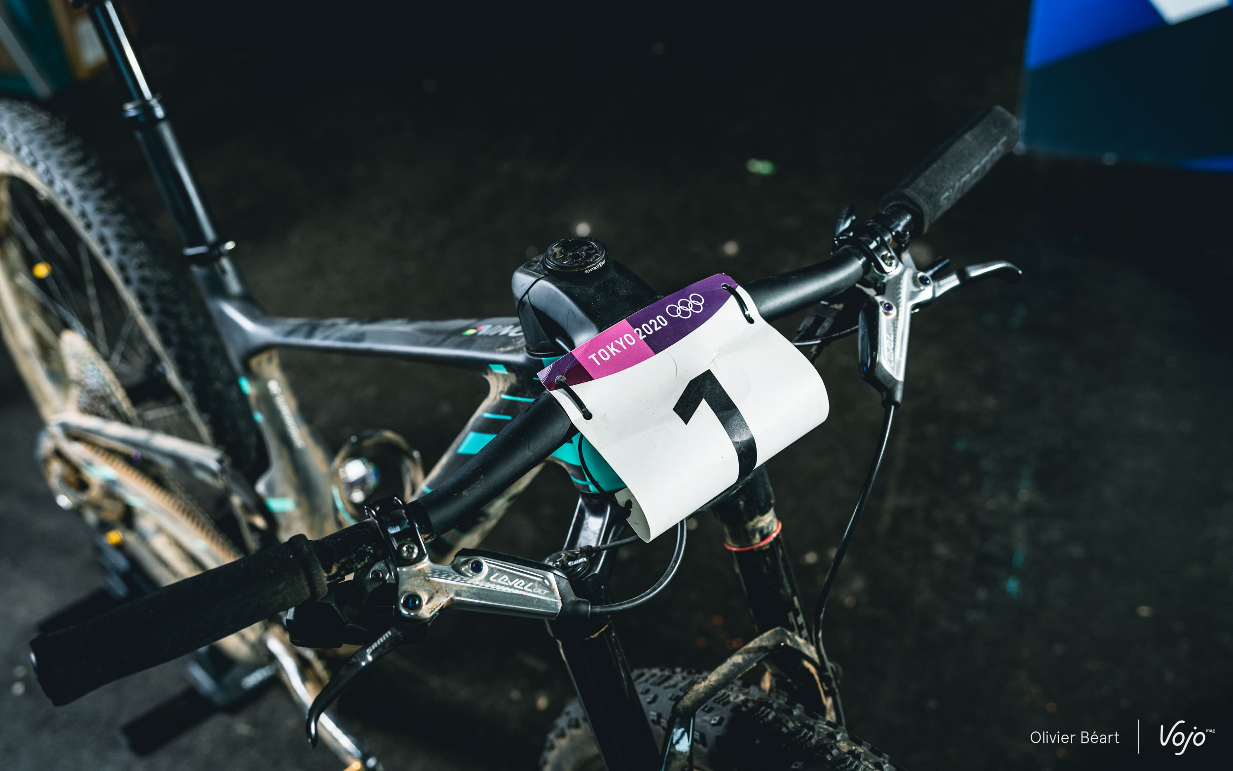 Côté matériel, Nino a pu compter sur un tout nouveau Spark, qui était bel et bien prêt pour les JO dans la mesure où ils se sont finalement tenus en 2021. On ne présente plus sa conception avec l’amortisseur intégré (qui n’est pas que « joli » : cela permet d’abaisser encore un peu plus le centre de gravité et de mettre deux porte-bidons. Il passe aussi d’office en 120mm de débattement, ce qui devient la norme en XC. Et Nino utilise désormais systématiquement la tige de selle télescopique, qu’il était un des seuls à ne pas encore avoir complètement adoptée. La livrée Supersonic est spécifique pour les JO.