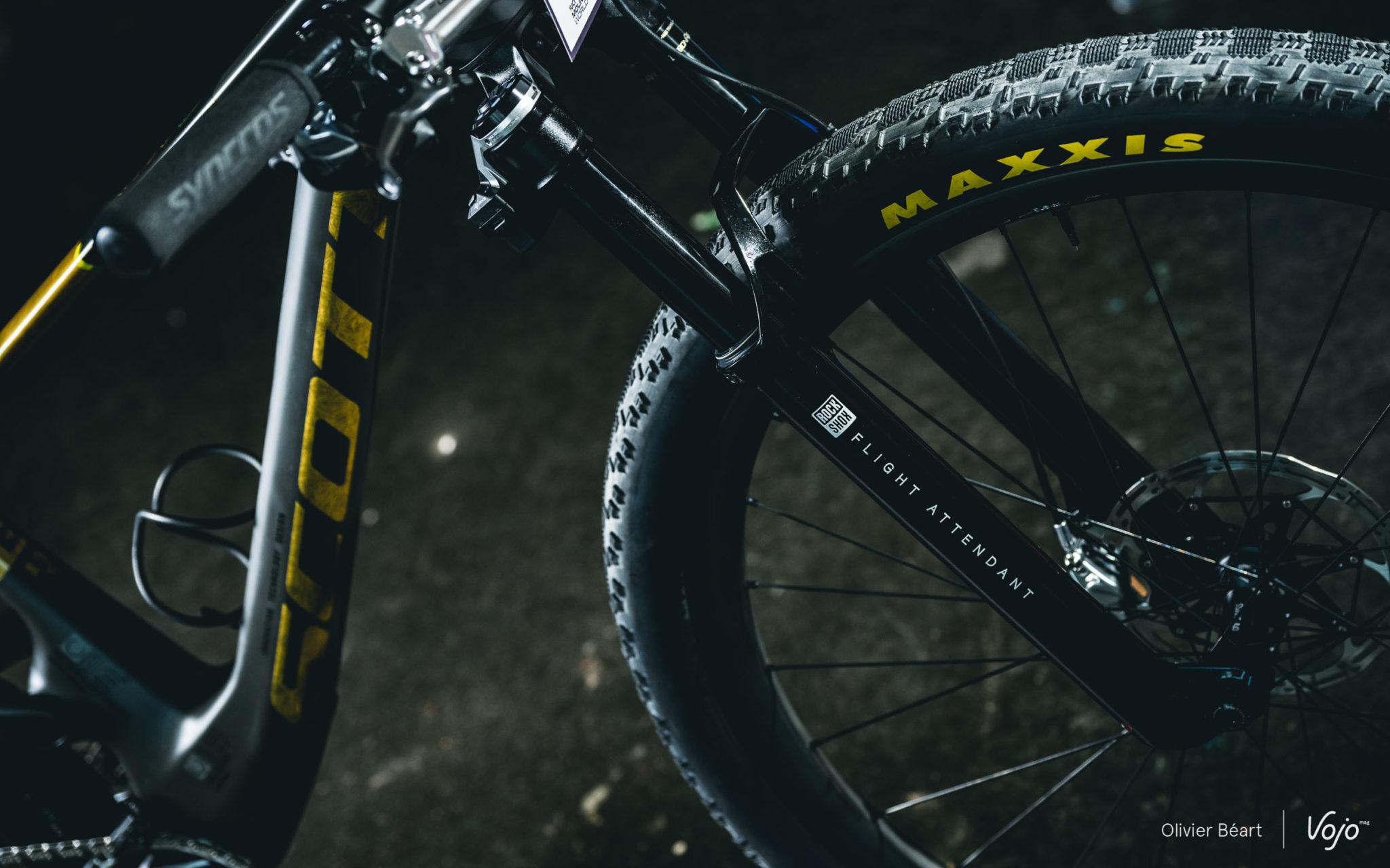 Outre le nouveau groupe Sram T-Type, le vélo utilisé par Nino pour aller décrocher sa 34e couronne pousse encore l’électronique un cran plus loin avec des suspensions pilotées Flight Attendant qui s’annoncent aussi pour le XC, après être sorties courant 2022 pour une pratique all-mountain. Le futur est déjà en marche !