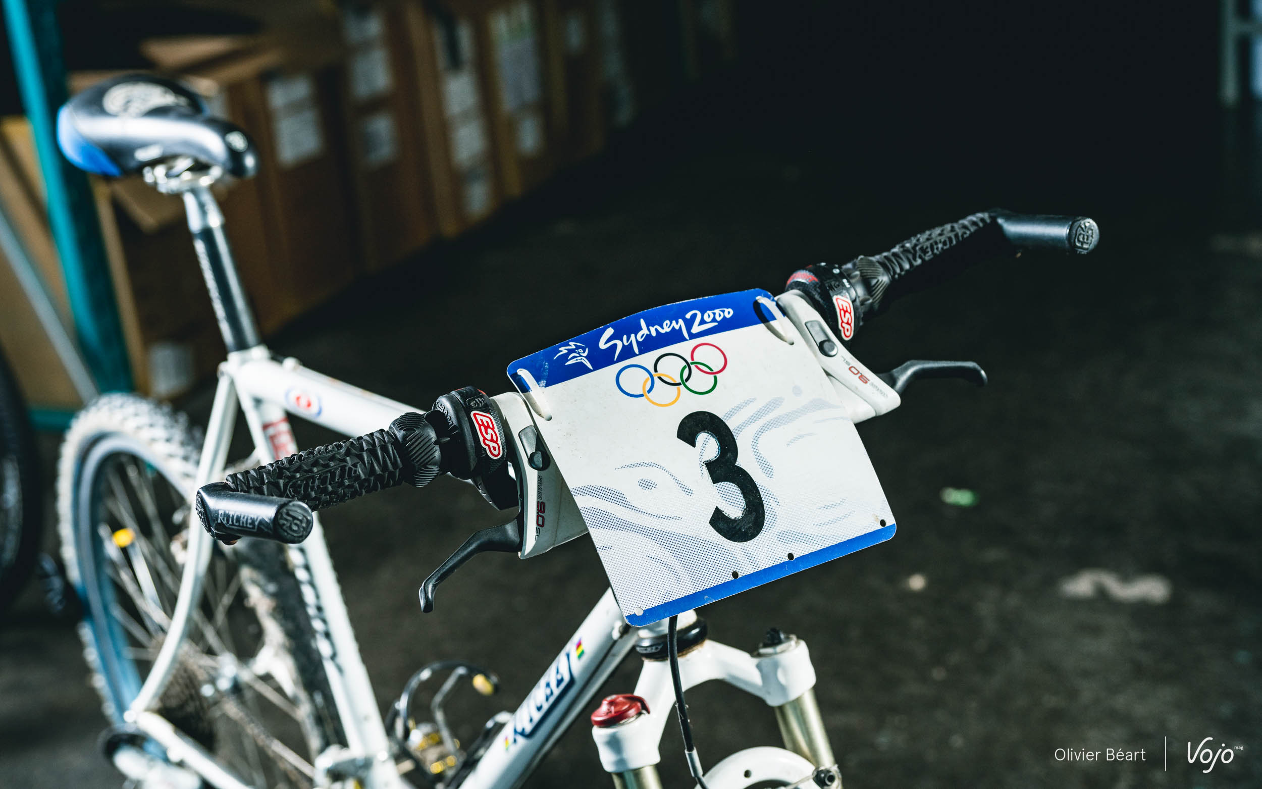 Avant de nous lancer dans les vélos de Nino Schurter, Yanick tient à nous montrer deux des rares vélos que Frischi a conservés de sa riche carrière. Rappelons qu’il est toujours 3e au classement du plus grand nombre de victoires en coupe du monde XC hommes derrière Nino Schurter et Julien Absalon (33) avec pas moins de 17 succès ! Pourtant, ce n’est pas un vélo victorieux en coupe du monde qu’il nous sort de son chapeau, mais le Ritchey Plexus roulé par son « boss » aux Jeux Olympiques de Sydney en 2000, où il a décroché la 6e place.