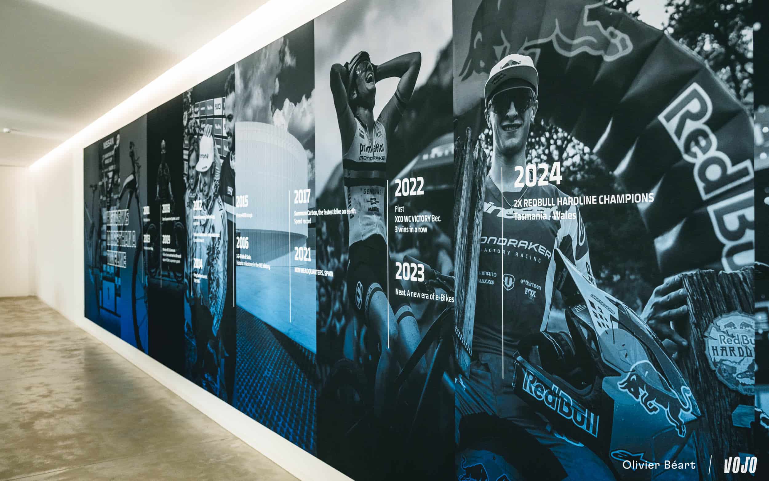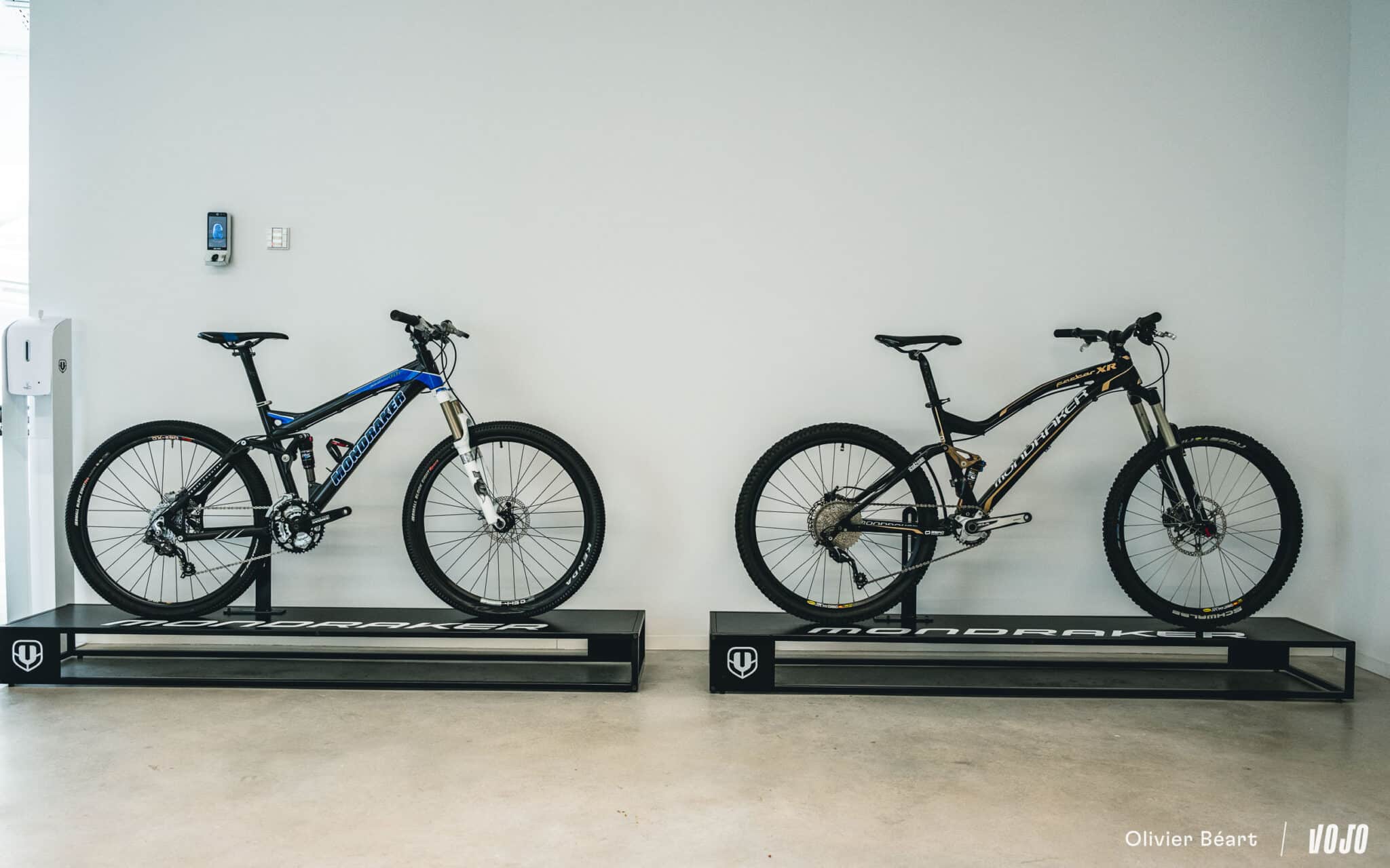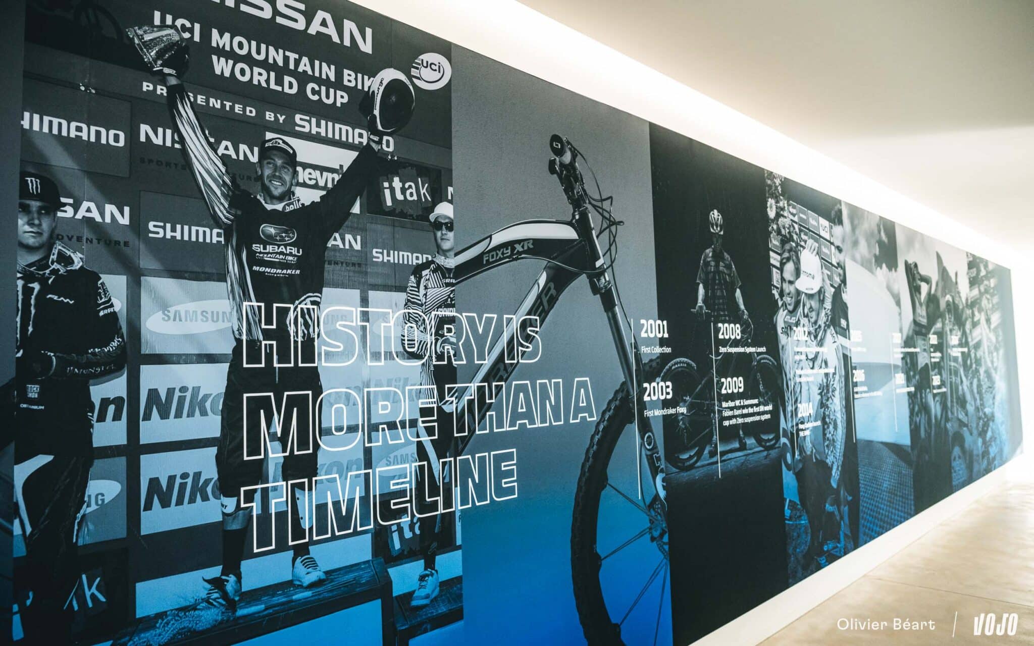 Quand on pousse la porte du siège ultra-moderne de la marque, les références à son passé sont nombreuses. On parie que bien peu d’entre vous le savent mais Mondraker est une marque jeune. Très jeune même, puisque le premier vélo de la marque date de 2001 et sa première gamme complète de 2002 ! Pourtant, elle a déjà une histoire riche et dense, tant en compétition que du côté des innovations techniques.