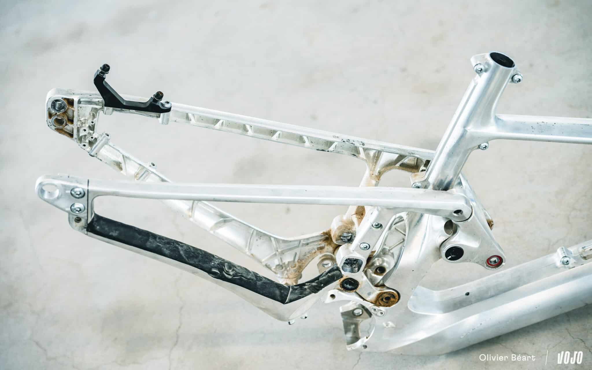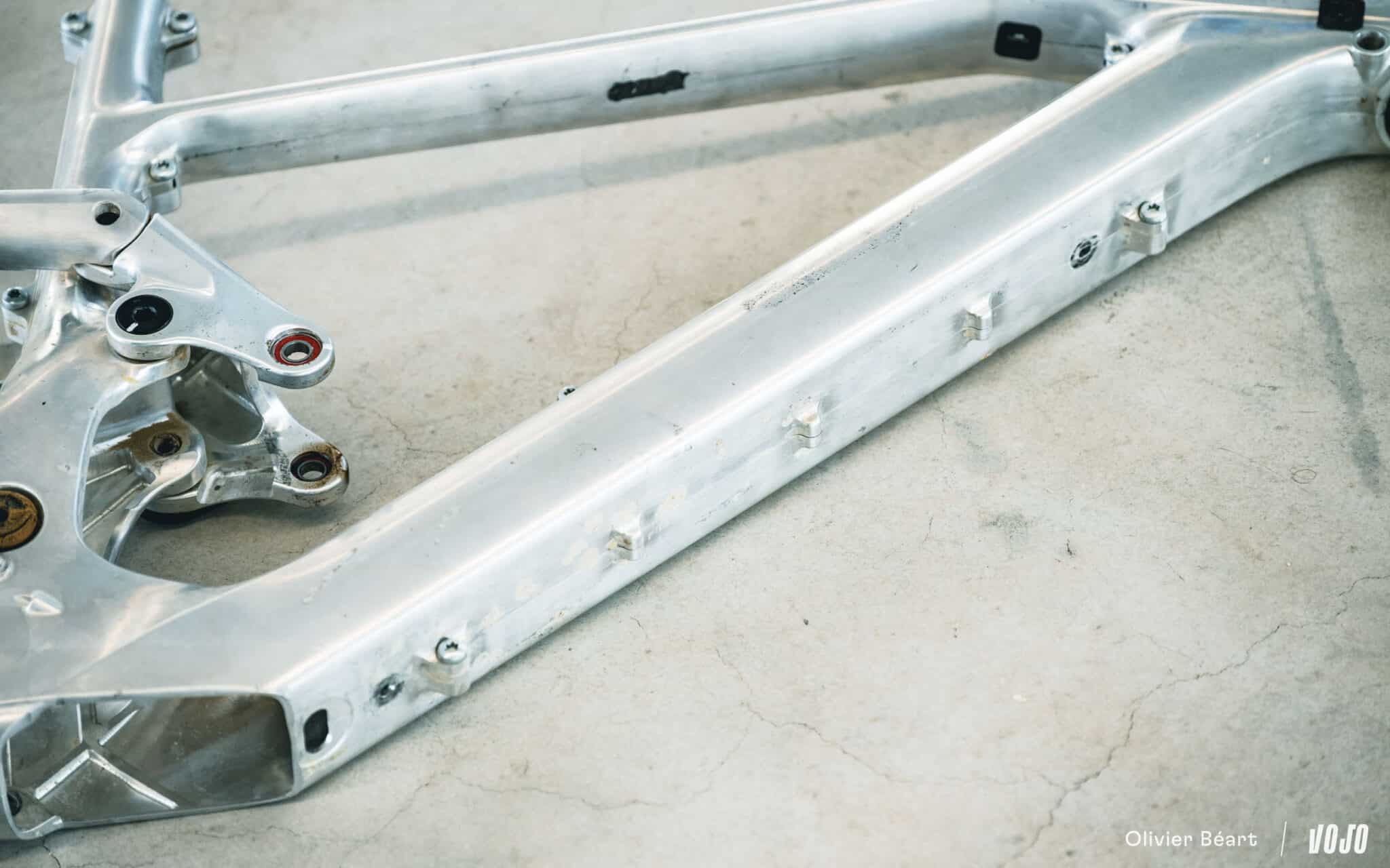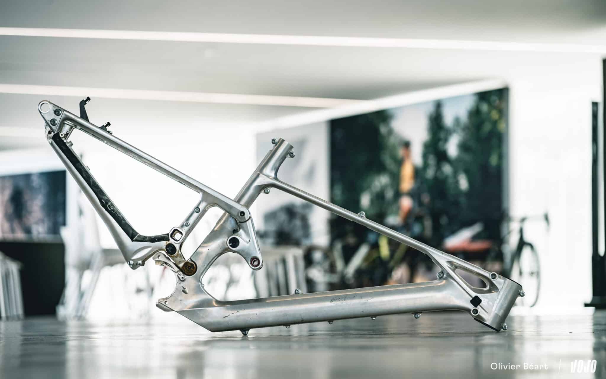 « Cette « mule » est faite de deux coques d’aluminium rivetées l’une à l’autre, avec énormément de choses qui sont adaptables. Bien sûr, ce châssis est plus lourd qu’un cadre de série, mais il roule et cela nous permet de tester différents réglages de suspension, la géométrie (reach, angle de direction, longueur de bases,…) et aussi de nouveaux moteurs quand il s’agit d’e-bikes. »