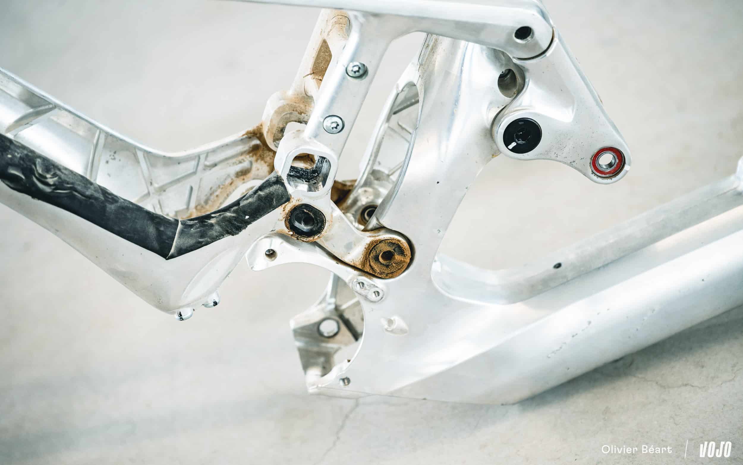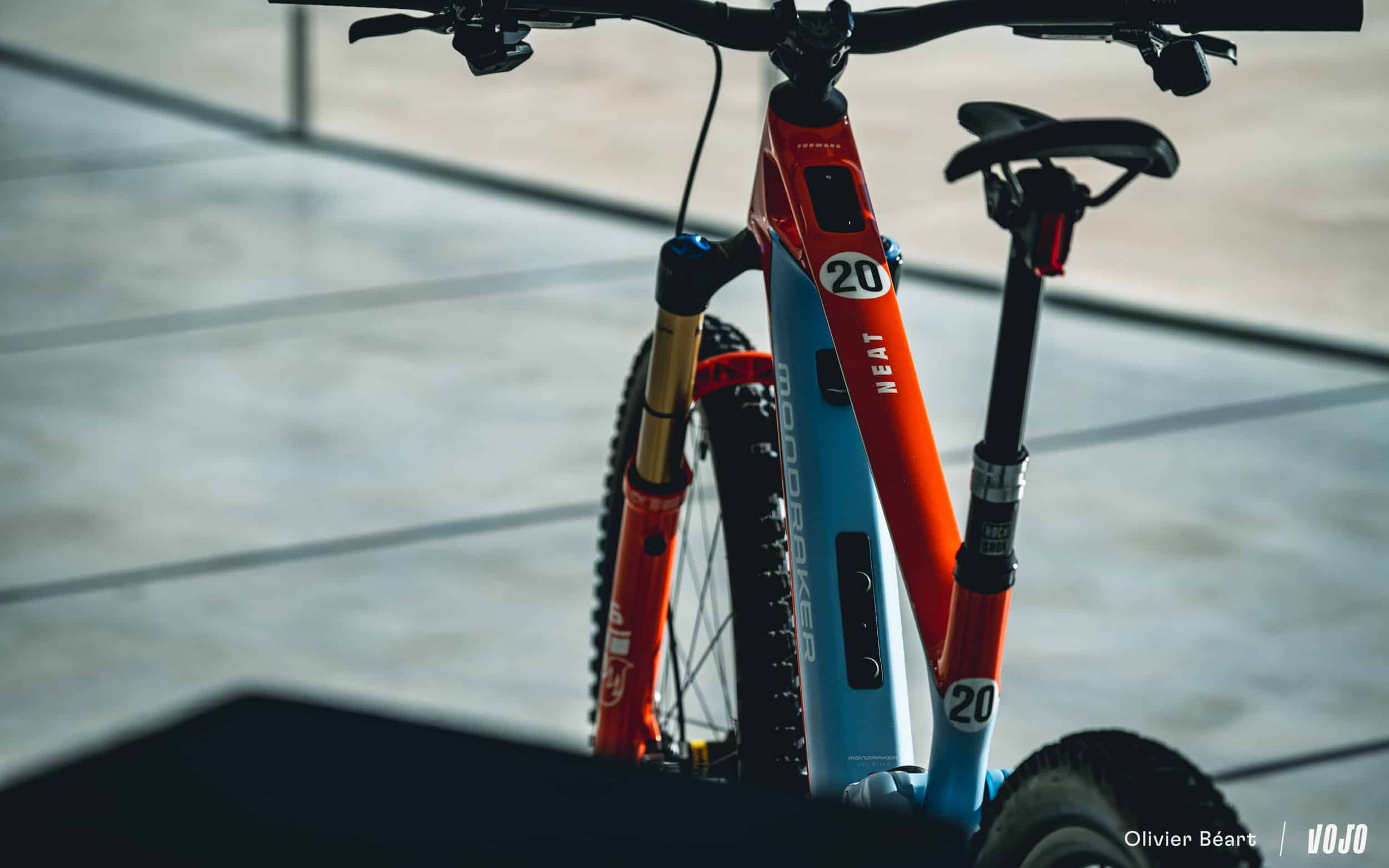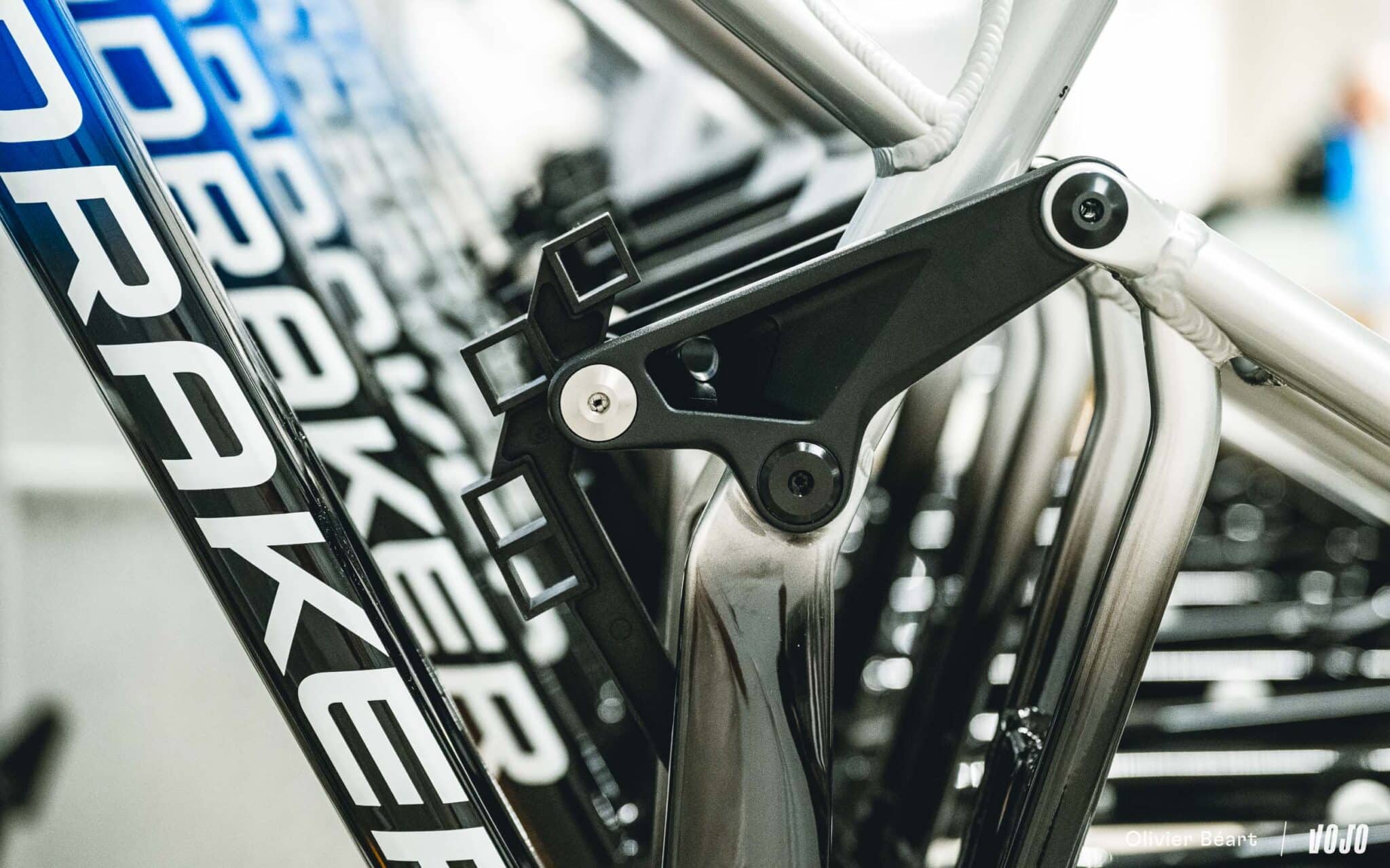 « Cette « mule » est faite de deux coques d’aluminium rivetées l’une à l’autre, avec énormément de choses qui sont adaptables. Bien sûr, ce châssis est plus lourd qu’un cadre de série, mais il roule et cela nous permet de tester différents réglages de suspension, la géométrie (reach, angle de direction, longueur de bases,…) et aussi de nouveaux moteurs quand il s’agit d’e-bikes. »