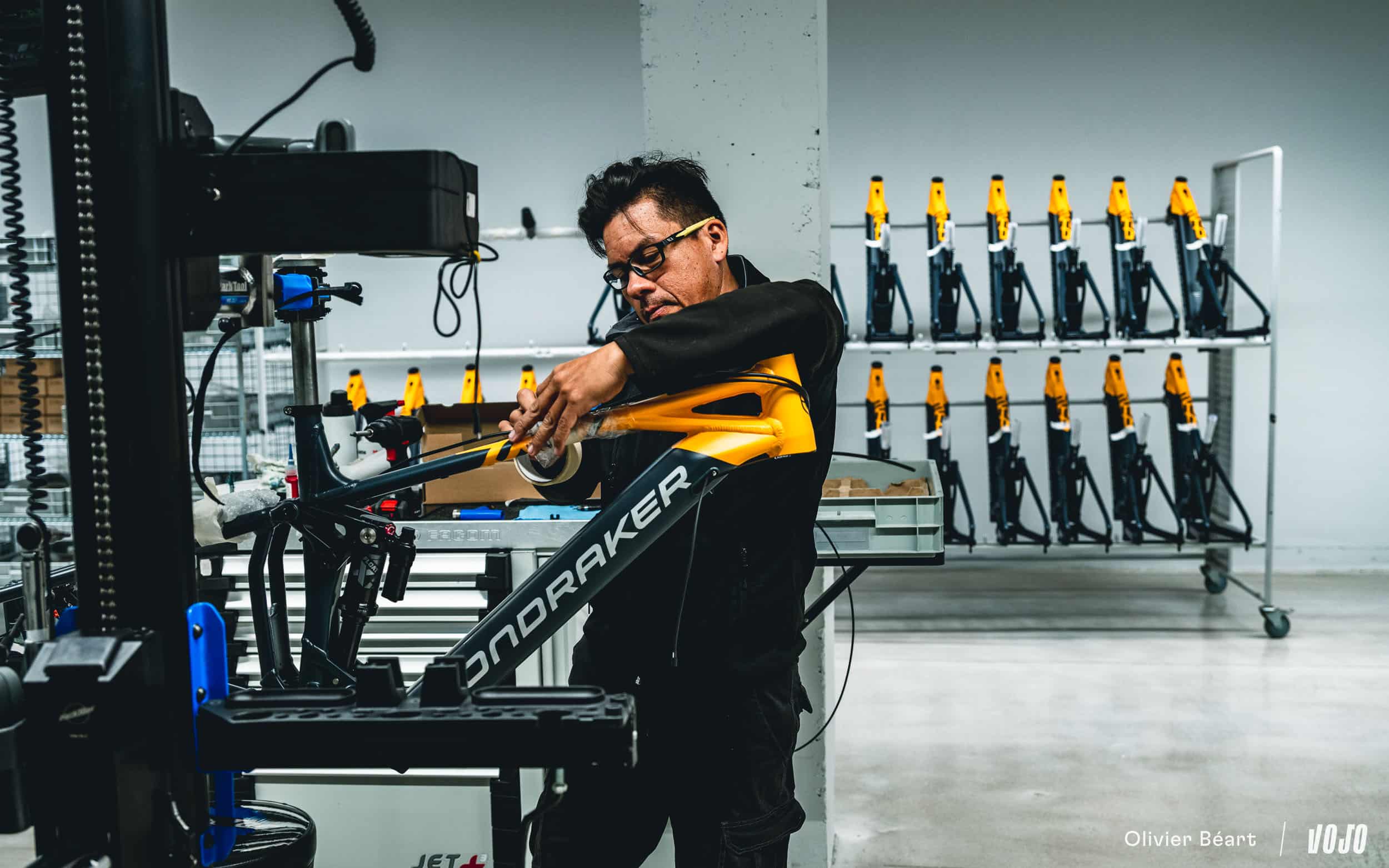 Réception des cadres et contrôle qualité, préparation des composants et enfin montage et emballage : la recette est connue et pas vraiment spécifique à Mondraker, mais on a noté un contraste entre l’atmosphère quasiment clinique des lieux et l’ambiance plutôt détendue sur les chaînes de montage.