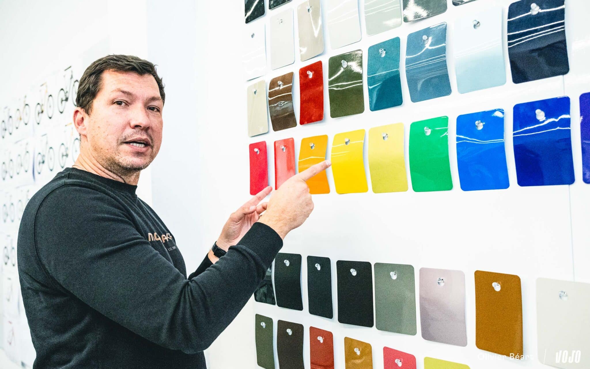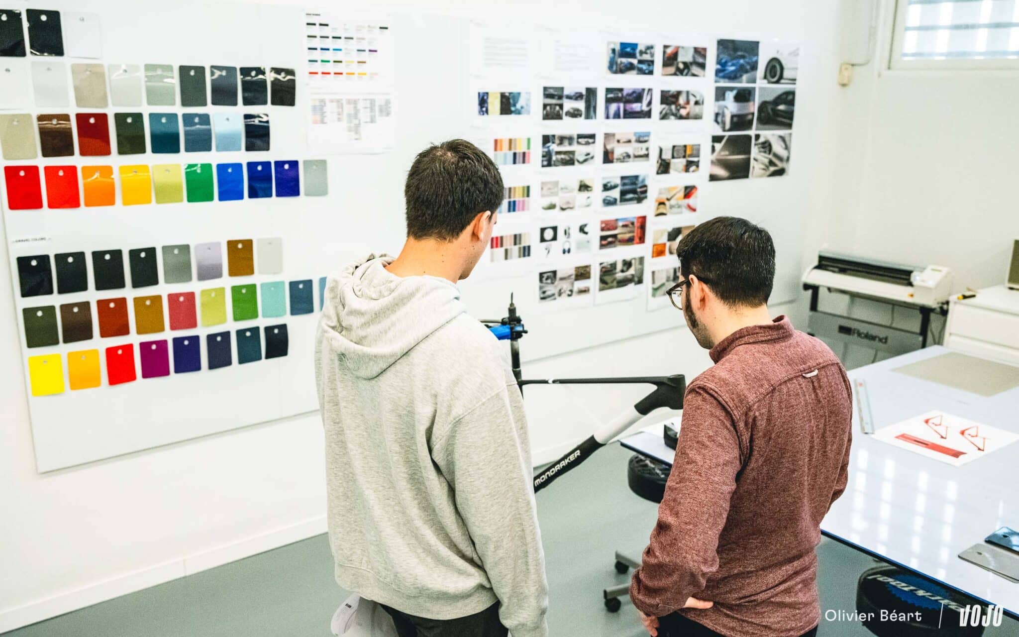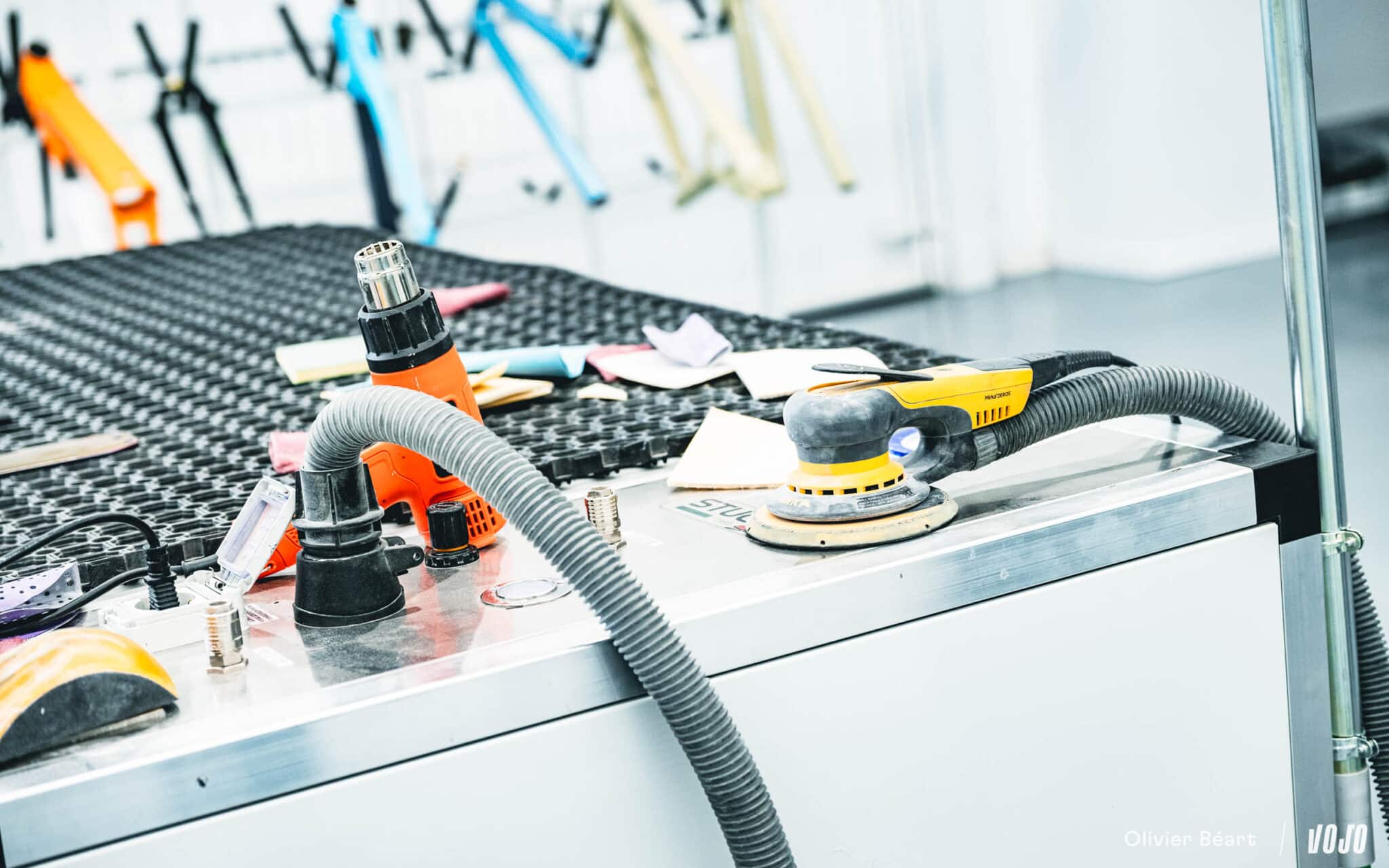 Pour terminer notre visite, nous nous rendons dans un deuxième bâtiment, situé à quelques centaines de mètres du premier. Plus discret, il abrite toute la partie design et création de la marque, mais aussi une cabine de peinture et un atelier de réparation et prototypage. C’est le « Blue Lab ».