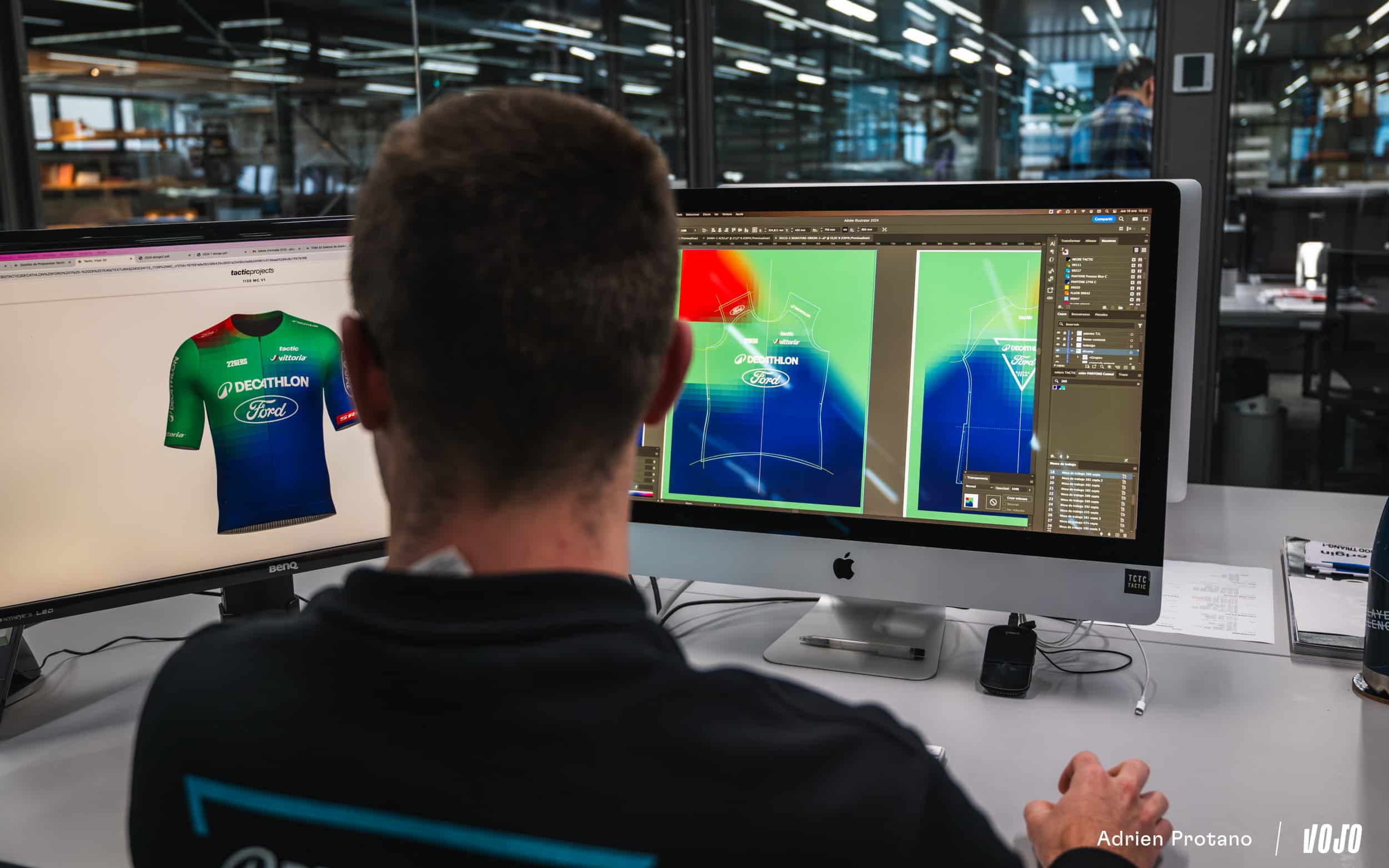 C’est notamment Tactic qui est derrière les tenues du Decathlon Ford Racing Team depuis ces deux dernières années. Que ce soit pour les équipes professionnelles sponsorisées par la marque ou pour le commun des mortels, tout démarre ici, au stade de l’idée et de la conception graphique. Le client envoie son idée et les graphistes de la marque créent un modèle 3D, avant d’échanger avec le client sur les éventuelles modifications.