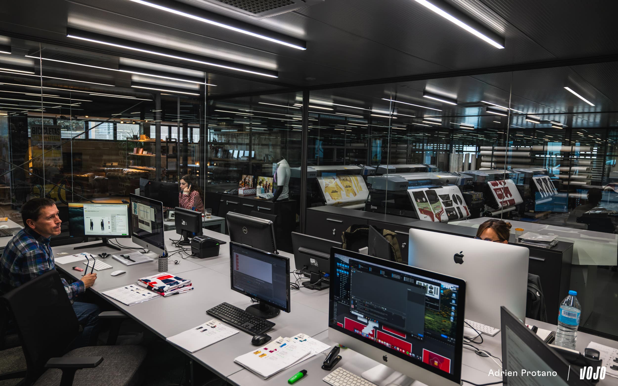 L’étape suivante est encore digitale : dans ce bureau, on est en charge des grandes imprimantes que vous pouvez apercevoir en arrière-plan.