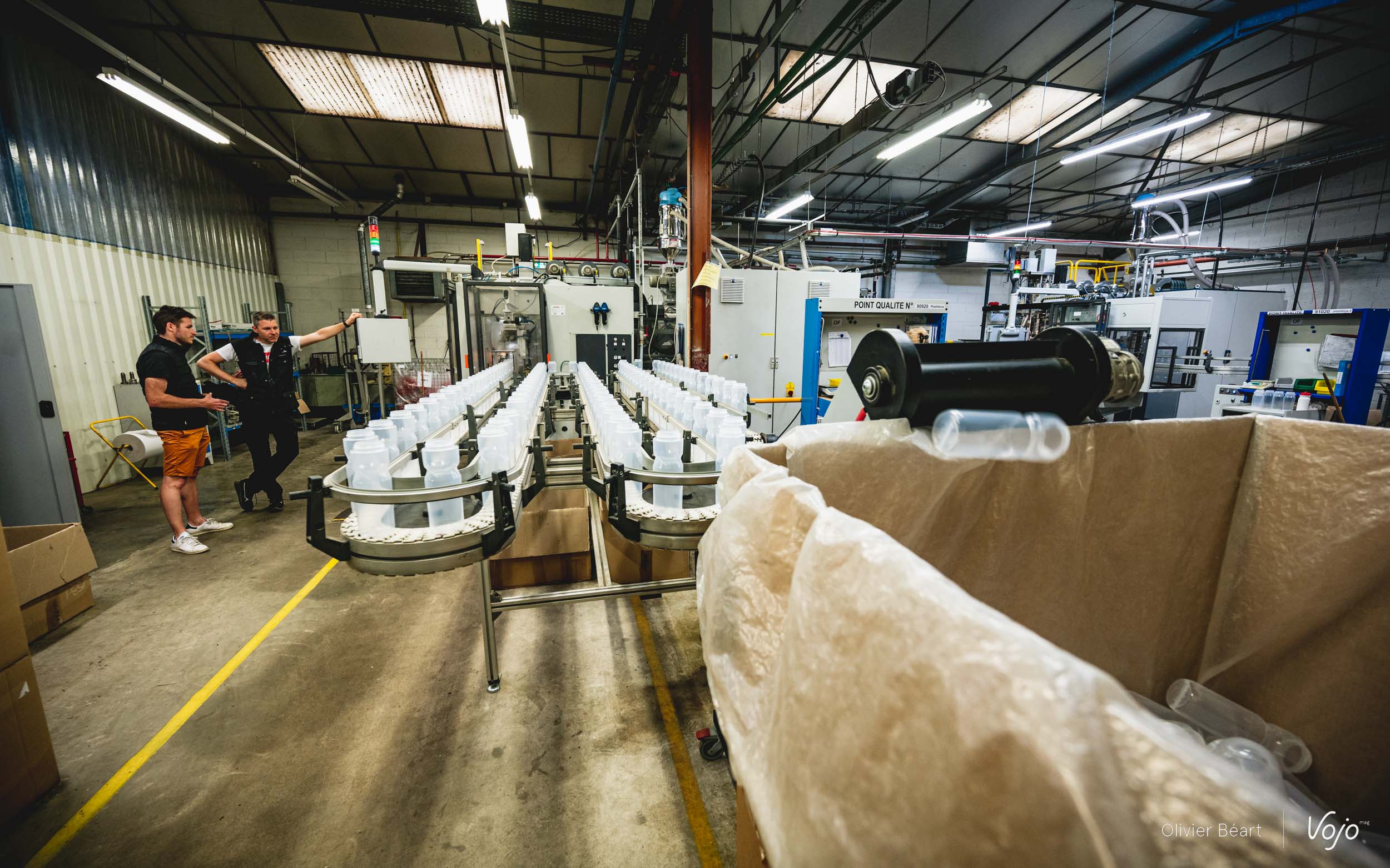 Changement d’ambiance, avec la partie dédiée à la production de bidons, une des plus importantes activités de Zéfal, pour laquelle on retrouve essentiellement des machines dernier cri. Ce beau bébé peut sortir jusque 400 bidons par heure, avec un procédé d’extrusion/soufflage du polypropylène. Un matériau qui a l’avantage de ne laisser aucune odeur ou goût désagréable au liquide qu’il contient. Une deuxième machine similaire vient d’être acquise pour porter la capacité à 800 bidons/heure.
