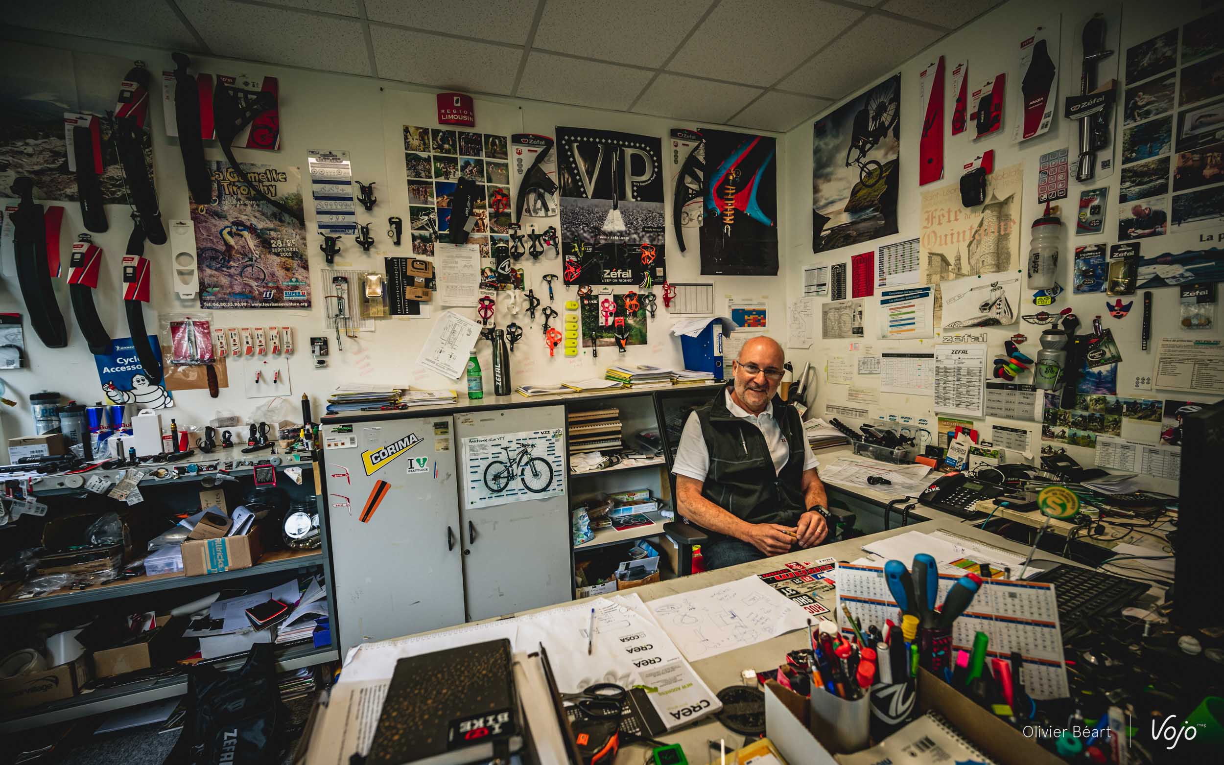 C’est aussi lui qui est en charge des tests. « Nous avons des machines assez perfectionnées, comme ce simulateur de roulage que nous avons développé avec Aivee (marque française de moyeux) pour tester nos fonds de jante, nos kits de réparation tubeless et d’autres produits liés aux roues. Mais nous avons aussi des solutions qui peuvent paraître un peu archaïques, mais qui sont en réalité redoutablement efficaces, comme cet ancien cadre attaché au mur et que nous lançons à la main violemment sur le sol de manière répétitive et depuis des hauteurs de plus en plus importantes pour tester par exemple la tenue de notre bagagerie ou de nos porte-bidons, en plus d’une machine à vibrations. Quand nous envoyons nos produits à nos ambassadeurs ou à nos employés cyclistes pour les tests sur le terrain, nous voyons que nous ne nous trompons que rarement avec ce premier essai. »