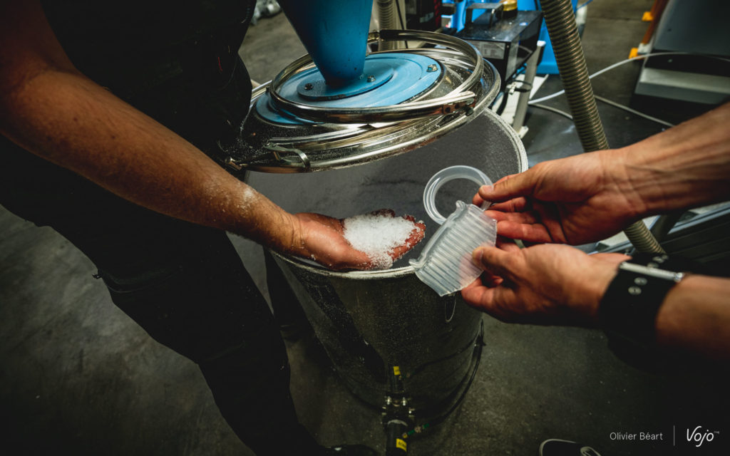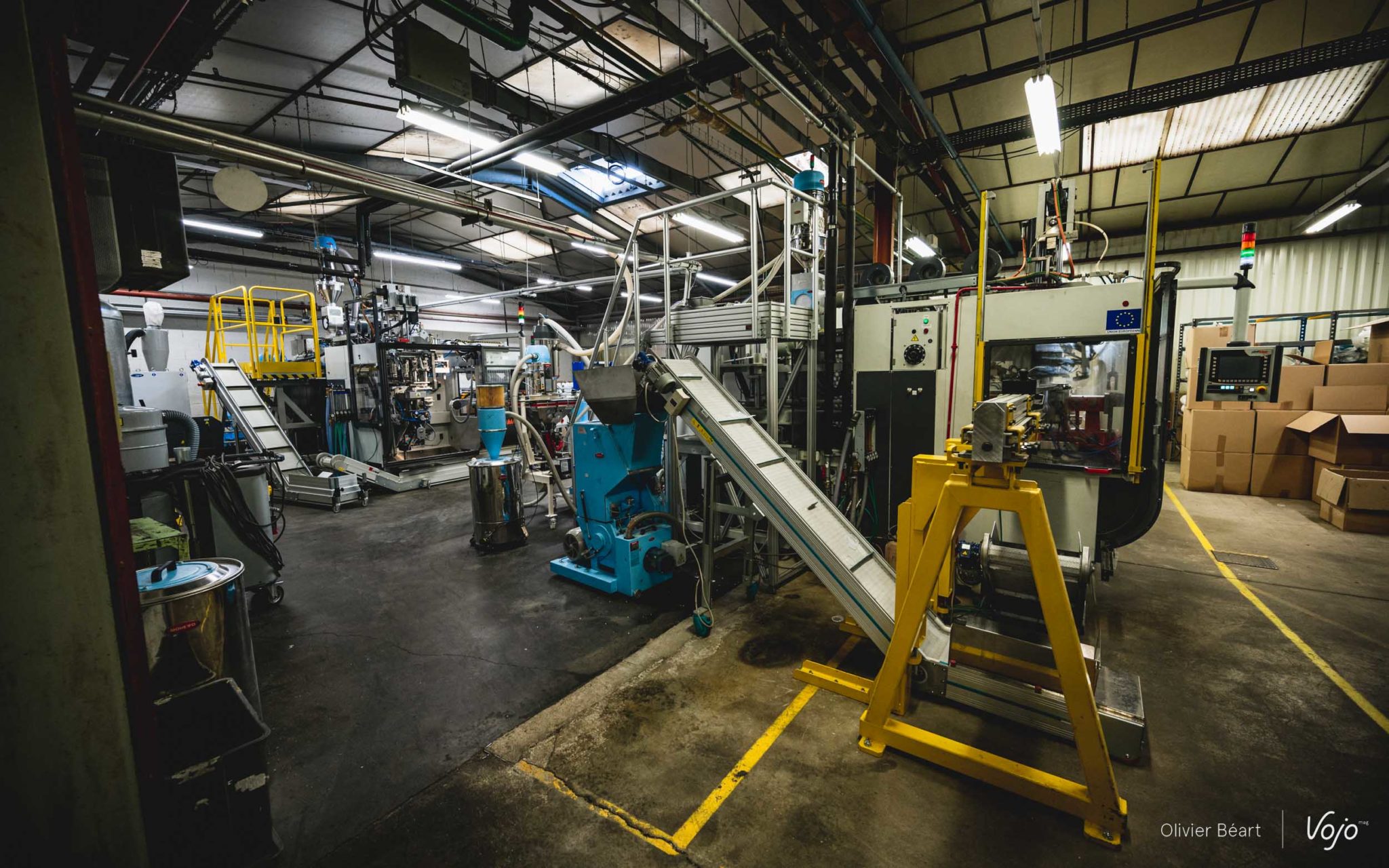 Une des grandes fiertés de l’entreprise est de pouvoir recycler immédiatement ses déchets dans la chaîne de production. Ainsi, les excès de matière sont directement réinjectés selon un pourcentage précis en même temps que la matière première dans la machine.
