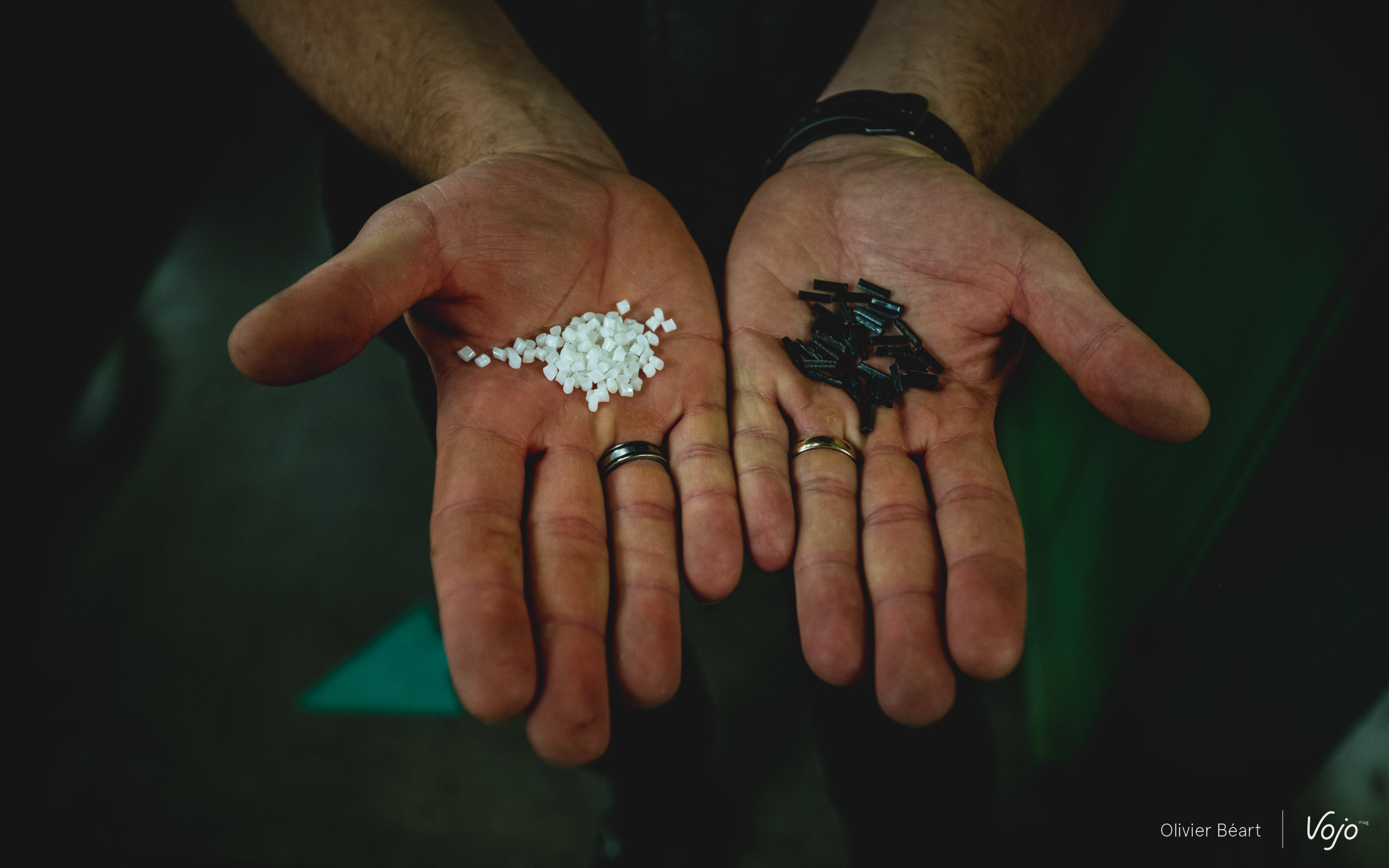 Cette fois, on parle de pièces dont le plastique est enrichi à plus ou moins forte dose de fibres de carbone longues pour les doter de propriétés mécaniques particulières. On voit ici bien la différence entre les petites billes de plastique « pur », destinées à la fabrication des bidons, et les petits tubes allongés enrichis de fibres de carbone. Ici, on voit à droite la matière de base la plus haut de gamme, destinée à la fabrication des pièces les plus pointues comme le très léger porte-bidon Pulse L2.