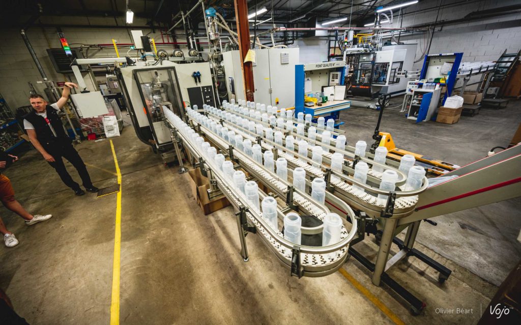 Changement d’ambiance, avec la partie dédiée à la production de bidons, une des plus importantes activités de Zéfal, pour laquelle on retrouve essentiellement des machines dernier cri. Ce beau bébé peut sortir jusque 400 bidons par heure, avec un procédé d’extrusion/soufflage du polypropylène. Un matériau qui a l’avantage de ne laisser aucune odeur ou goût désagréable au liquide qu’il contient. Une deuxième machine similaire vient d’être acquise pour porter la capacité à 800 bidons/heure.