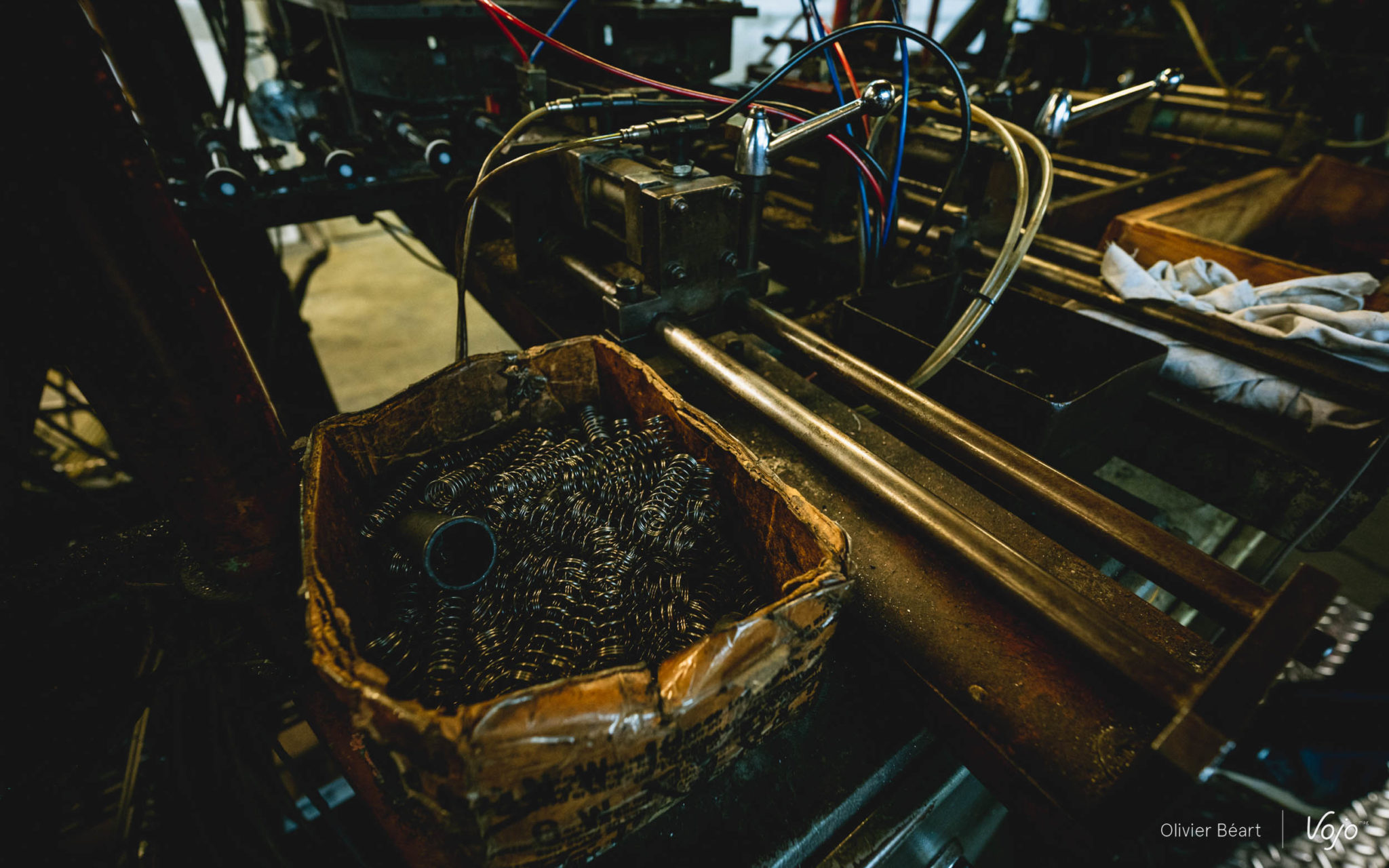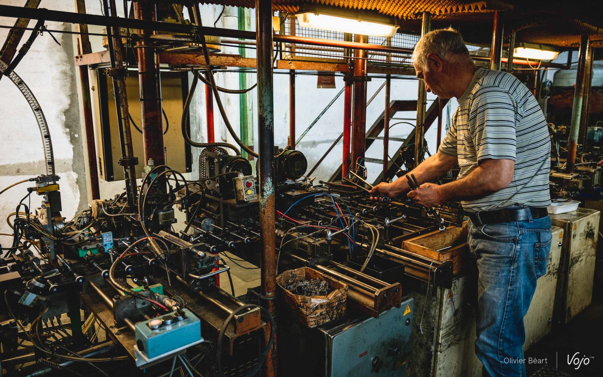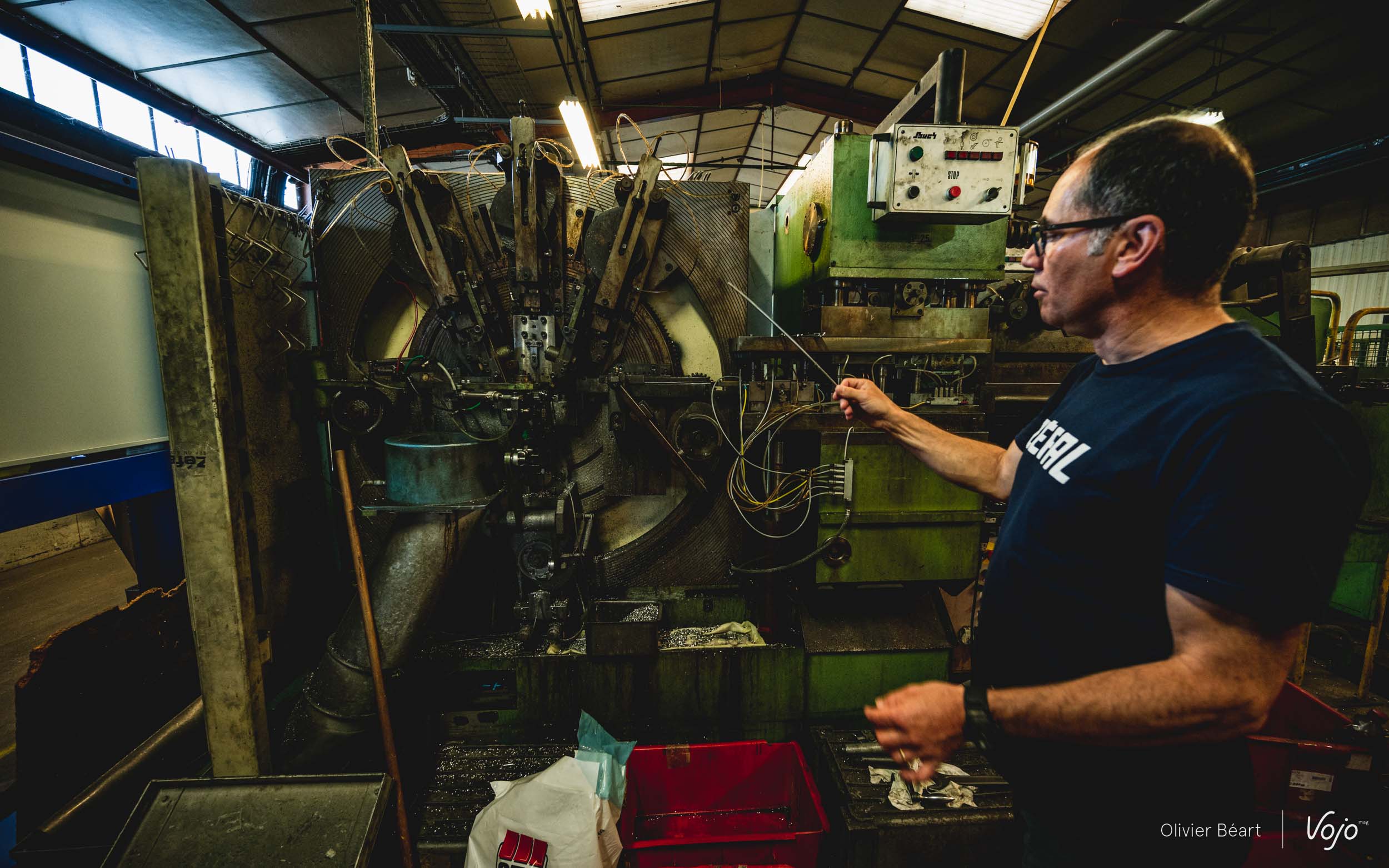 Avant de nous présenter une petite surprise et d’en finir avec la partie « production », Franck tient à nous montrer les plus anciennes machines de l’entreprise, comme celle-ci qui sert à fabriquer les porte-bidons classiques en fil de métal cintré…