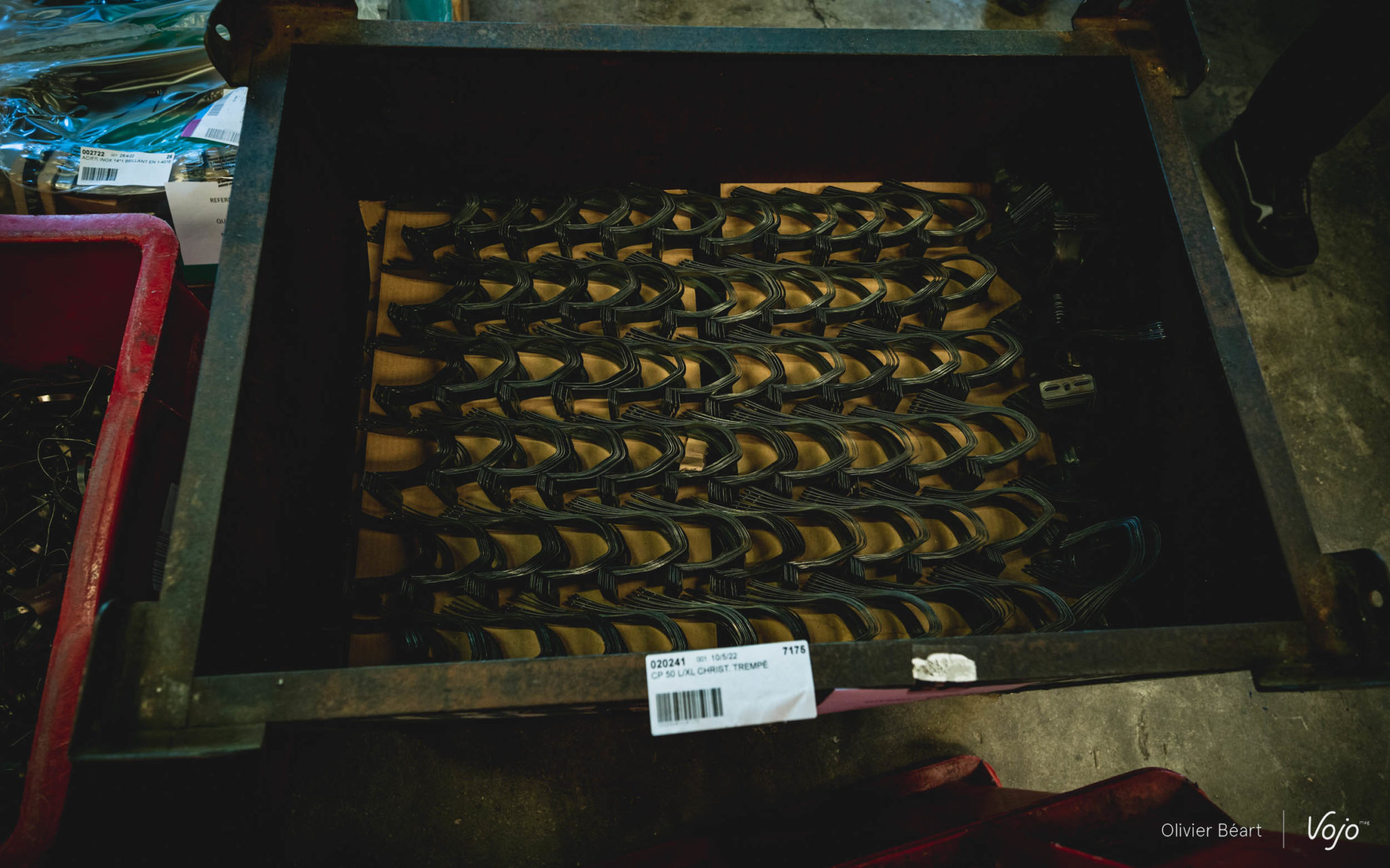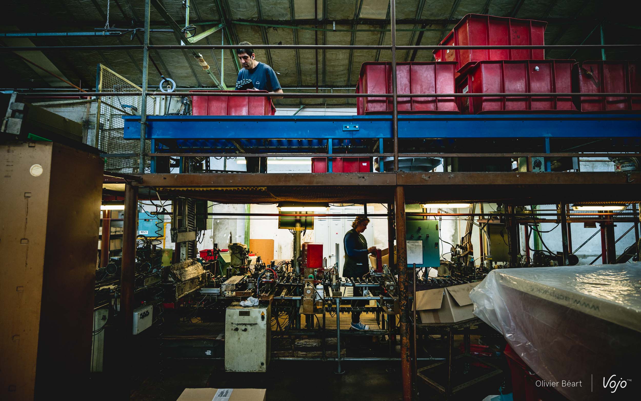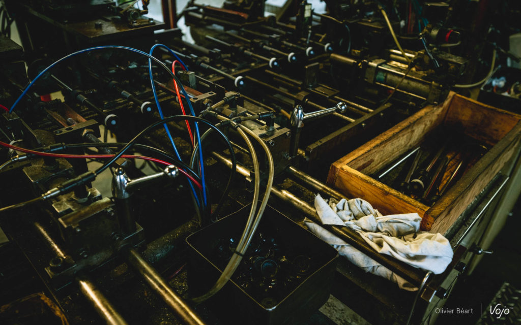 Avant de nous présenter une petite surprise et d’en finir avec la partie « production », Franck tient à nous montrer les plus anciennes machines de l’entreprise, comme celle-ci qui sert à fabriquer les porte-bidons classiques en fil de métal cintré…