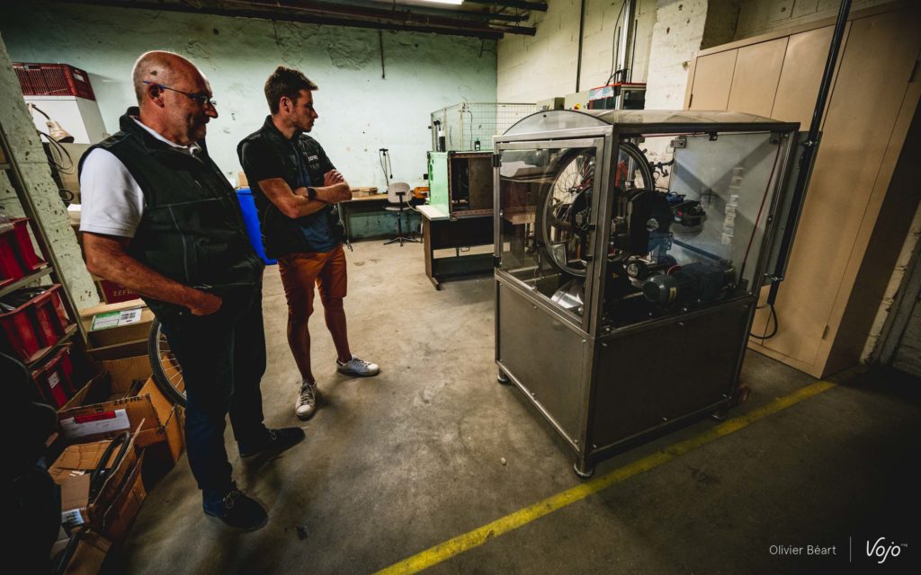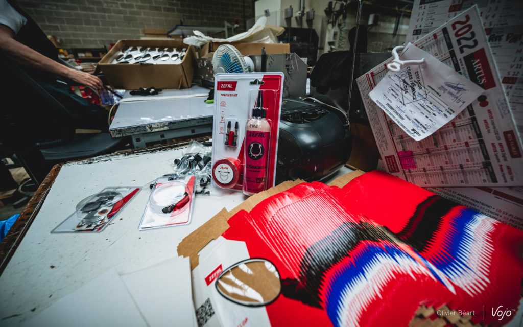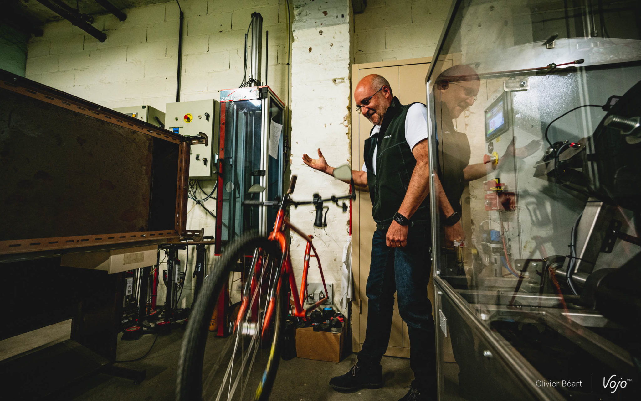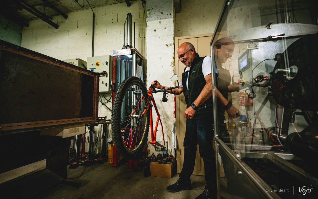 C’est aussi lui qui est en charge des tests. « Nous avons des machines assez perfectionnées, comme ce simulateur de roulage que nous avons développé avec Aivee (marque française de moyeux) pour tester nos fonds de jante, nos kits de réparation tubeless et d’autres produits liés aux roues. Mais nous avons aussi des solutions qui peuvent paraître un peu archaïques, mais qui sont en réalité redoutablement efficaces, comme cet ancien cadre attaché au mur et que nous lançons à la main violemment sur le sol de manière répétitive et depuis des hauteurs de plus en plus importantes pour tester par exemple la tenue de notre bagagerie ou de nos porte-bidons, en plus d’une machine à vibrations. Quand nous envoyons nos produits à nos ambassadeurs ou à nos employés cyclistes pour les tests sur le terrain, nous voyons que nous ne nous trompons que rarement avec ce premier essai. »