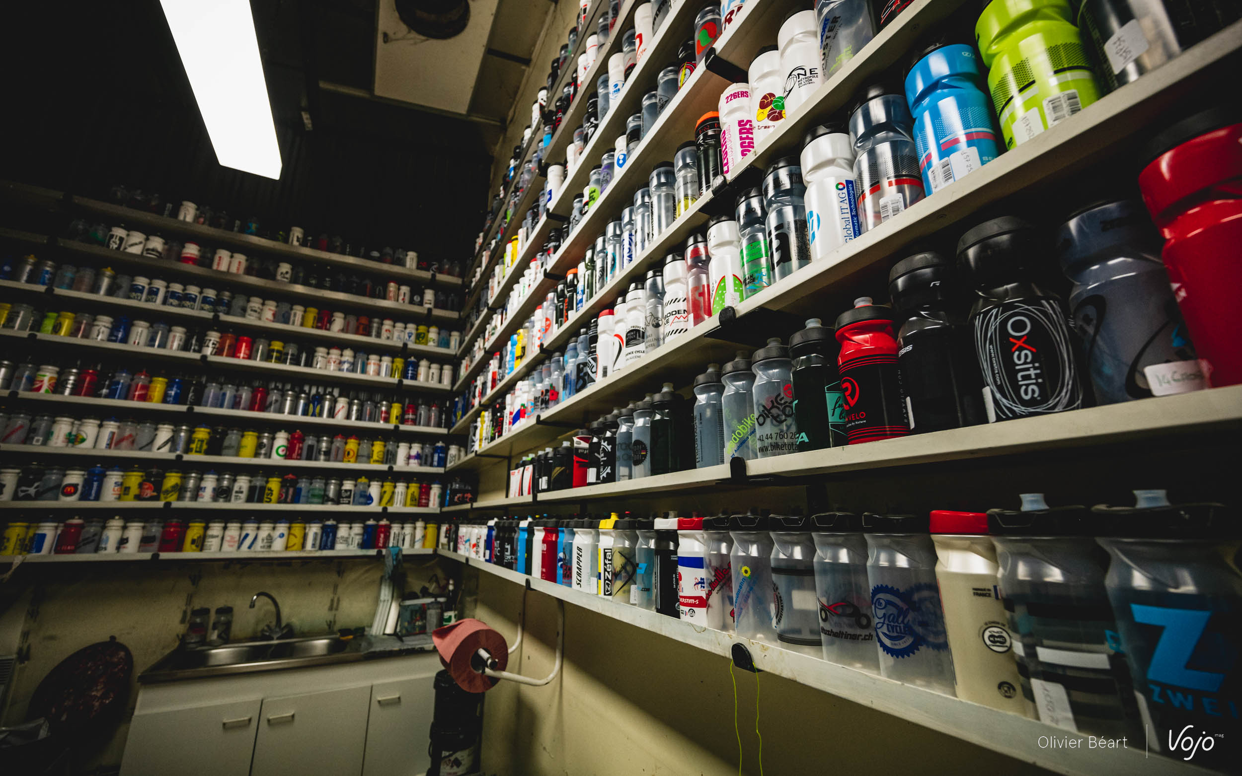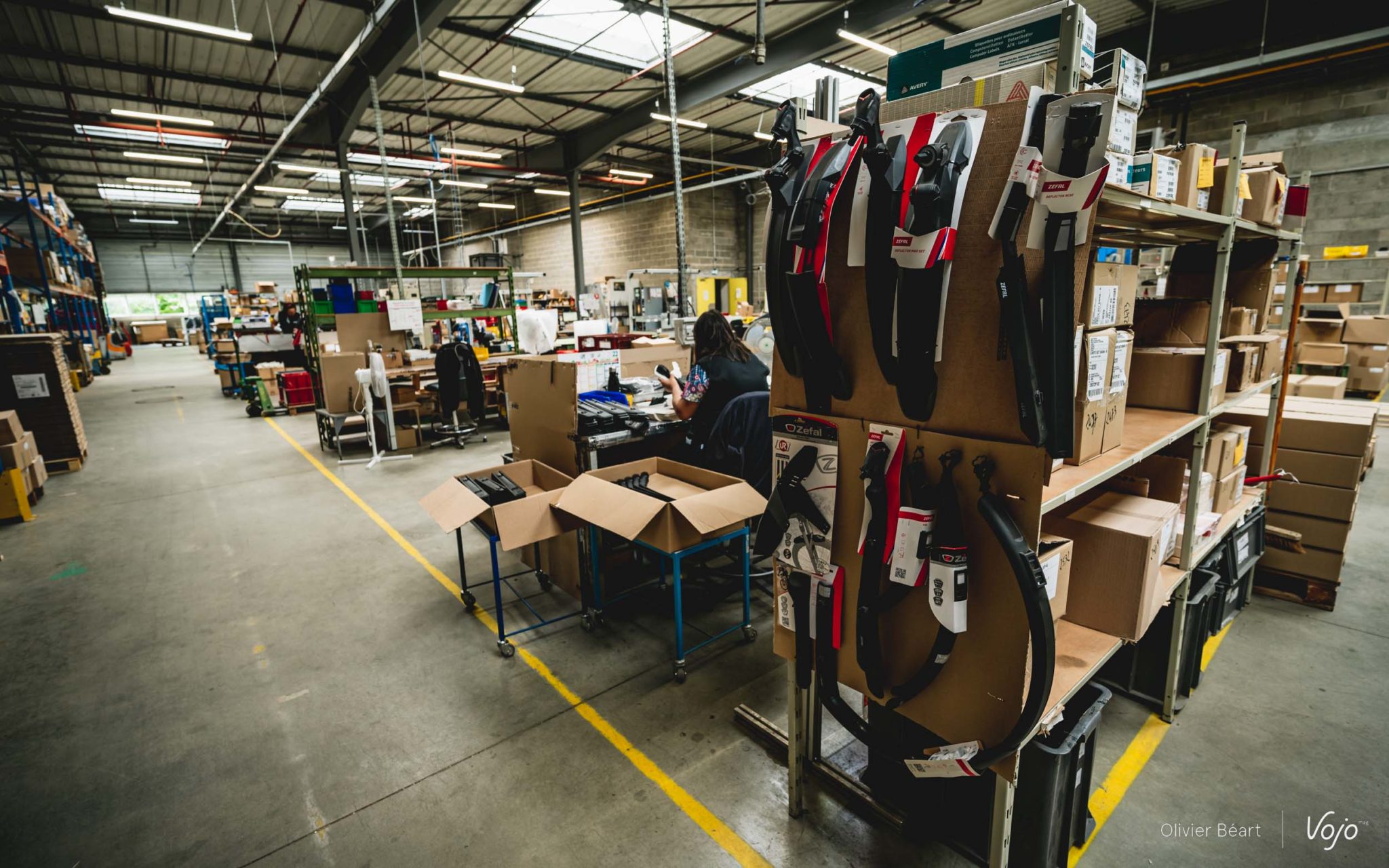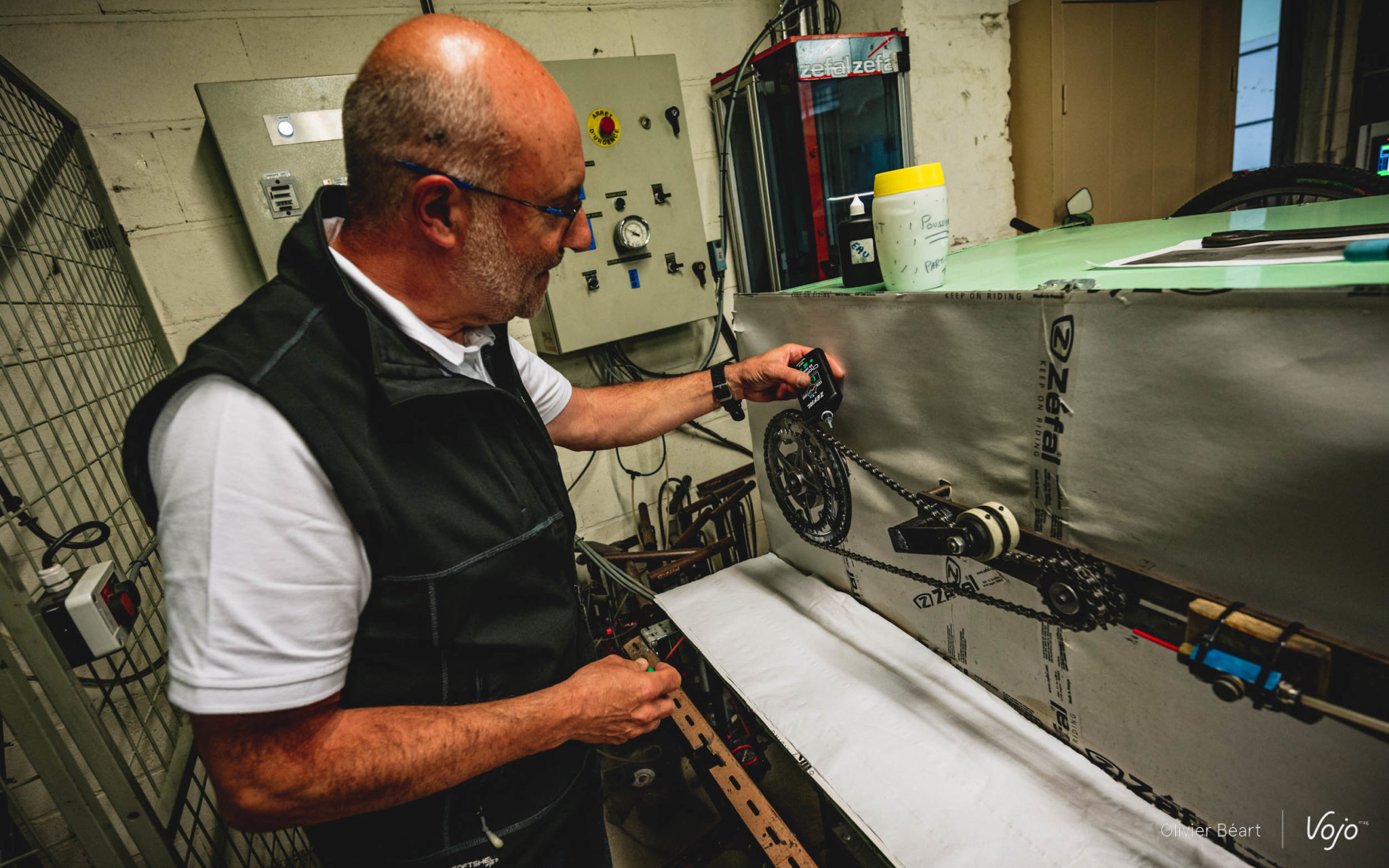 C’est aussi lui qui est en charge des tests. « Nous avons des machines assez perfectionnées, comme ce simulateur de roulage que nous avons développé avec Aivee (marque française de moyeux) pour tester nos fonds de jante, nos kits de réparation tubeless et d’autres produits liés aux roues. Mais nous avons aussi des solutions qui peuvent paraître un peu archaïques, mais qui sont en réalité redoutablement efficaces, comme cet ancien cadre attaché au mur et que nous lançons à la main violemment sur le sol de manière répétitive et depuis des hauteurs de plus en plus importantes pour tester par exemple la tenue de notre bagagerie ou de nos porte-bidons, en plus d’une machine à vibrations. Quand nous envoyons nos produits à nos ambassadeurs ou à nos employés cyclistes pour les tests sur le terrain, nous voyons que nous ne nous trompons que rarement avec ce premier essai. »