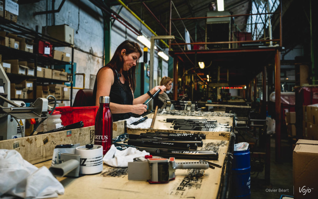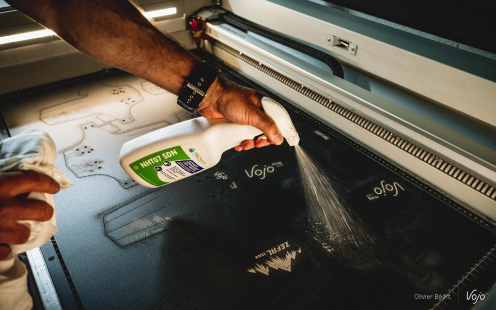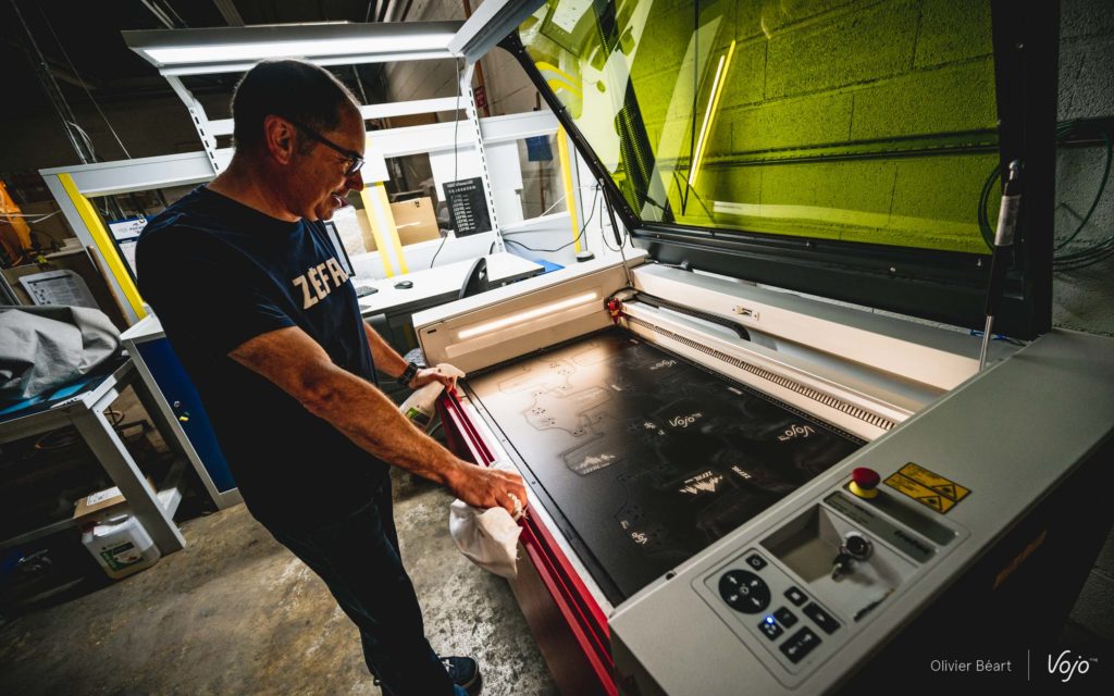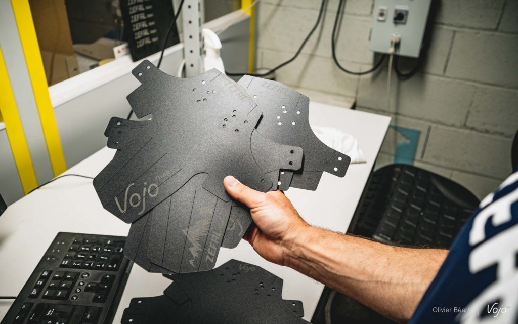 Quant à la petite surprise, c’est que Franck a lancé juste avant le début de notre visite, l’impression de garde-boue VTT légers personnalisés à l’effigie de Vojo. Il s’agit d’un des derniers produits ajoutés au catalogue, et pour lequel Zéfal a ajouté encore un nouvel équipement à son parc de machines déjà très fourni, avec cette graveuse/découpeuse laser.