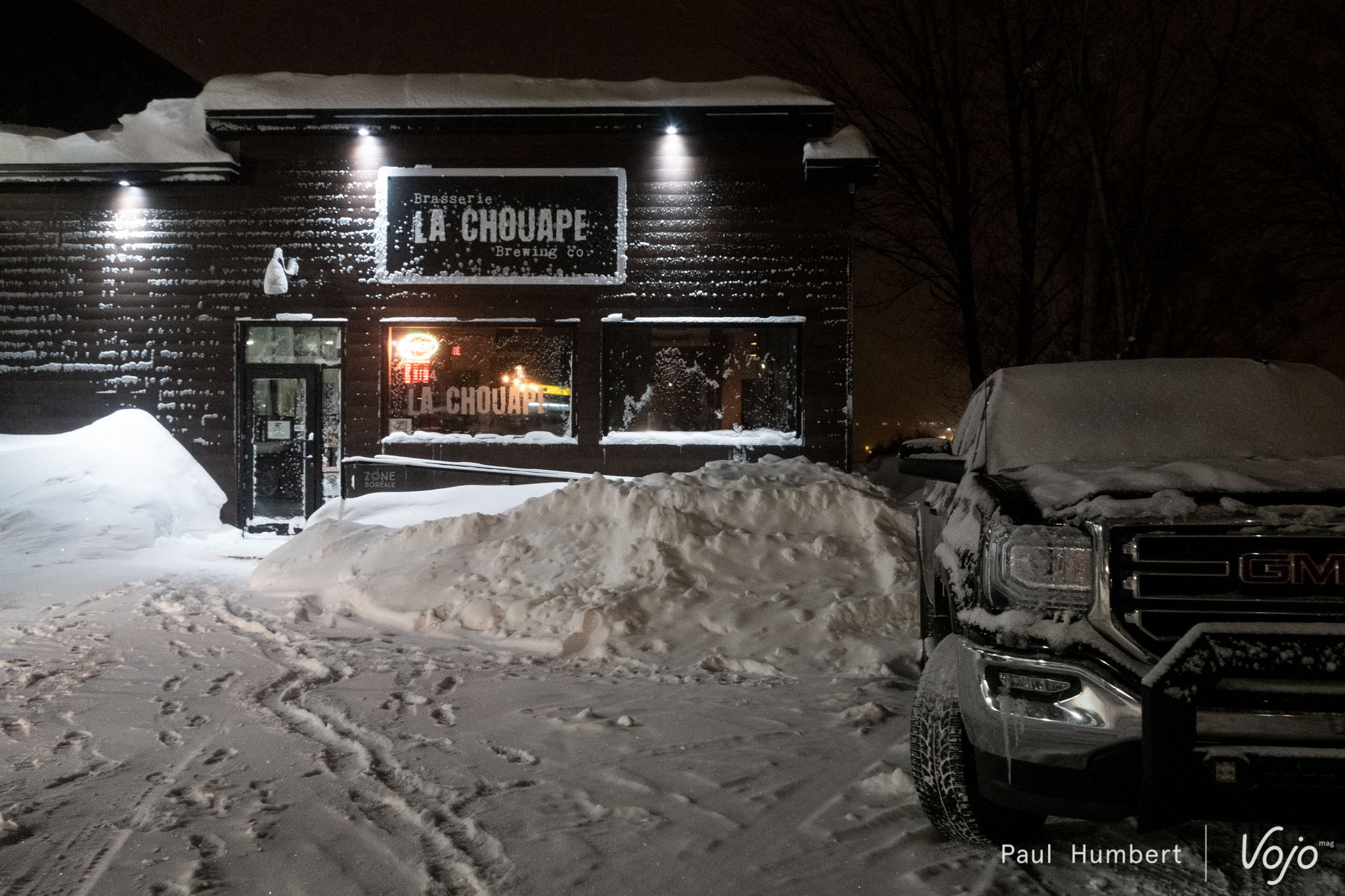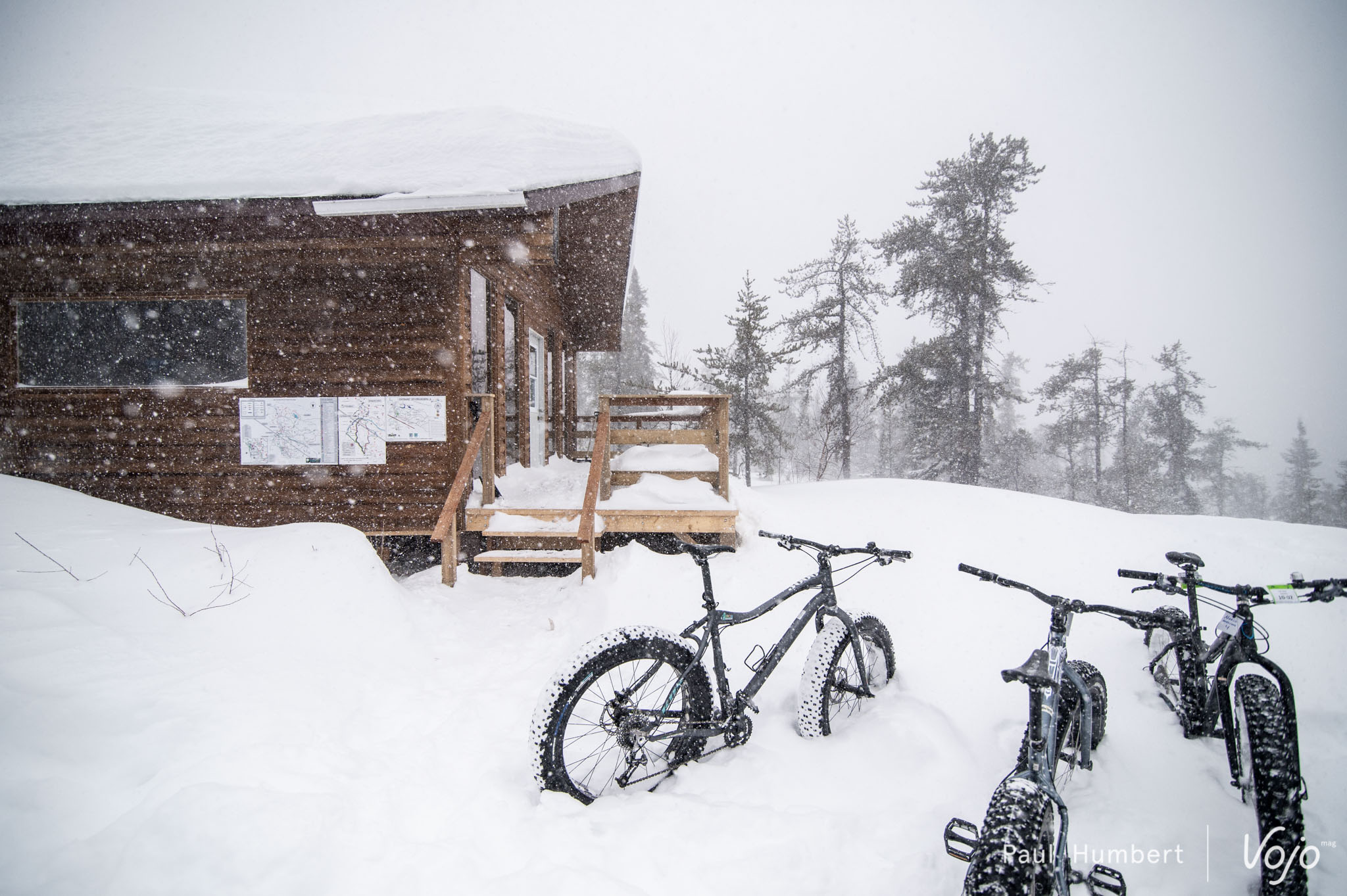 Après une petite excursion sur le lac, vient le temps d’une véritable sortie en fatbike afin d’en découvrir le plein potentiel. Petit bémol dans cette affaire : le Québec est en pleine tempête, certaines écoles et routes sont fermées, et cela n’est pas vraiment inhabituel pour cette région qui compose avec des mètres de neige pendant des mois. Notre équipe de guides expérimentés, des pneus clous et quelques poussées à l’arrière de notre van, et nous voilà partis en direction du Tobo Ski !