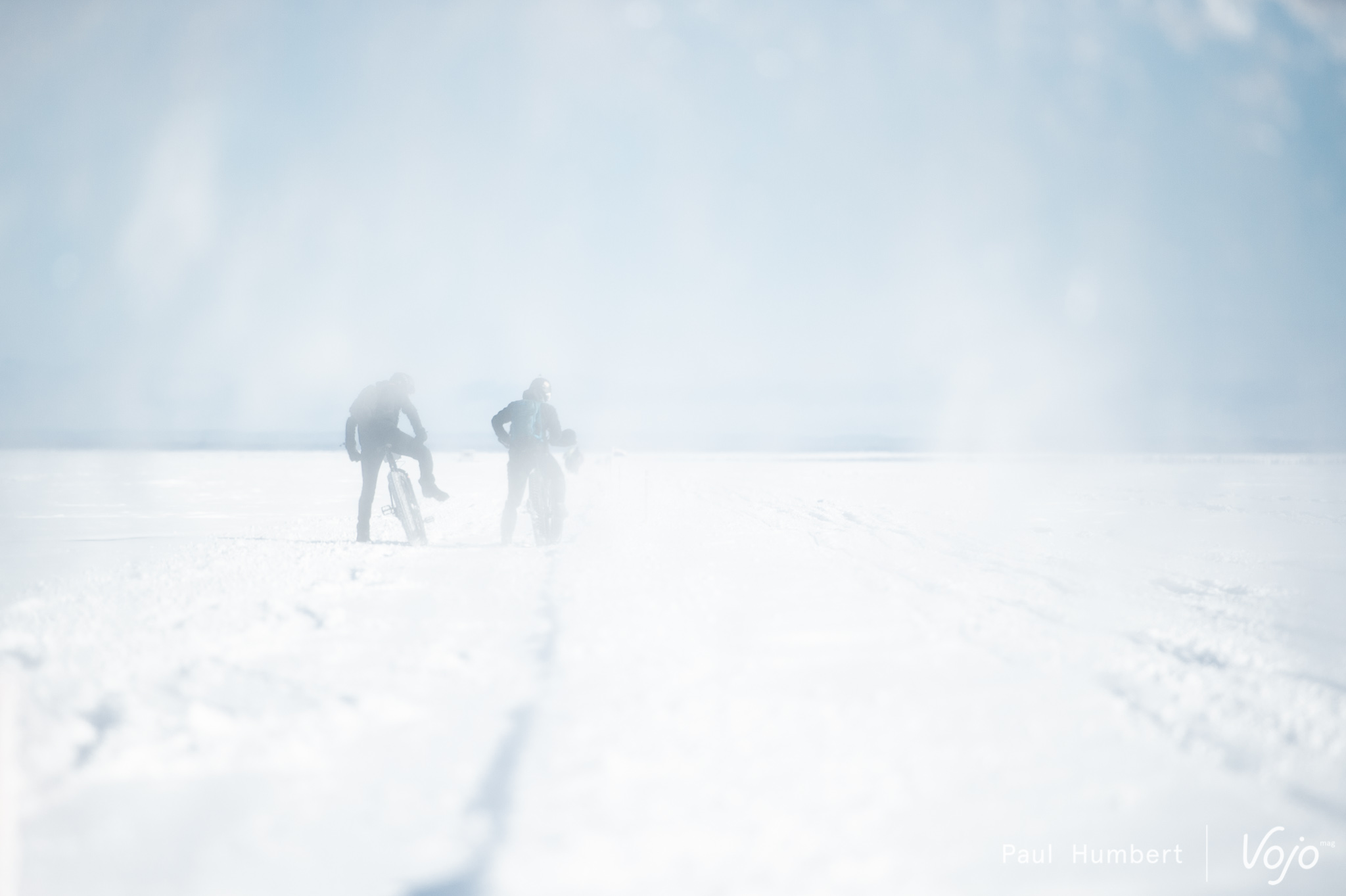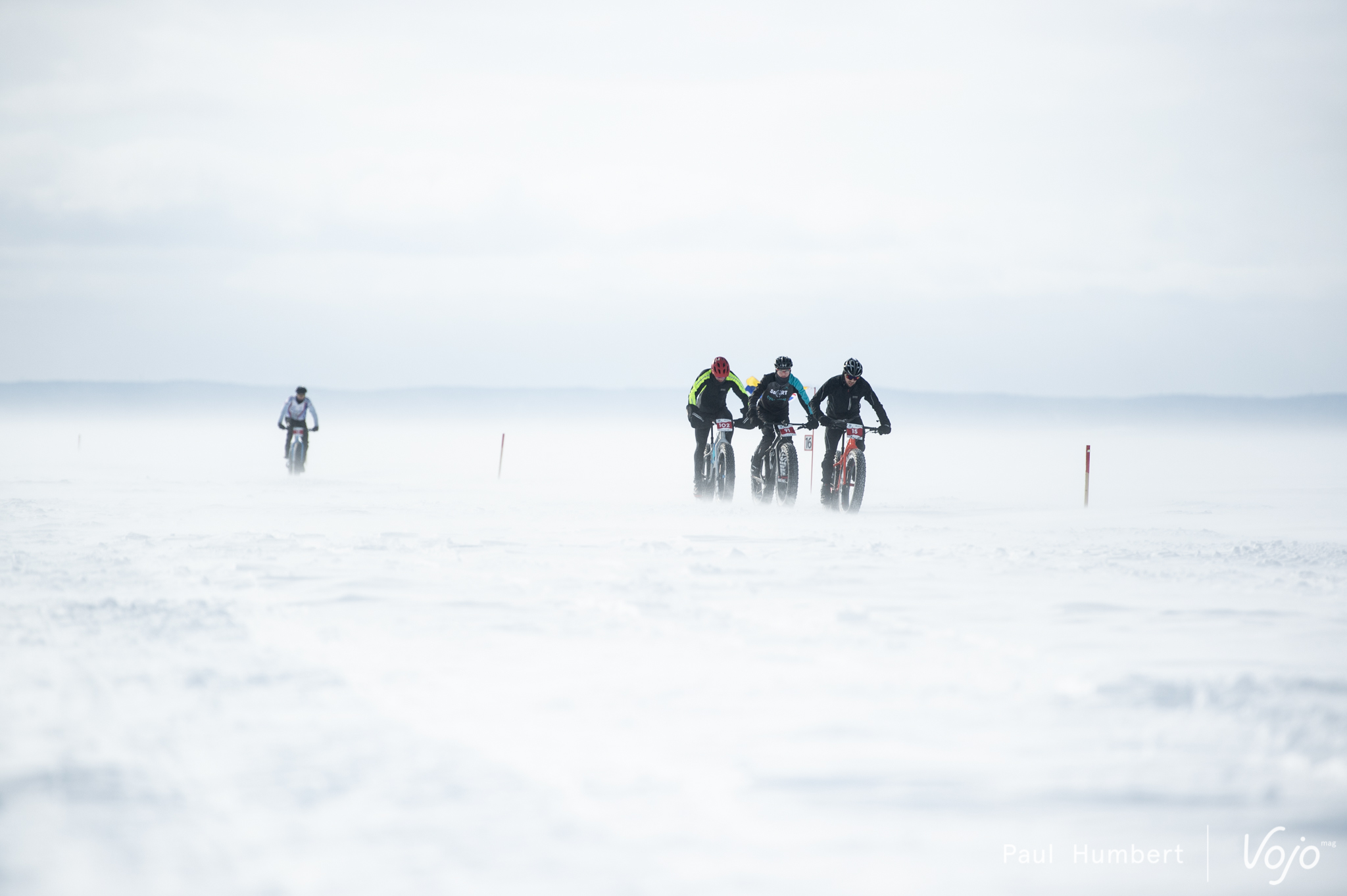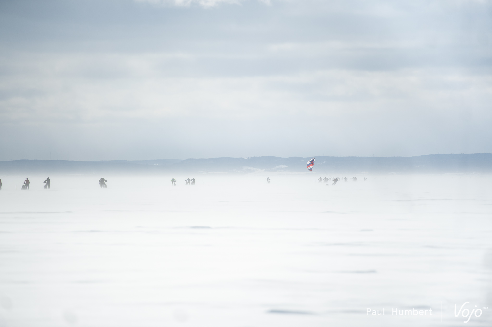 Le vent vient soulever la neige du lac et ce ne sont que des silhouettes qu’on distingue au loin. Le rythme est impressionnant vu les conditions et on dirait un jeu d’enfants.
