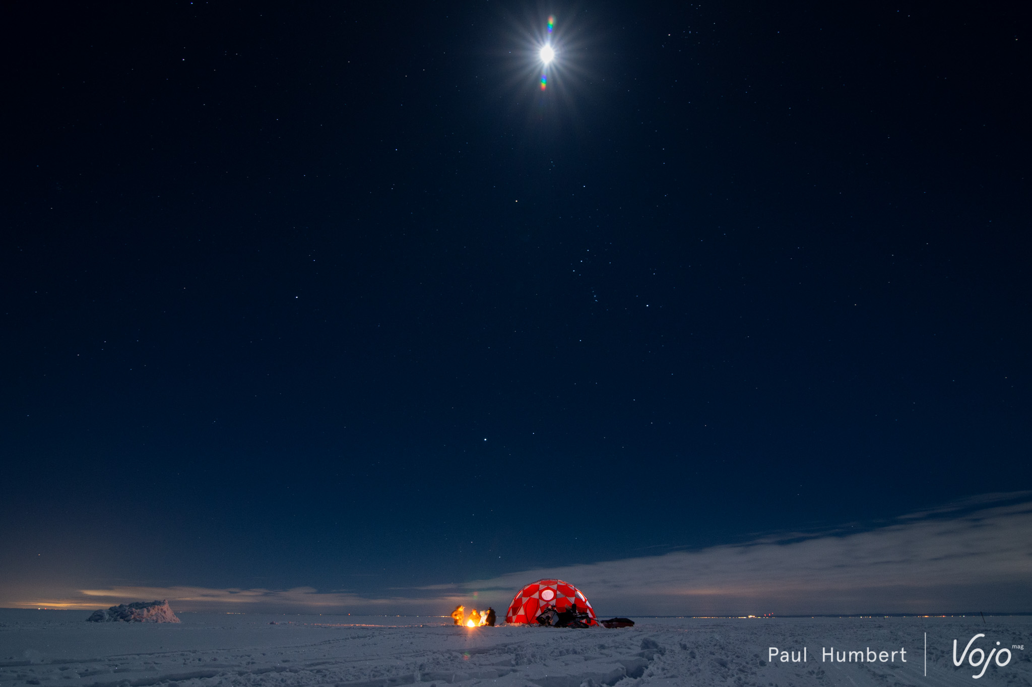 Un repas (bien mérité) rapidement avalé, on grimpe sur des motoneiges en direction du kilomètre 16. Etrangement, tout va plus vite et on pose un pied devant la tente d’expédition montée par Hugues et Pierrot pendant notre traversée. On découvre notre maison pour la nuit dans un mélange d’excitation, d’émerveillement et d’appréhension. Le soleil se couche sur le lac, et on le contemple devant une des crevasses (refermées depuis) qui témoignent de l’aspect « vivant » du lac et de sa glace.