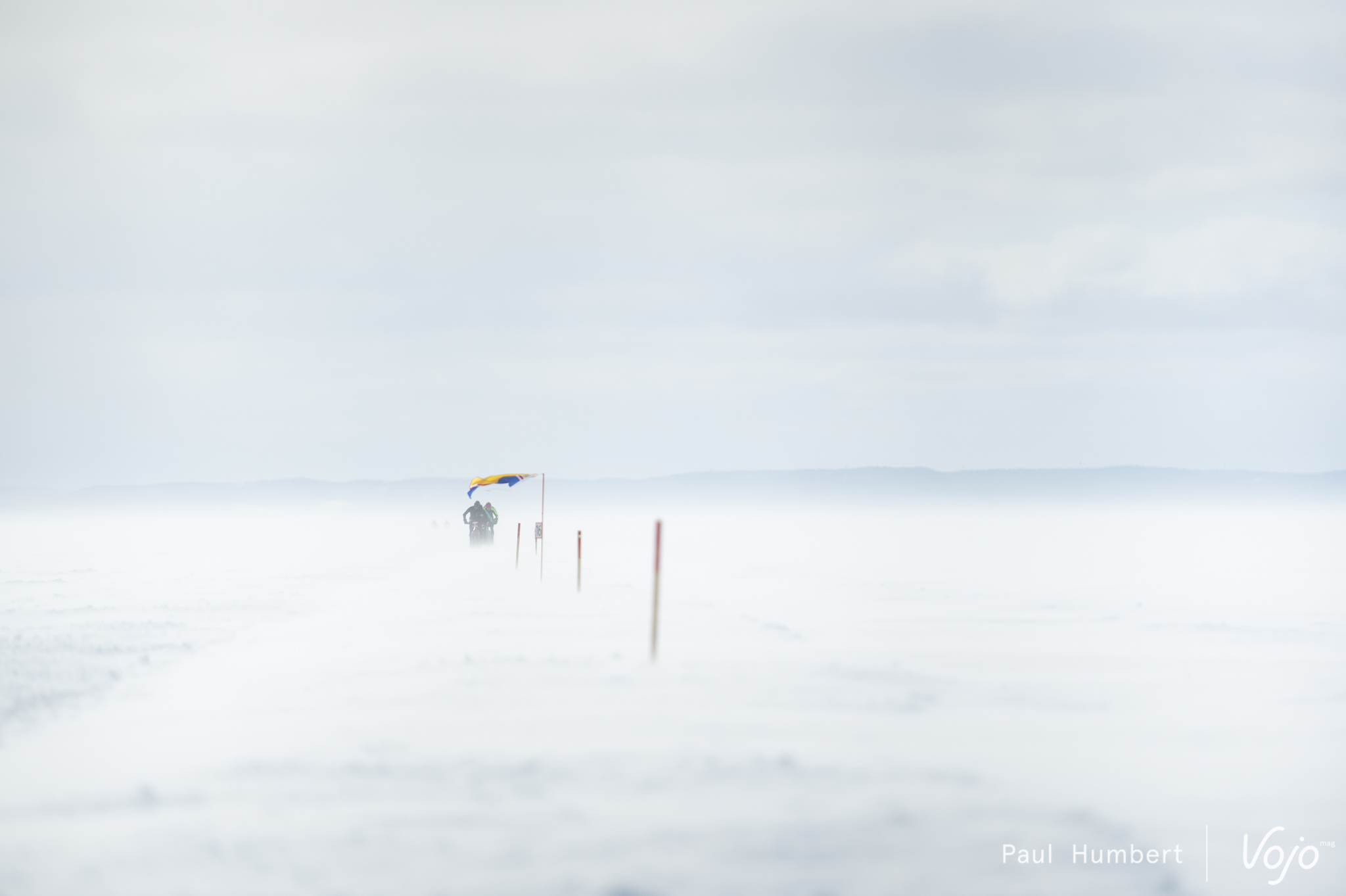 On voit défiler (mais c’est un bien grand mot) les kilomètres. Un drapeau est planté tous les kilomètres et ils sont séparés par des piquets qui permettent de suivre la trace sur le lac en cas de tempête. Les organisateurs ont bien en tête une des précédentes éditions où la majorité des participants ont dû être évacués en raison du mauvais temps.