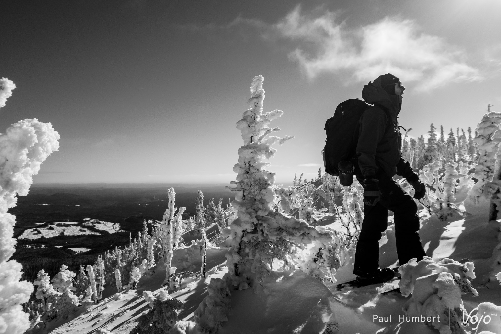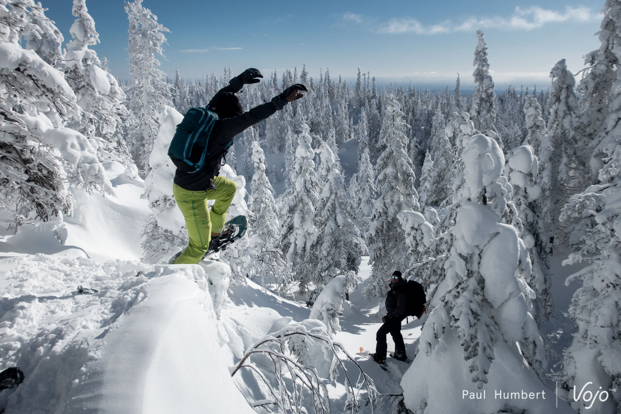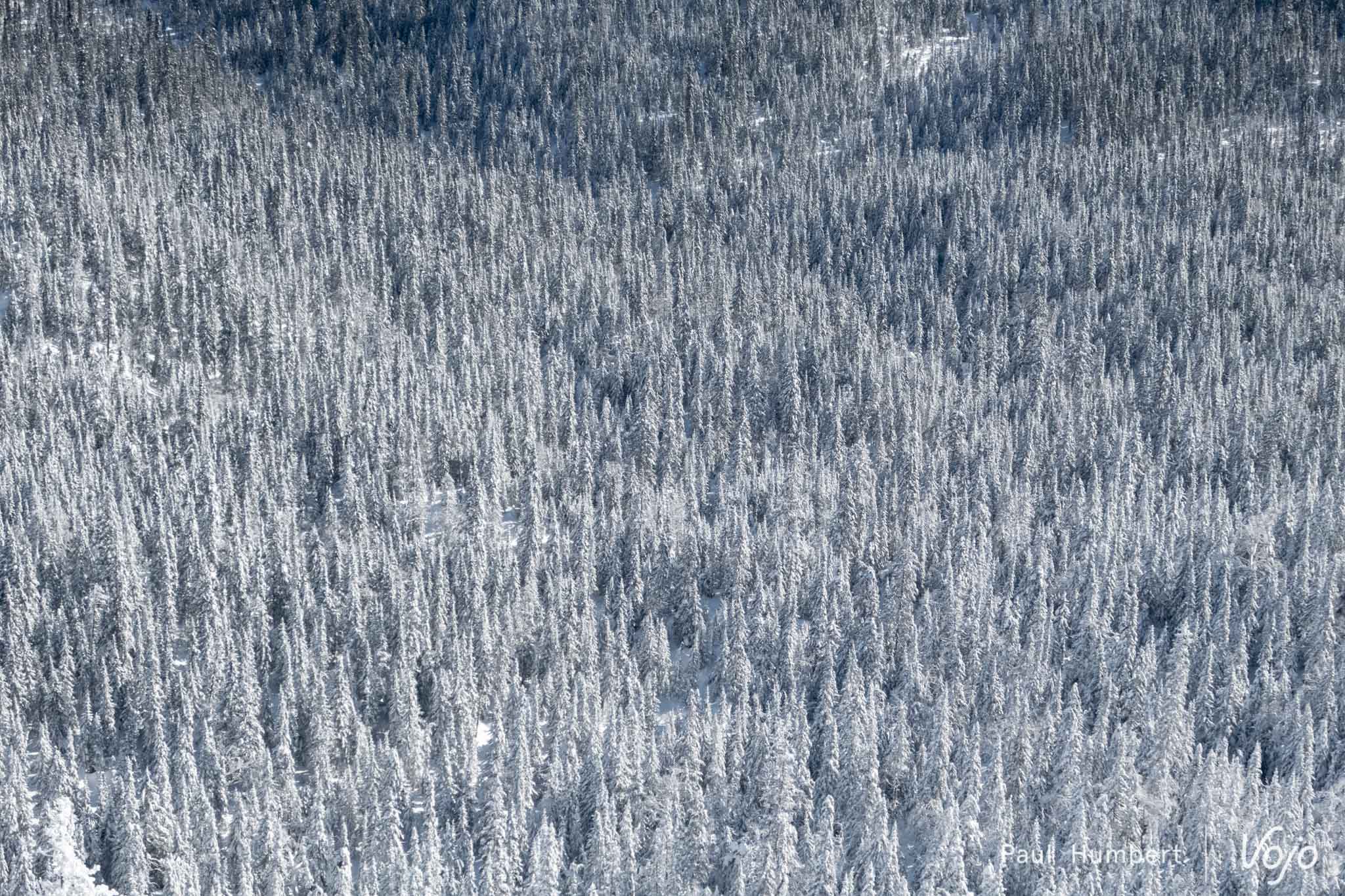 Ces épinettes (epicéa dans nos contrées) se courbent sous le poids de la neige et du gel pour former ces surprenantes silhouettes. Dans une atmosphère glaciale malgré un grand soleil, notre petit groupe prend conscience du froid, le vrai ! On frise les -30 degrés et on gèle du bout des cheveux aux poils de nez. Un saut dans la poudreuse plus tard et une rencontre avec les autres promeneurs et nous voilà dans le bain !