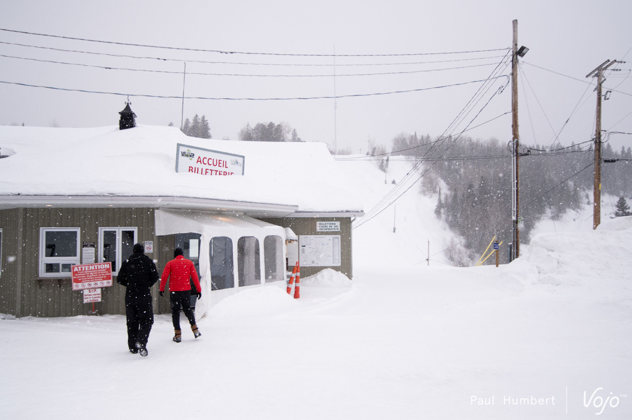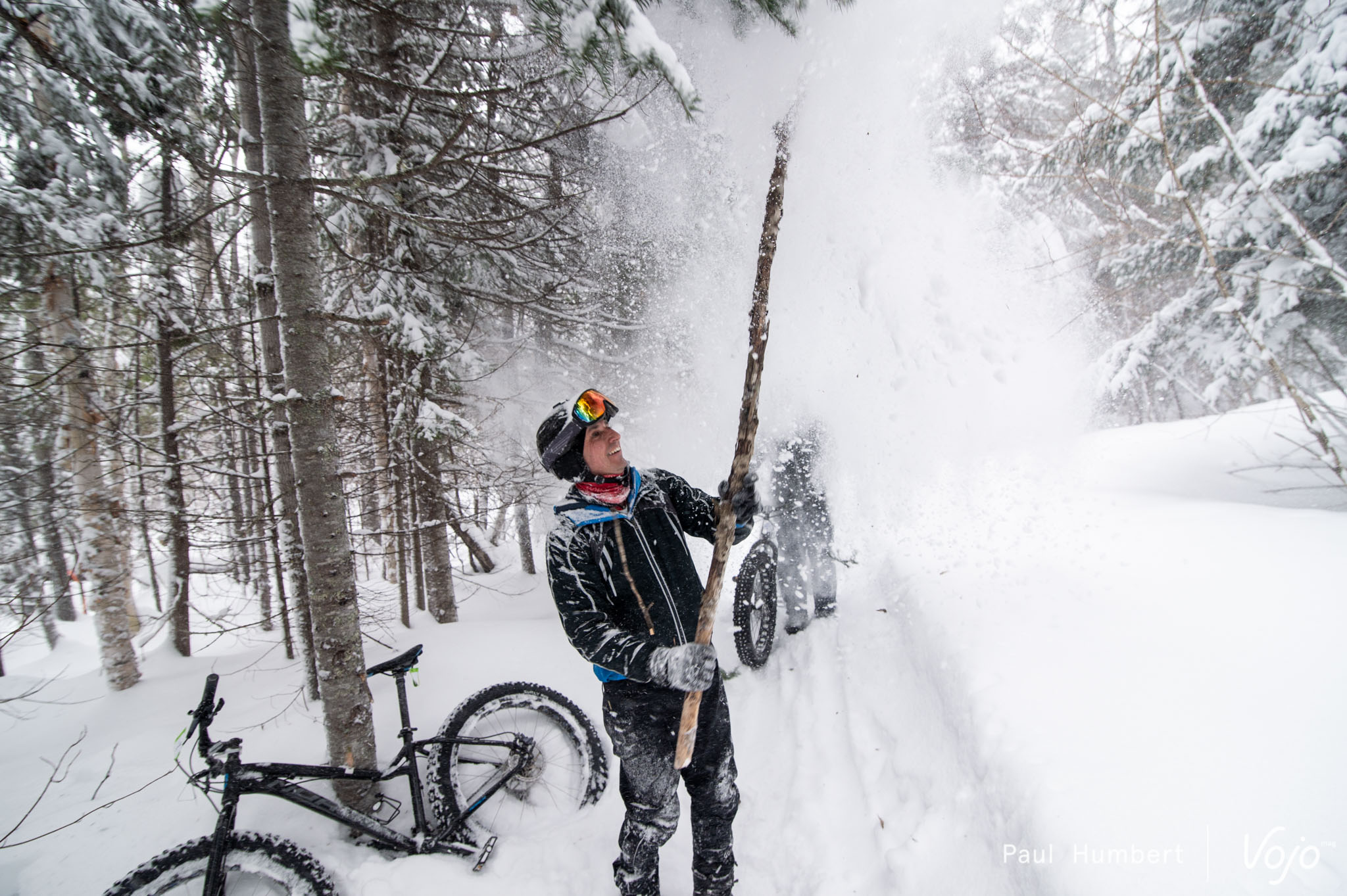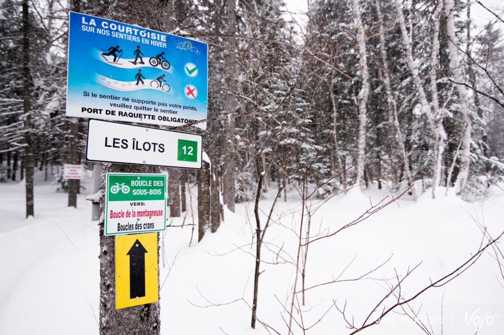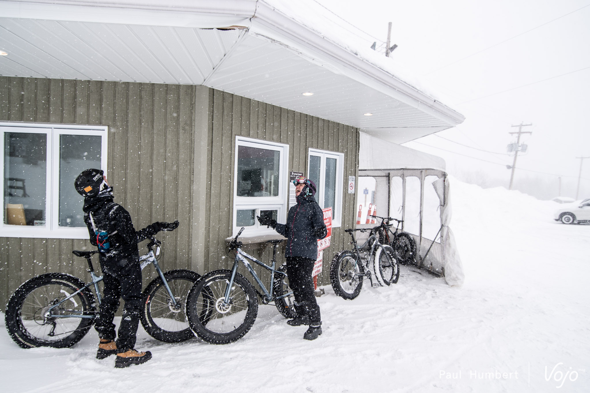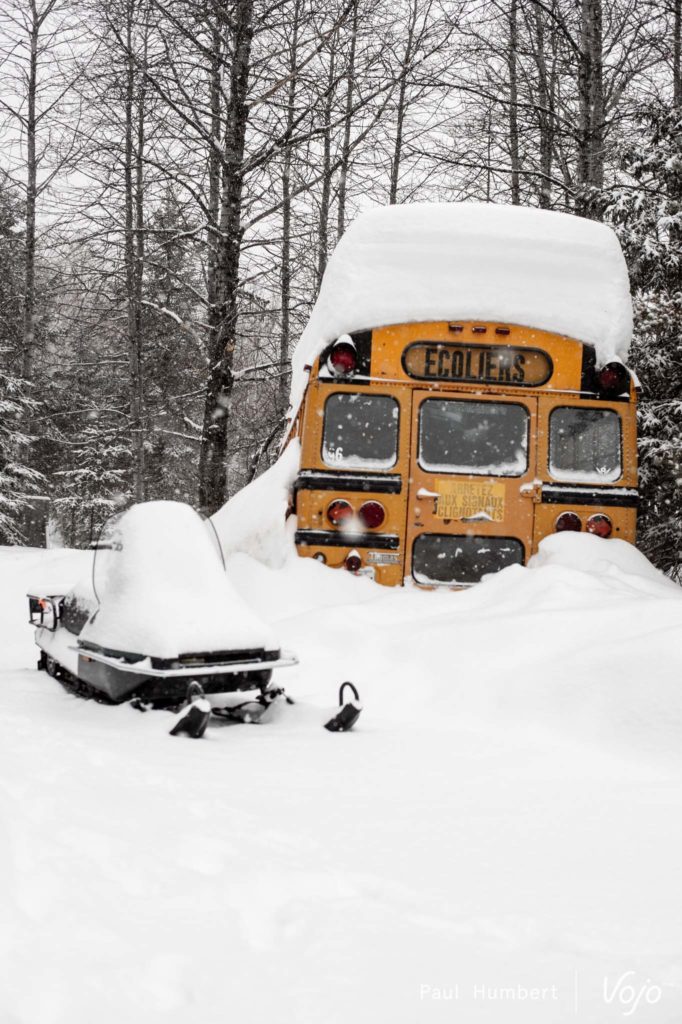 Après une petite excursion sur le lac, vient le temps d’une véritable sortie en fatbike afin d’en découvrir le plein potentiel. Petit bémol dans cette affaire : le Québec est en pleine tempête, certaines écoles et routes sont fermées, et cela n’est pas vraiment inhabituel pour cette région qui compose avec des mètres de neige pendant des mois. Notre équipe de guides expérimentés, des pneus clous et quelques poussées à l’arrière de notre van, et nous voilà partis en direction du Tobo Ski !
