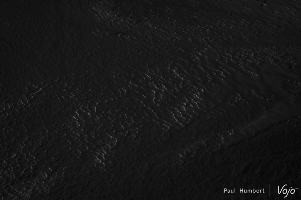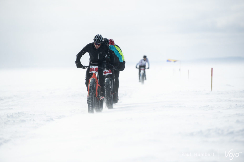 Le vent vient soulever la neige du lac et ce ne sont que des silhouettes qu’on distingue au loin. Le rythme est impressionnant vu les conditions et on dirait un jeu d’enfants.