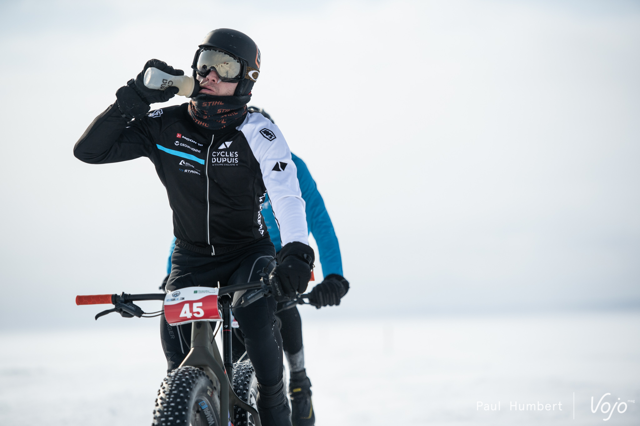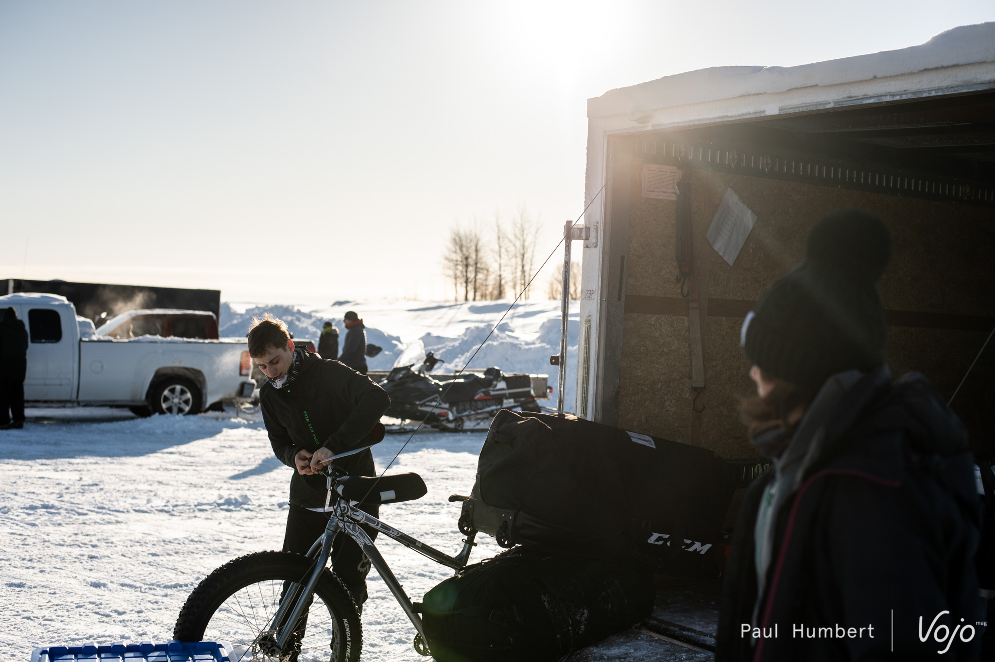 Pendant que Rémi, le gagnant, gambade en tête de notre groupe sur son Rocky Mountain, David nous présente la course dans ses grandes lignes : son point de départ, la logistique qui l’entoure et ce à quoi nous devrons nous attendre. Ce Belge a adopté le Québec comme le Québec l’a adopté. Il s’occupe désormais de la « Véloroute des Bleuets », cet itinéraire cyclable qui encercle le lac en été. Quand vient l’hiver, le temps est au fatbike et à la Traversée du Lac Saint-Jean.