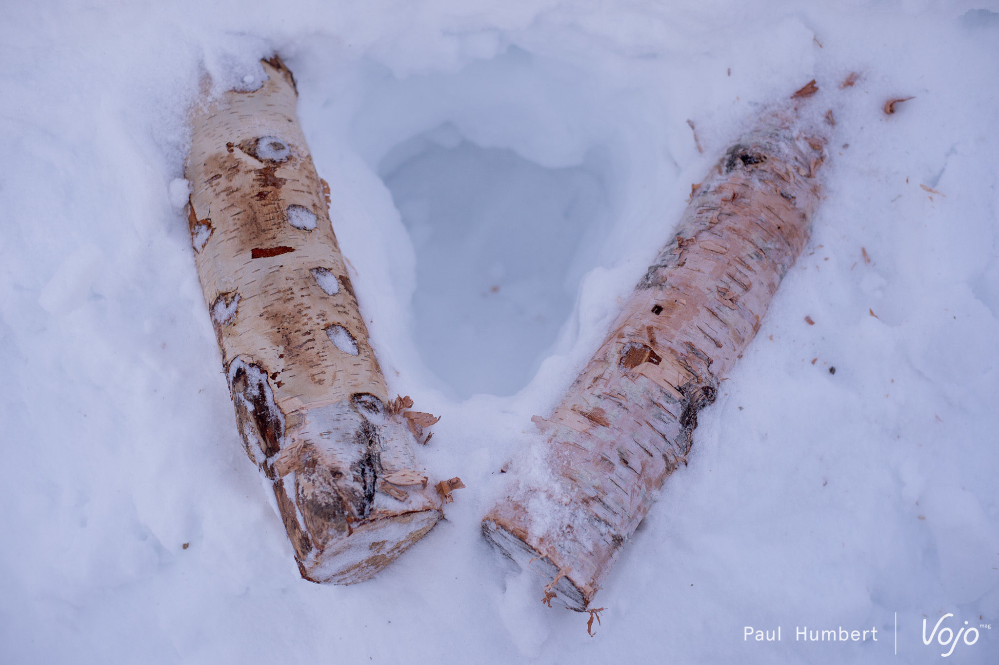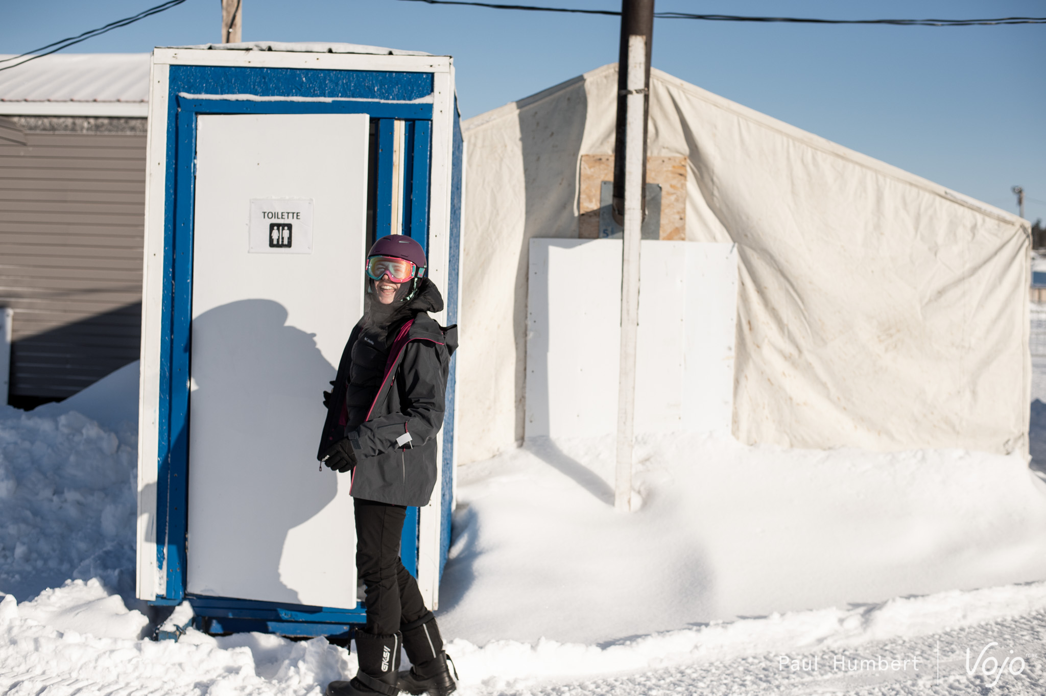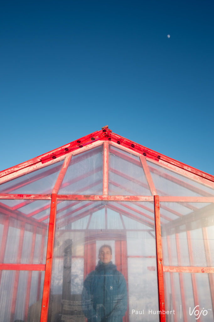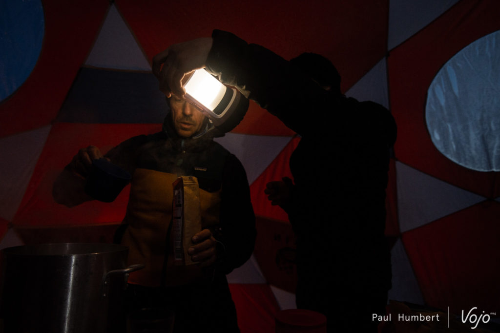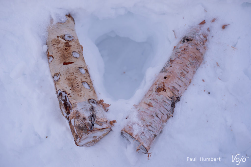 Pendant que notre appareil photo se réchauffe à coups de déclenchements, le reste de l’équipe est à pied d’oeuvre pour construire nos toilettes pour le campement : une autre bonne manière de se réchauffer !