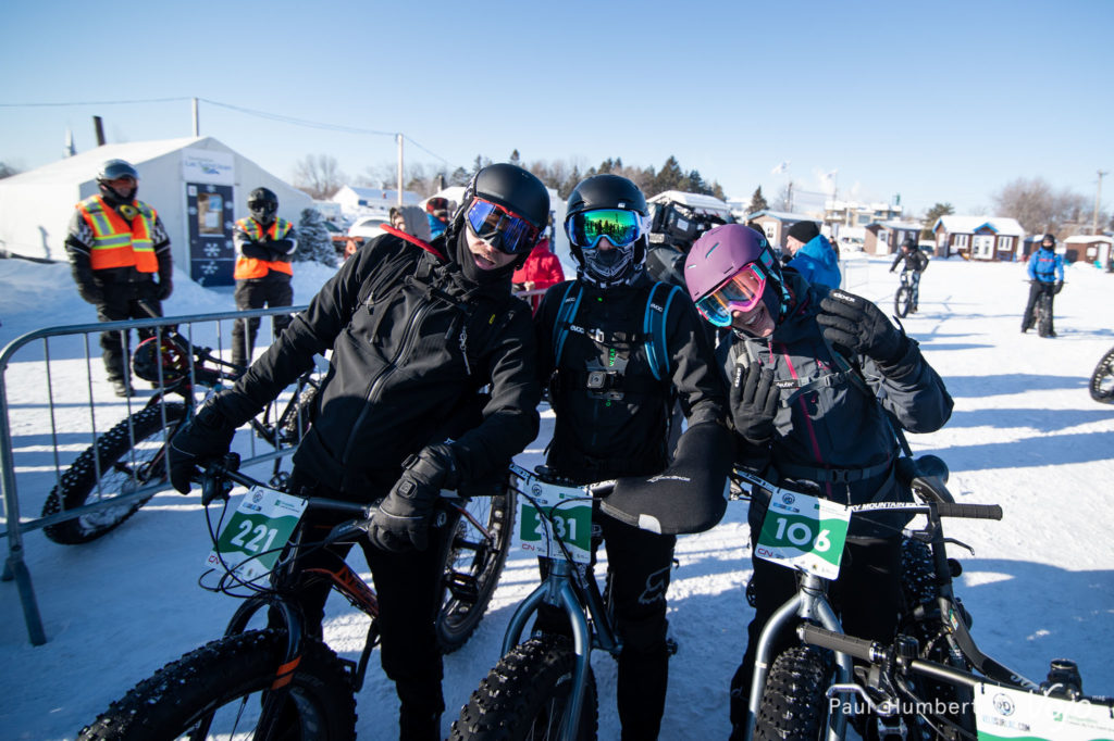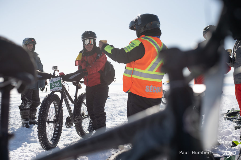 L’arche des 32 kilomètres est en vue, on pousse encore plus fort sur nos pédales mais le paysage ne défile pas plus vite pour autant. Après près de 4 heures d’effort pour votre serviteur, les 32 kilomètres sont bouclés et on retrouve un sympathique comité d’accueil qui a su nous soutenir à motoneige pendant la traversée : les organisateurs, nos guides Hugues et Pierrot, et Nelson notre secouriste et guide de Fatbike !
