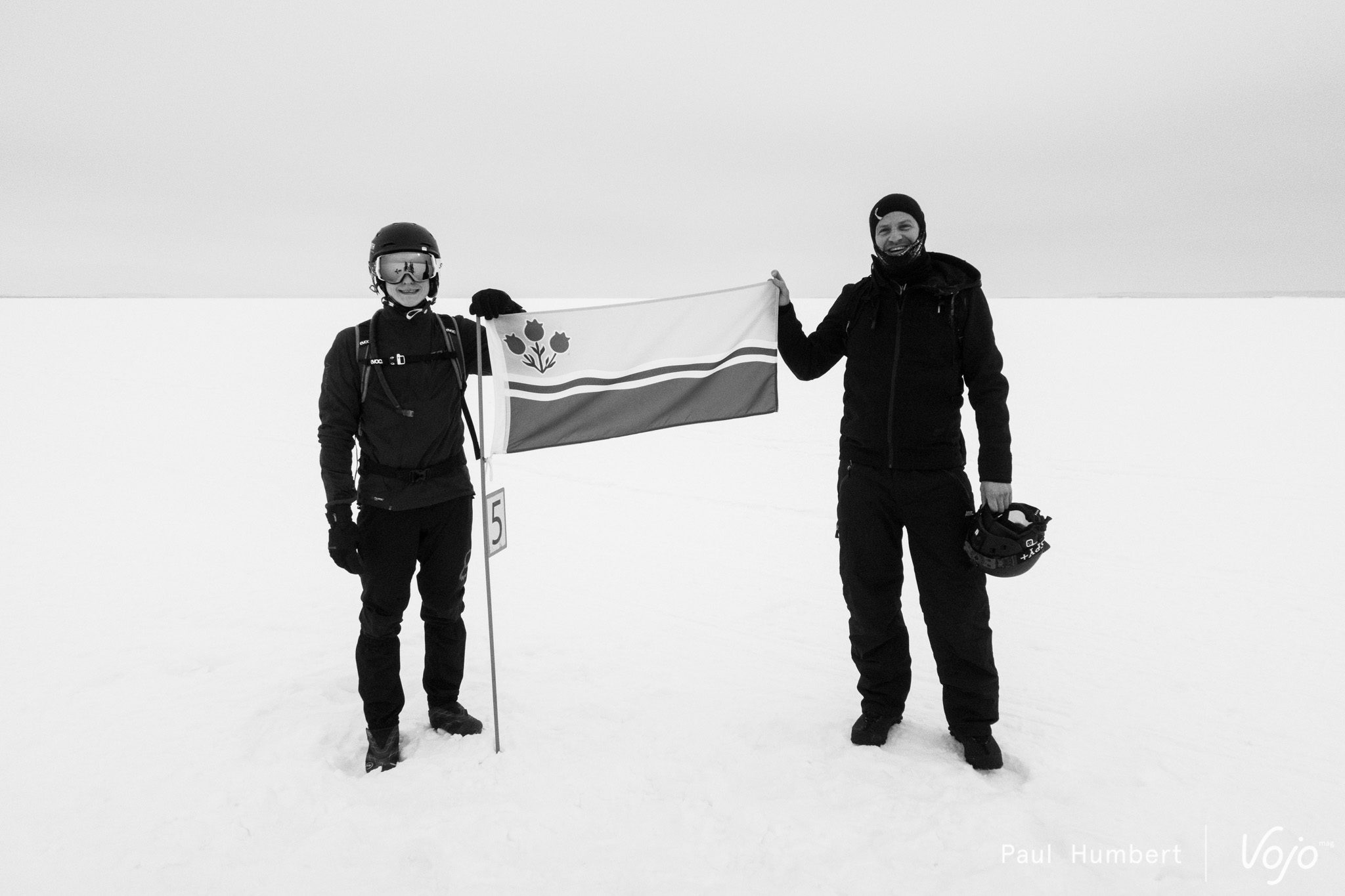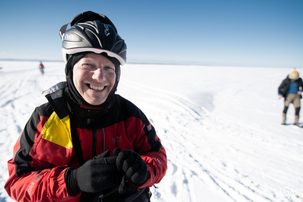 On voit défiler (mais c’est un bien grand mot) les kilomètres. Un drapeau est planté tous les kilomètres et ils sont séparés par des piquets qui permettent de suivre la trace sur le lac en cas de tempête. Les organisateurs ont bien en tête une des précédentes éditions où la majorité des participants ont dû être évacués en raison du mauvais temps.