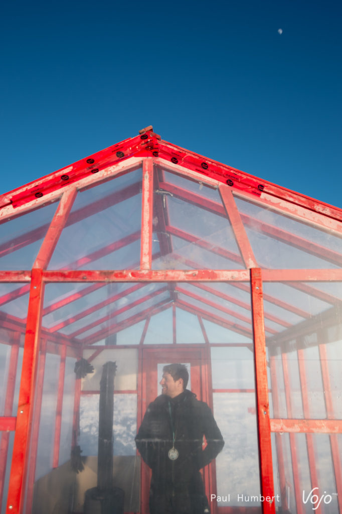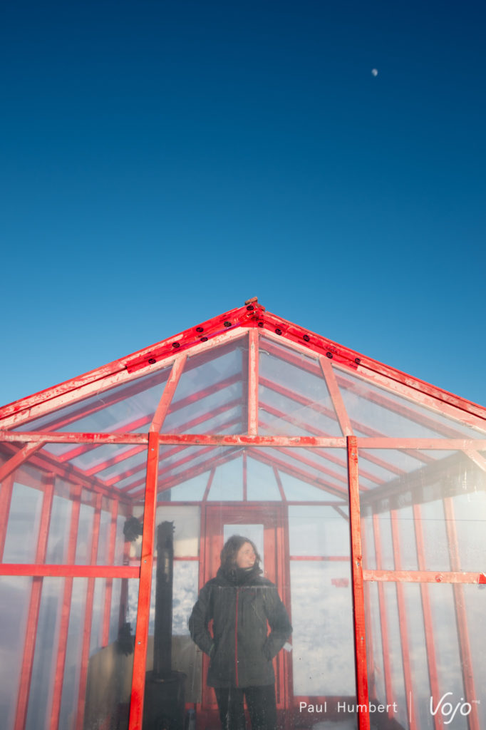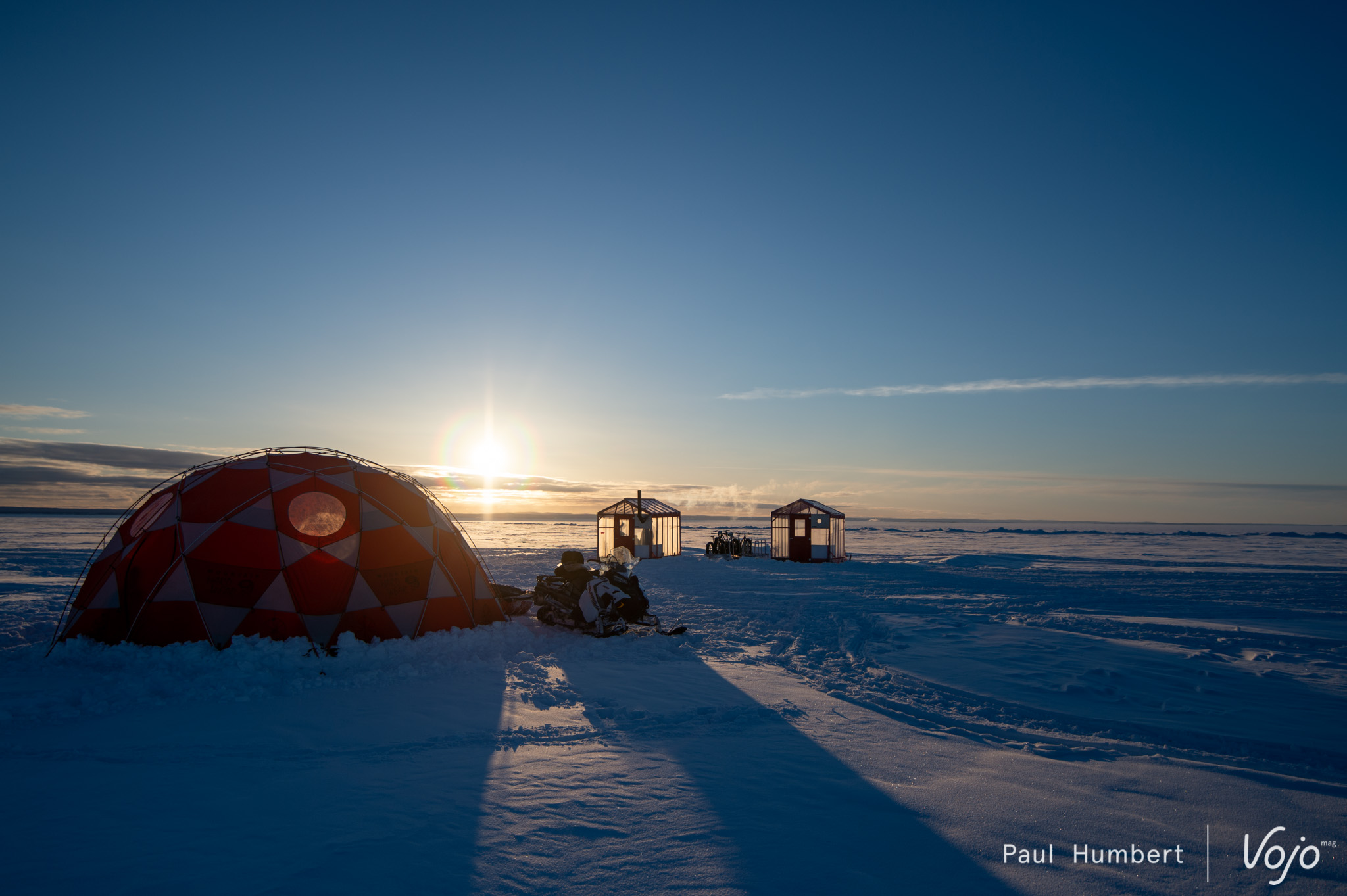 Un repas (bien mérité) rapidement avalé, on grimpe sur des motoneiges en direction du kilomètre 16. Etrangement, tout va plus vite et on pose un pied devant la tente d’expédition montée par Hugues et Pierrot pendant notre traversée. On découvre notre maison pour la nuit dans un mélange d’excitation, d’émerveillement et d’appréhension. Le soleil se couche sur le lac, et on le contemple devant une des crevasses (refermées depuis) qui témoignent de l’aspect « vivant » du lac et de sa glace.