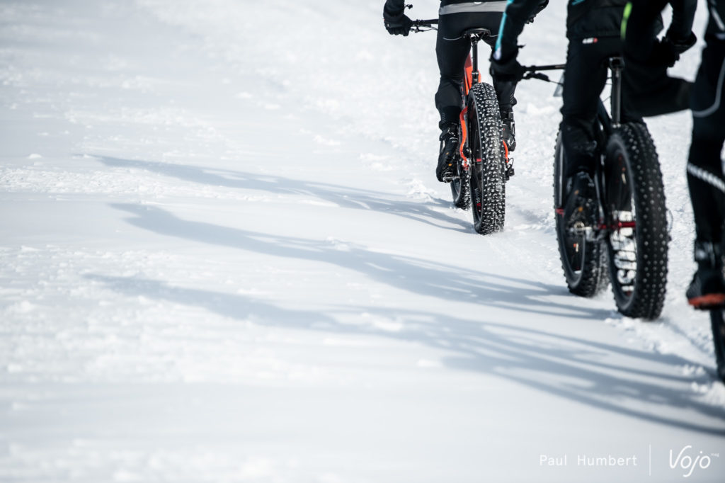 Sur la neige, on s’habitue à nos vélos et aux sensations nouvelles que procurent les fatbikes. Le rendement est bon, mais attention à ne pas sortir de la trace, sous peine de s’enfoncer et de s’arrêter net. On prend conscience de l’effet du vent sur notre peau comme sur notre matériel. Une bonne heure passée sur le lac et Pierre, Gaëlle et Rémi ont le sourire.