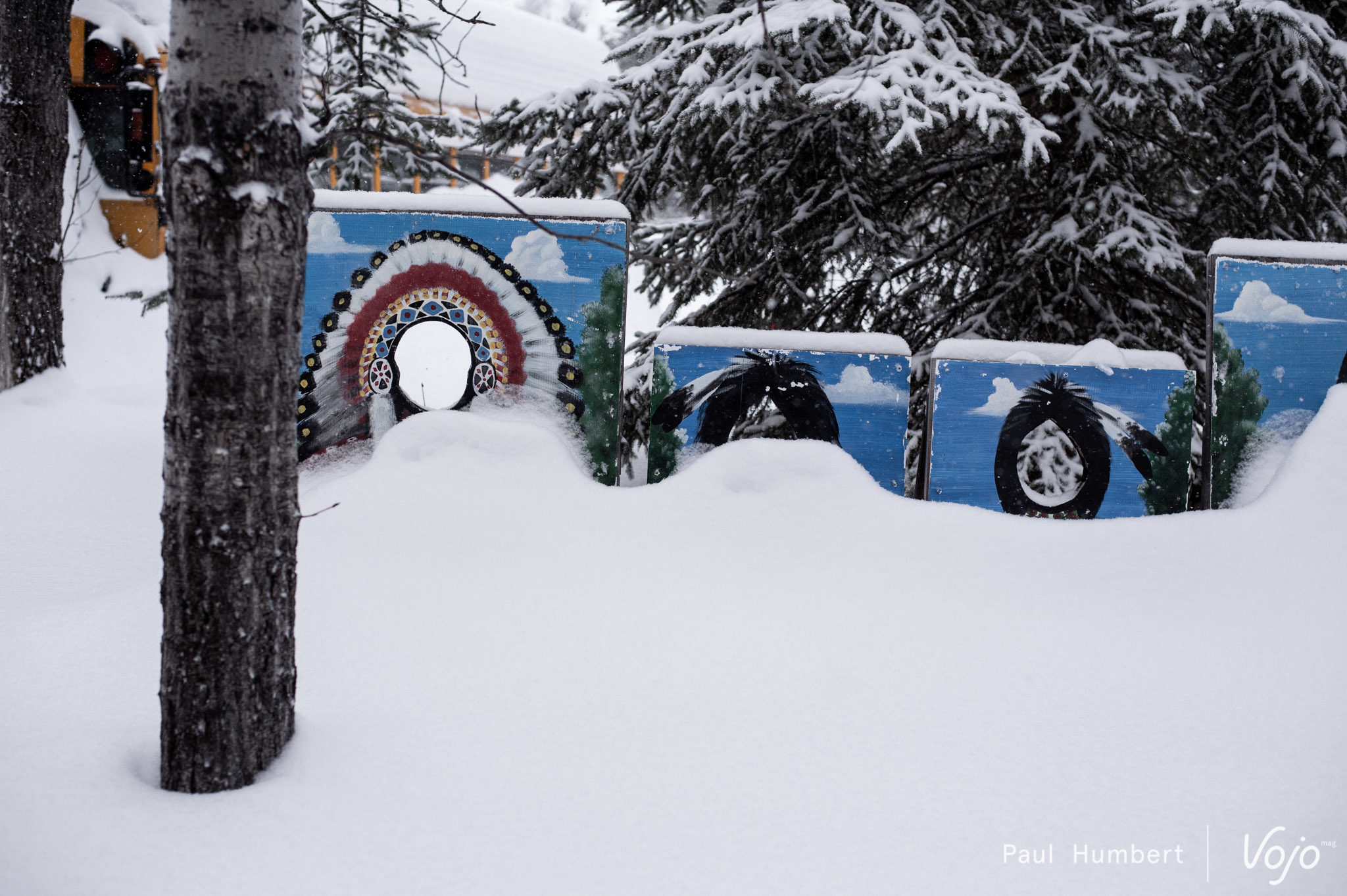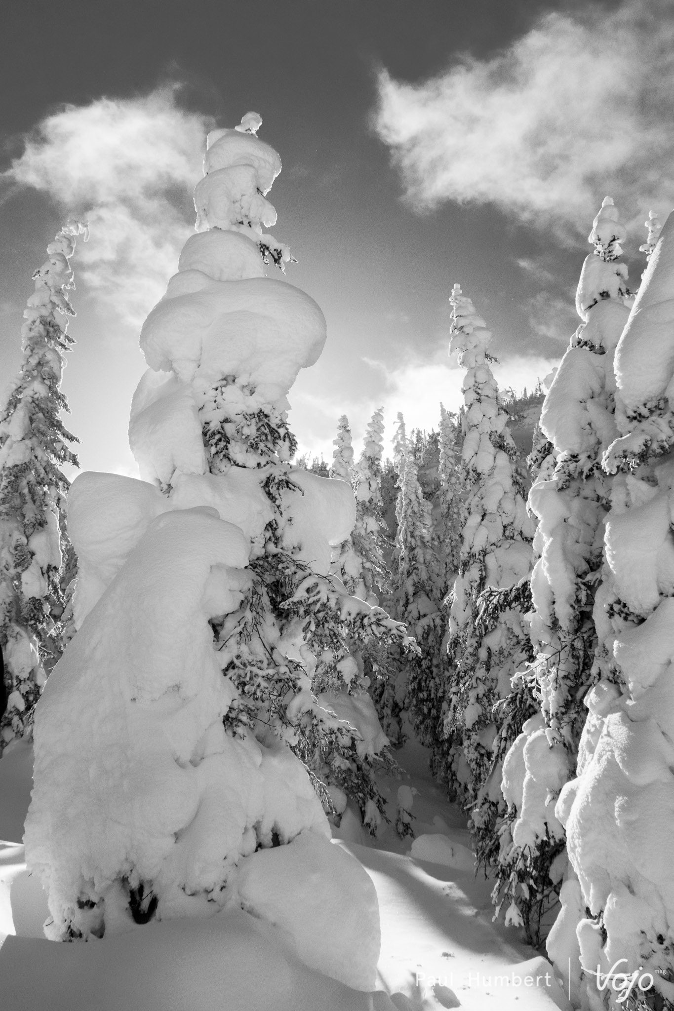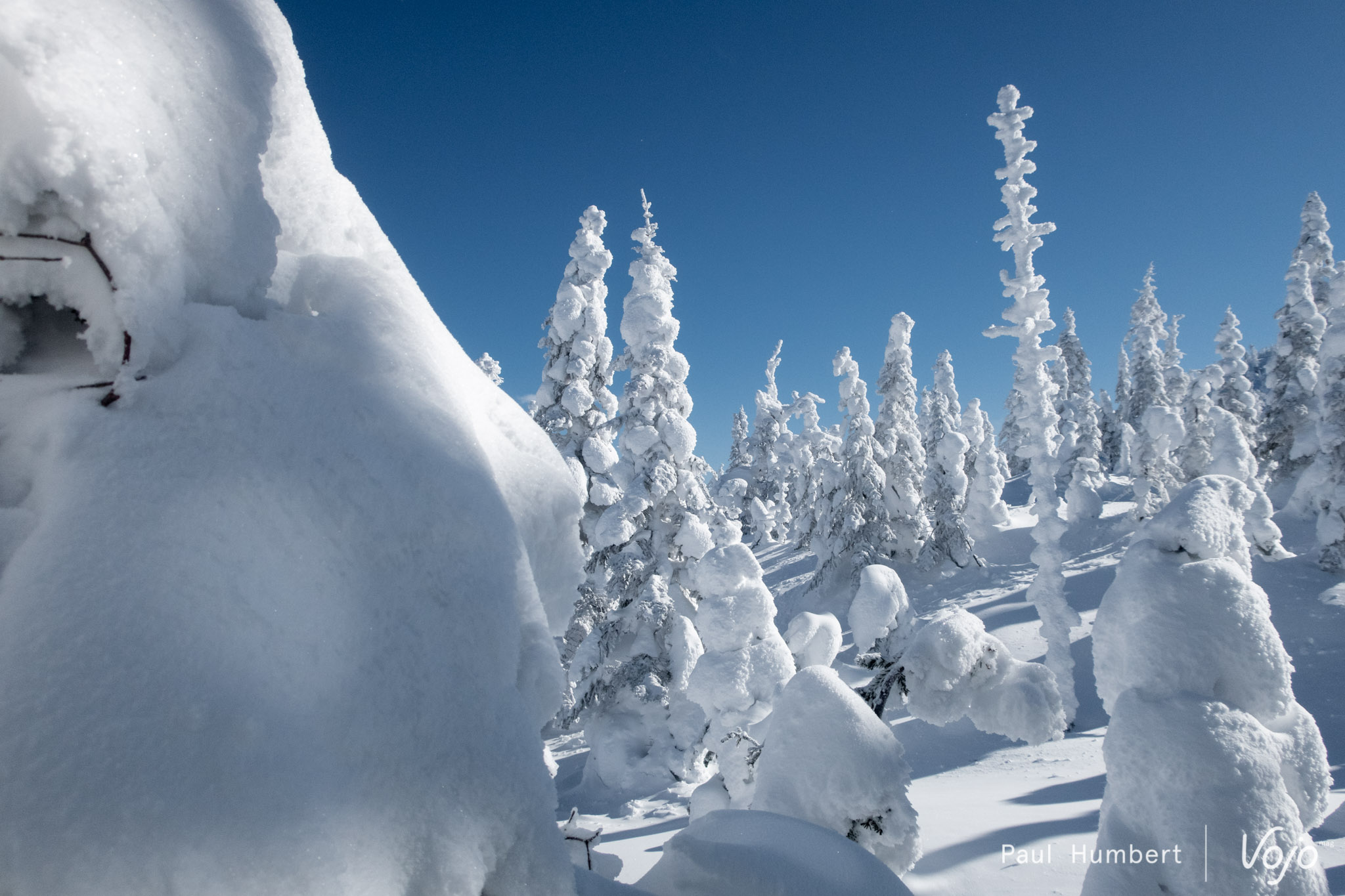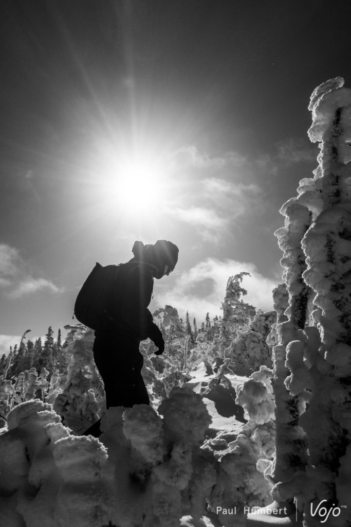 Ces épinettes (epicéa dans nos contrées) se courbent sous le poids de la neige et du gel pour former ces surprenantes silhouettes. Dans une atmosphère glaciale malgré un grand soleil, notre petit groupe prend conscience du froid, le vrai ! On frise les -30 degrés et on gèle du bout des cheveux aux poils de nez. Un saut dans la poudreuse plus tard et une rencontre avec les autres promeneurs et nous voilà dans le bain !