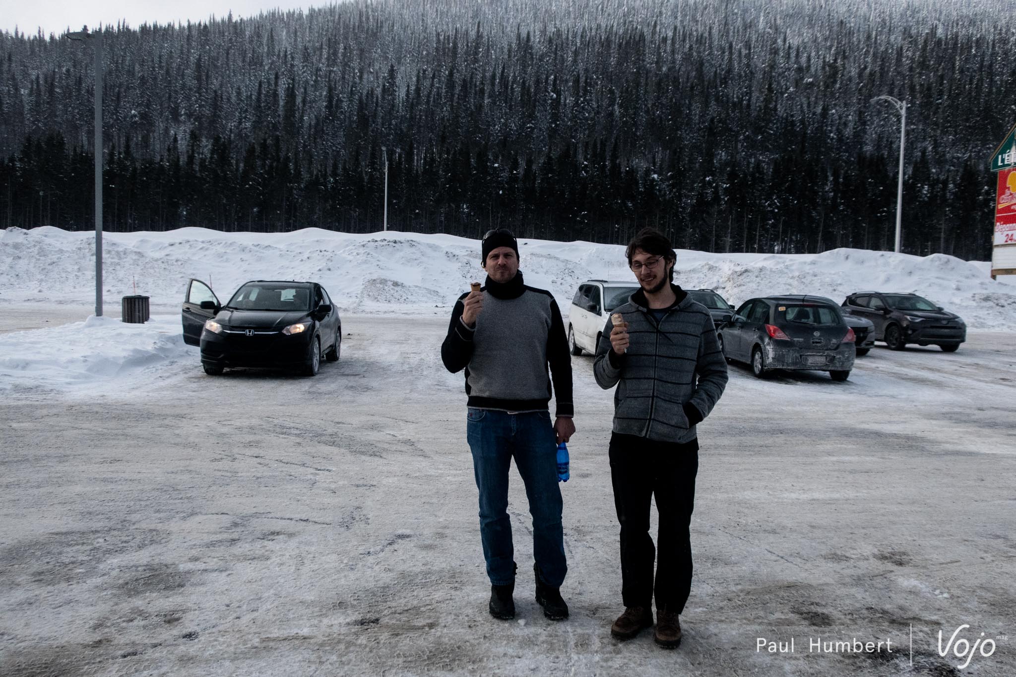 Pour nous, le Québec est une découverte. Outre la relative proximité avec les Etats-Unis, l’aspect francophone et le reportage d’Olivier à l’automne dernier ( à retrouver ici : dev.vojomag.com/decouverte-couleurs-dautomne-au-quebec-1-st-raymond-et-shannahan ), c’est une découverte. On plonge donc vers l’inconnu, mais bien accompagnés ! D’ailleurs, pour se mettre dans l’ambiance, Pierre suit les conseils de Pierrot et opte pour une petite glace pendant la première pause sur le chemin du lac !