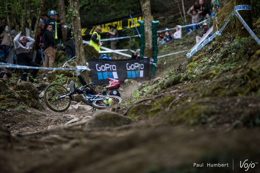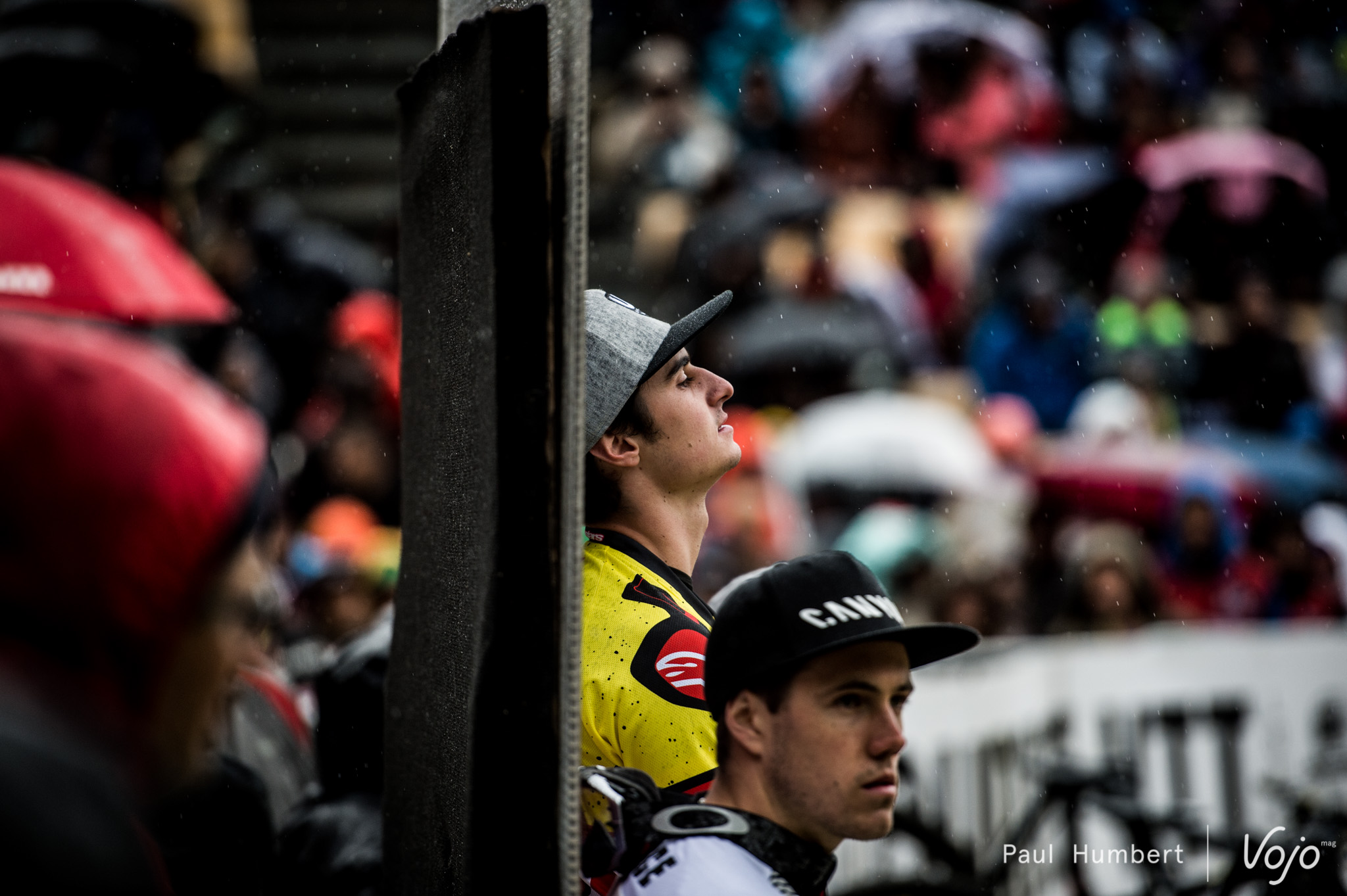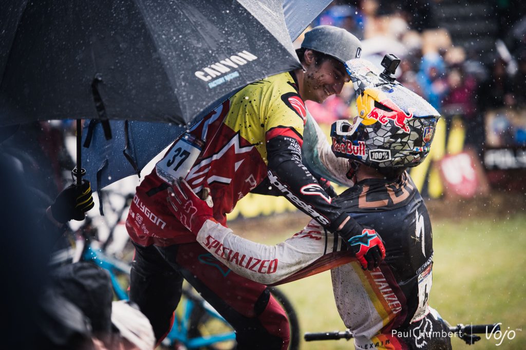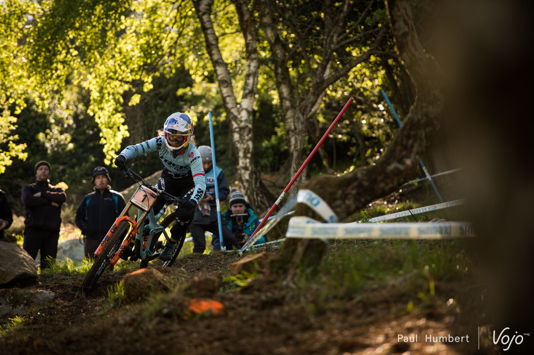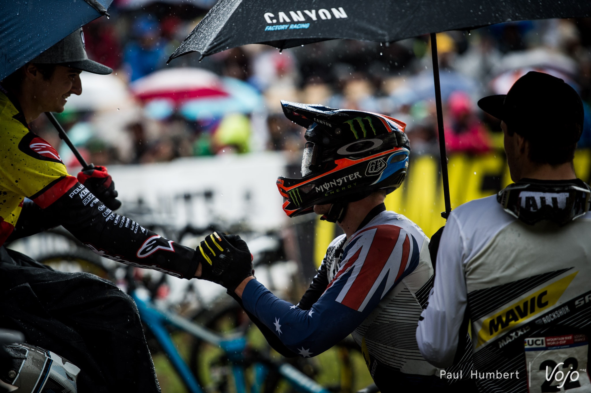 Tous les pilotes se cassent les dents sur le chrono et on comprend que plus personne ne pourra la détrôner quand des pilotes comme Danny Hart ou Rémi Thirion se voient relégués à 15 secondes dès le premier chrono intermédiaire. Aaron Gwin paie lui aussi les frais de la météo, chute et est disqualifié en remontant sur la piste plus loin qu’à l’endroit où il l’a quittée.