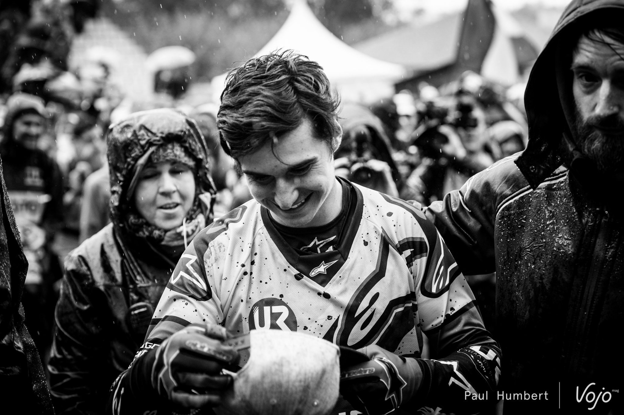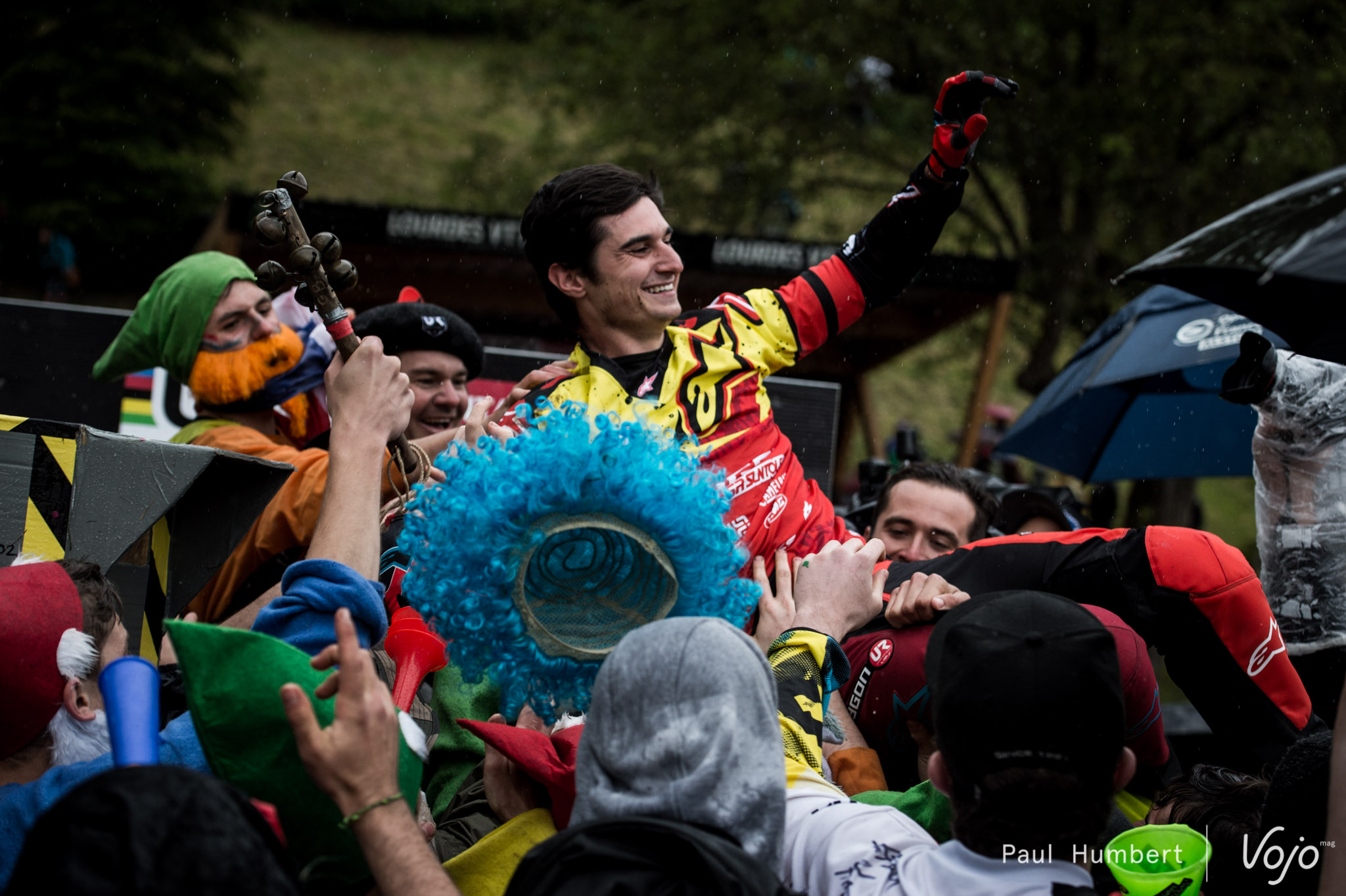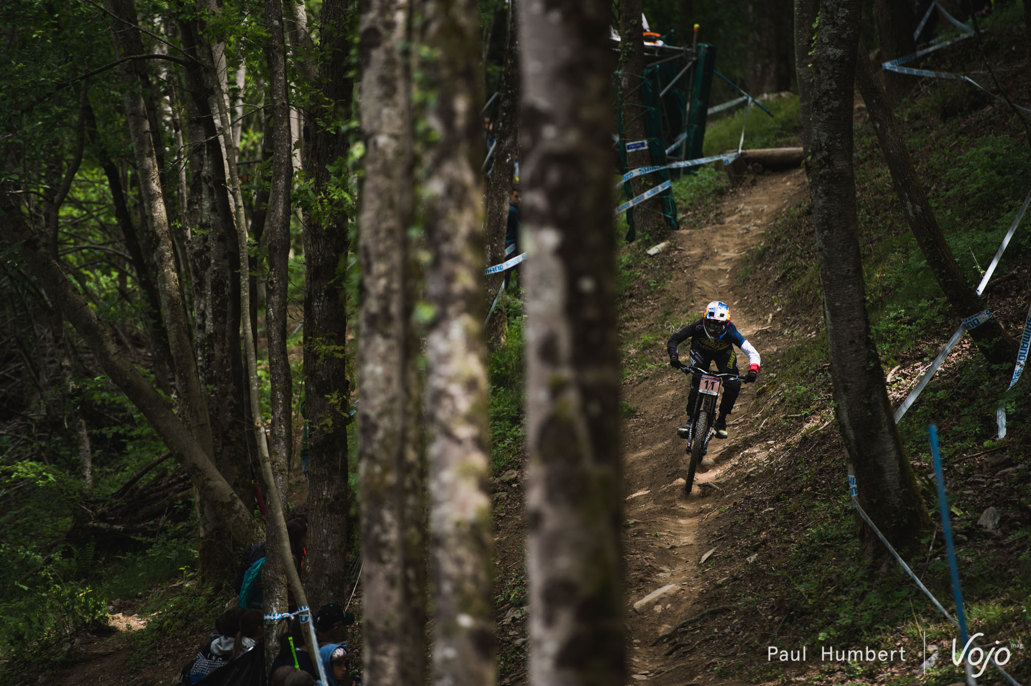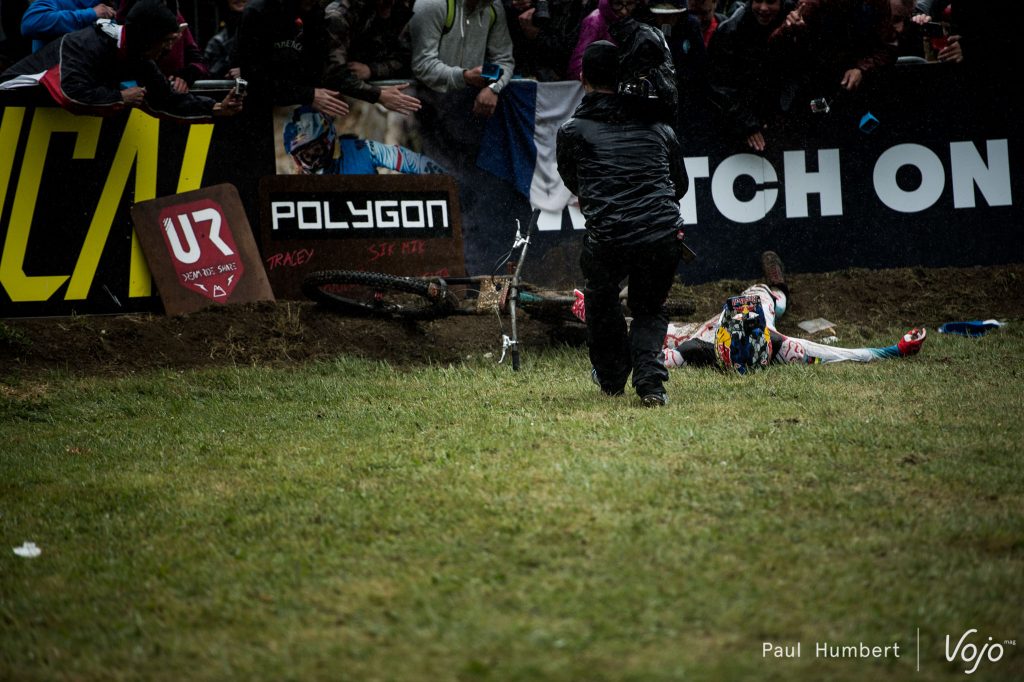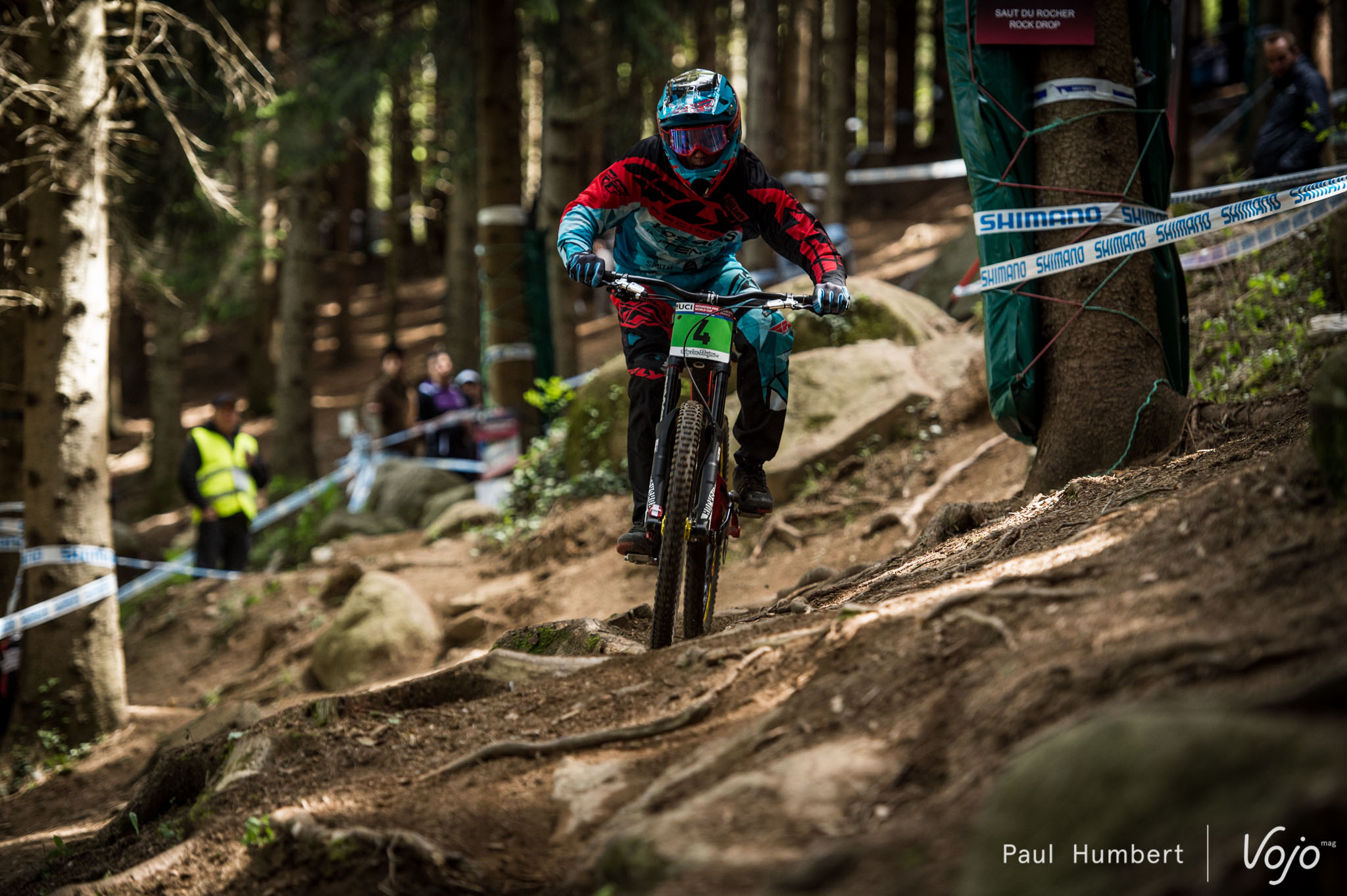 Tous les pilotes se cassent les dents sur le chrono et on comprend que plus personne ne pourra la détrôner quand des pilotes comme Danny Hart ou Rémi Thirion se voient relégués à 15 secondes dès le premier chrono intermédiaire. Aaron Gwin paie lui aussi les frais de la météo, chute et est disqualifié en remontant sur la piste plus loin qu’à l’endroit où il l’a quittée.